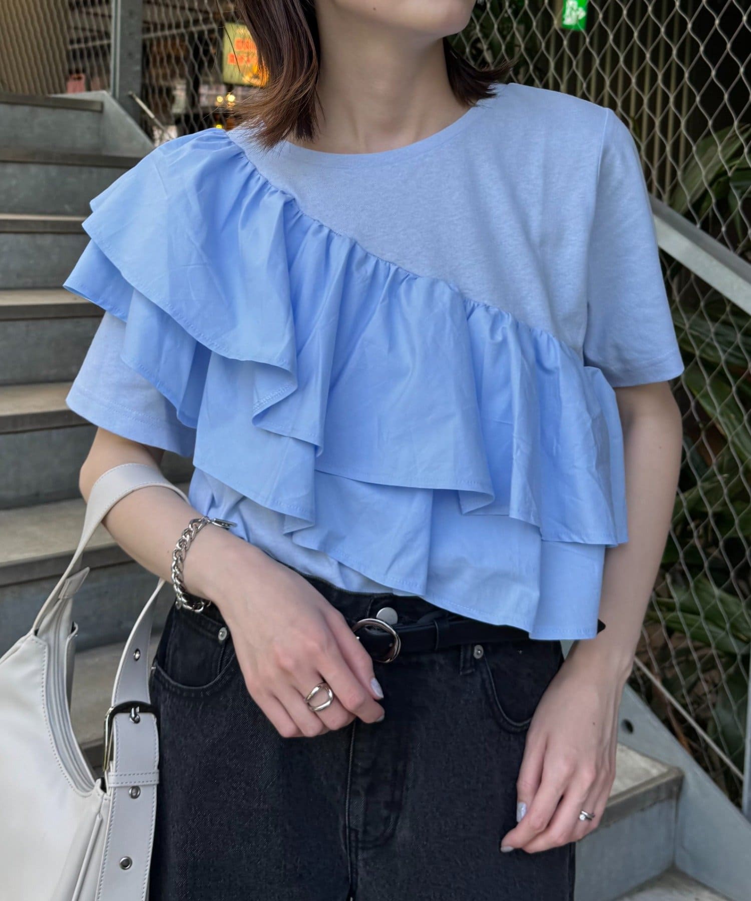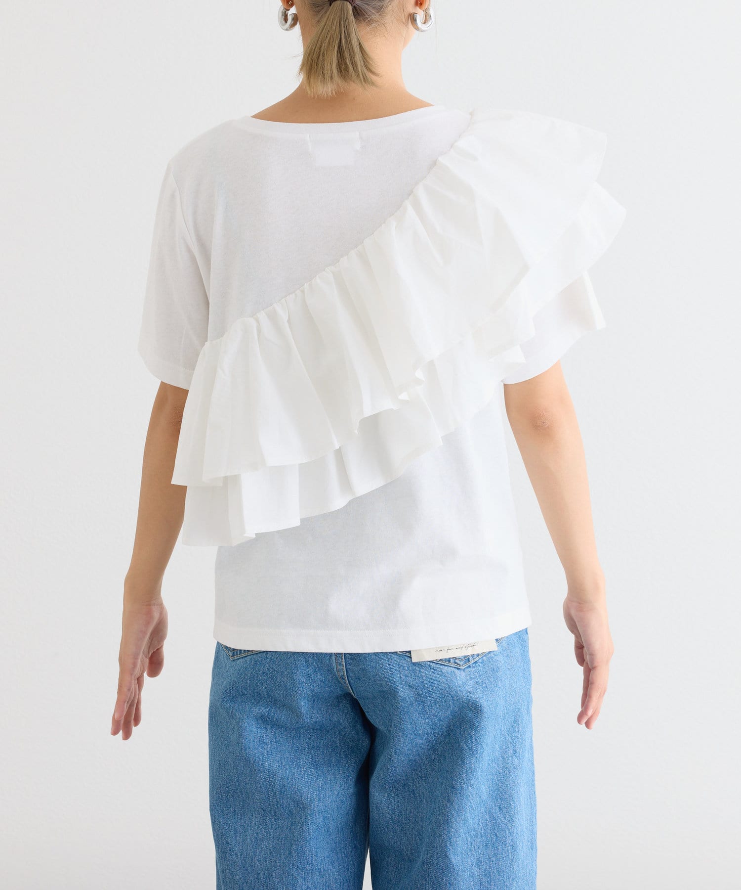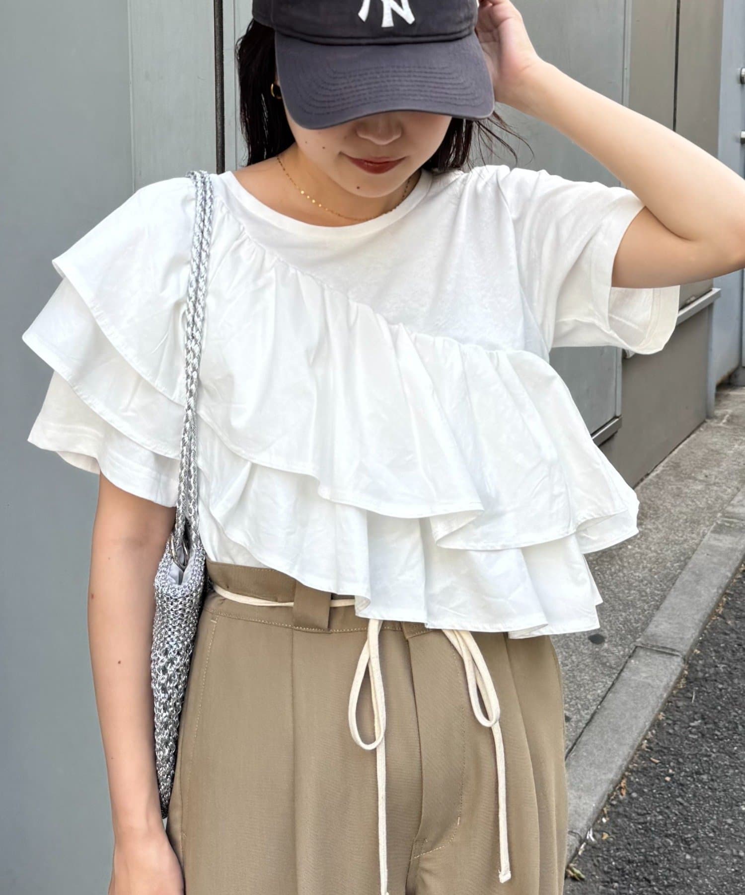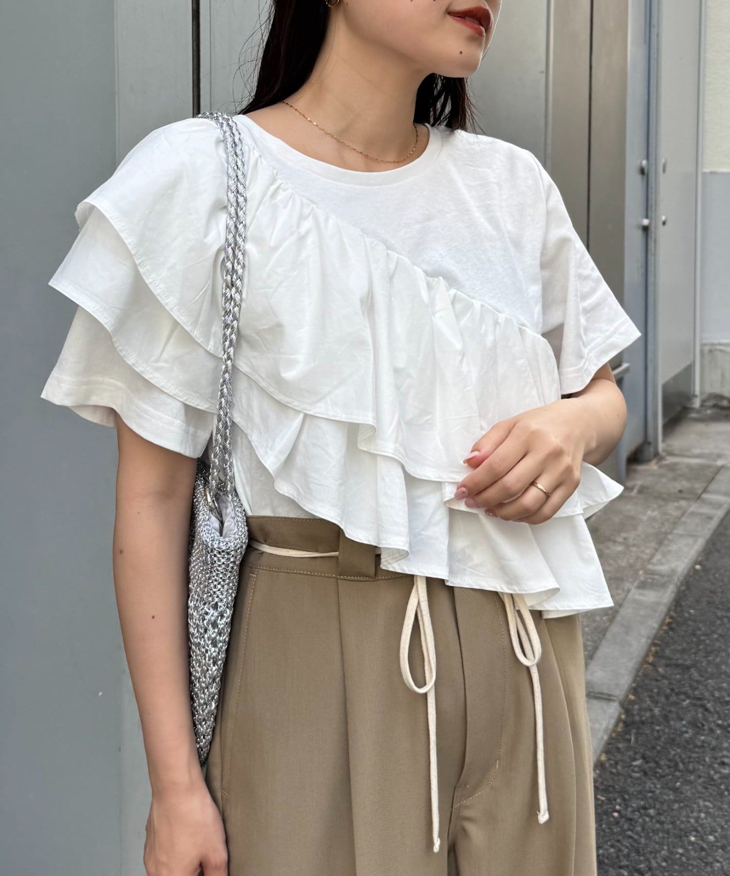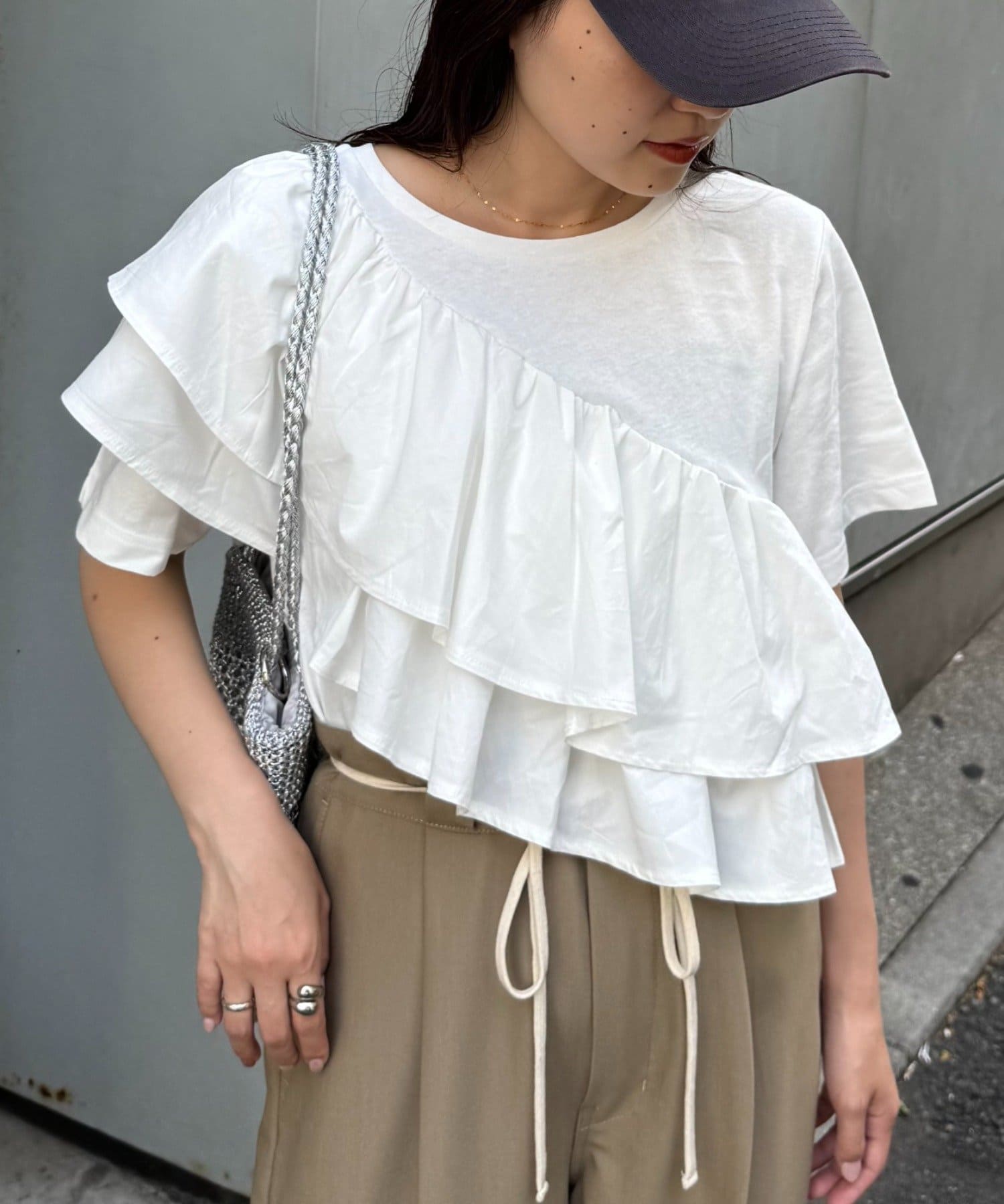 前後にあしらわれたアシンメトリーなフリルで華やかさをプラスしてくれます。