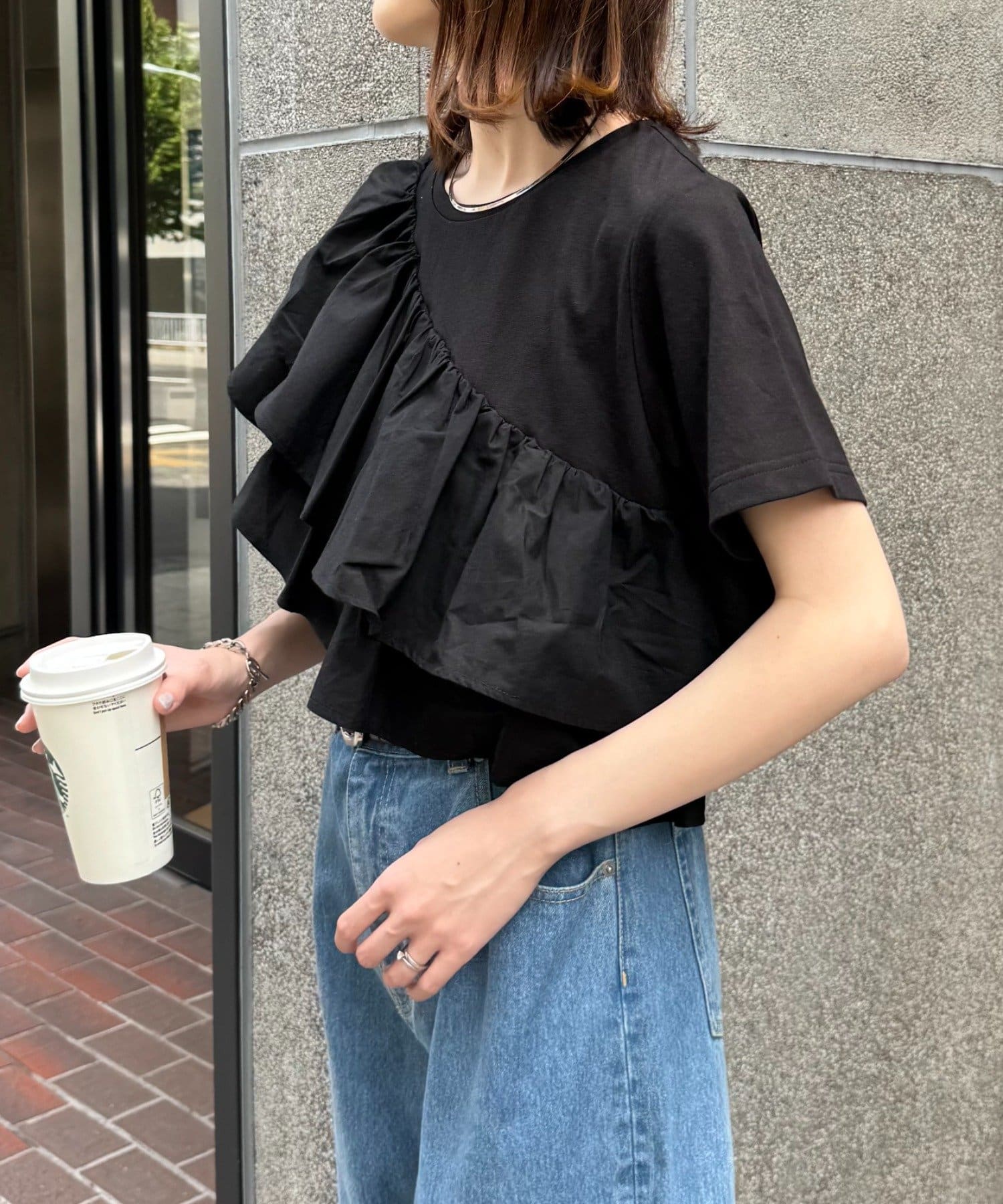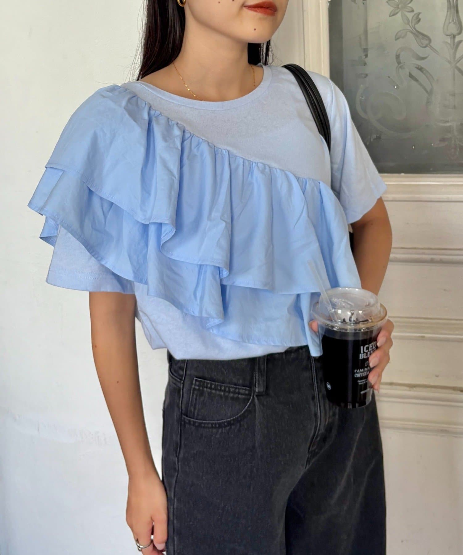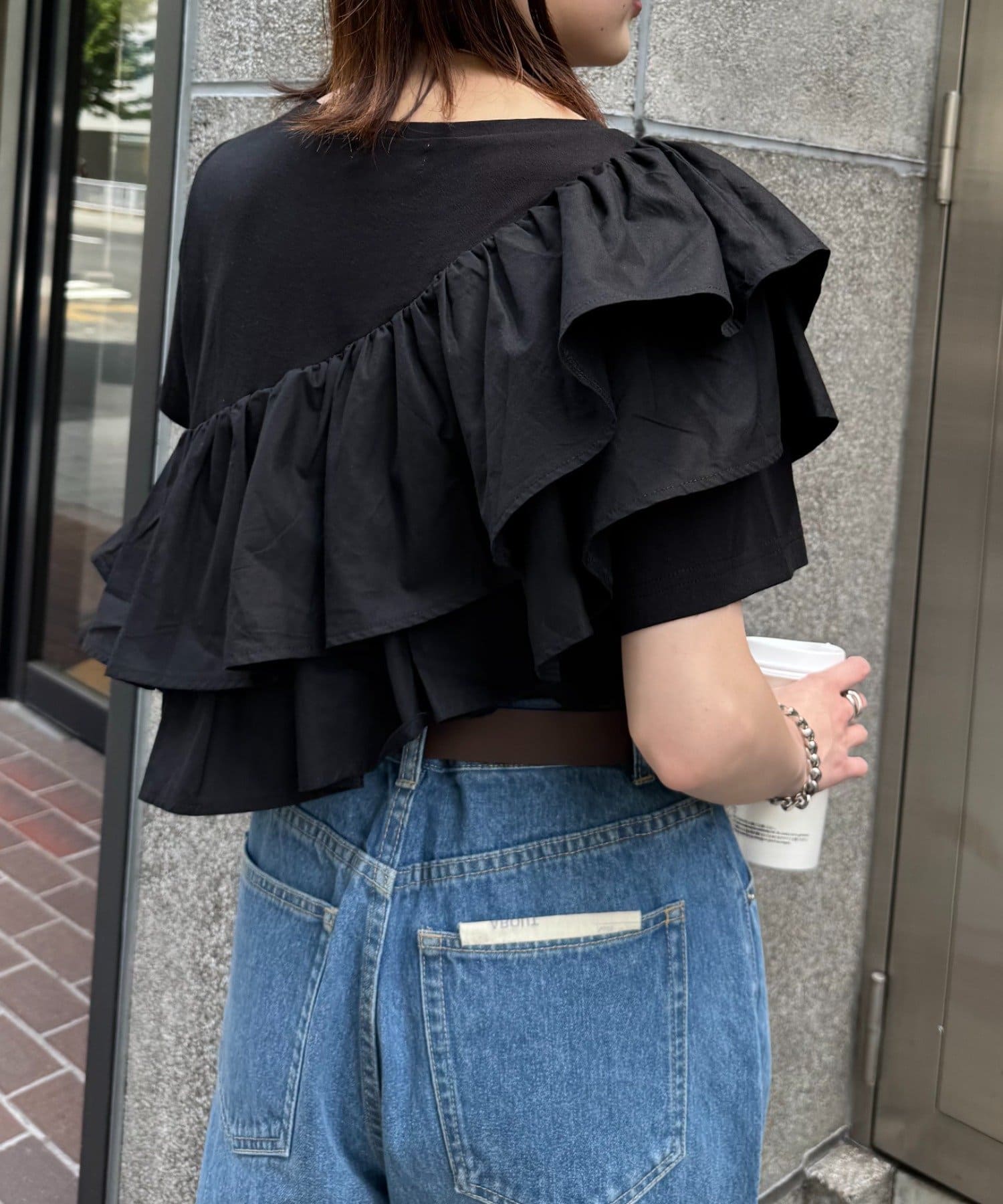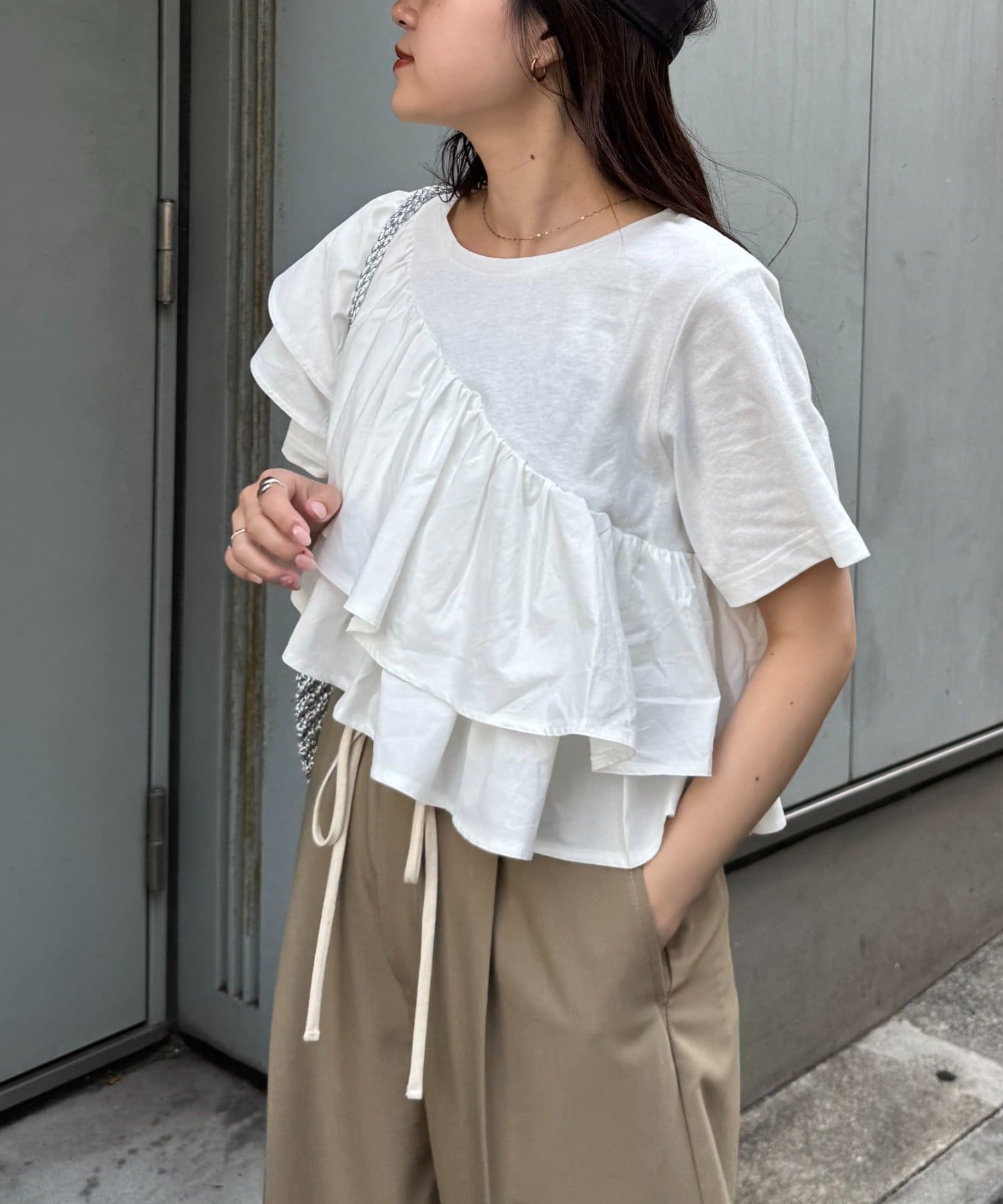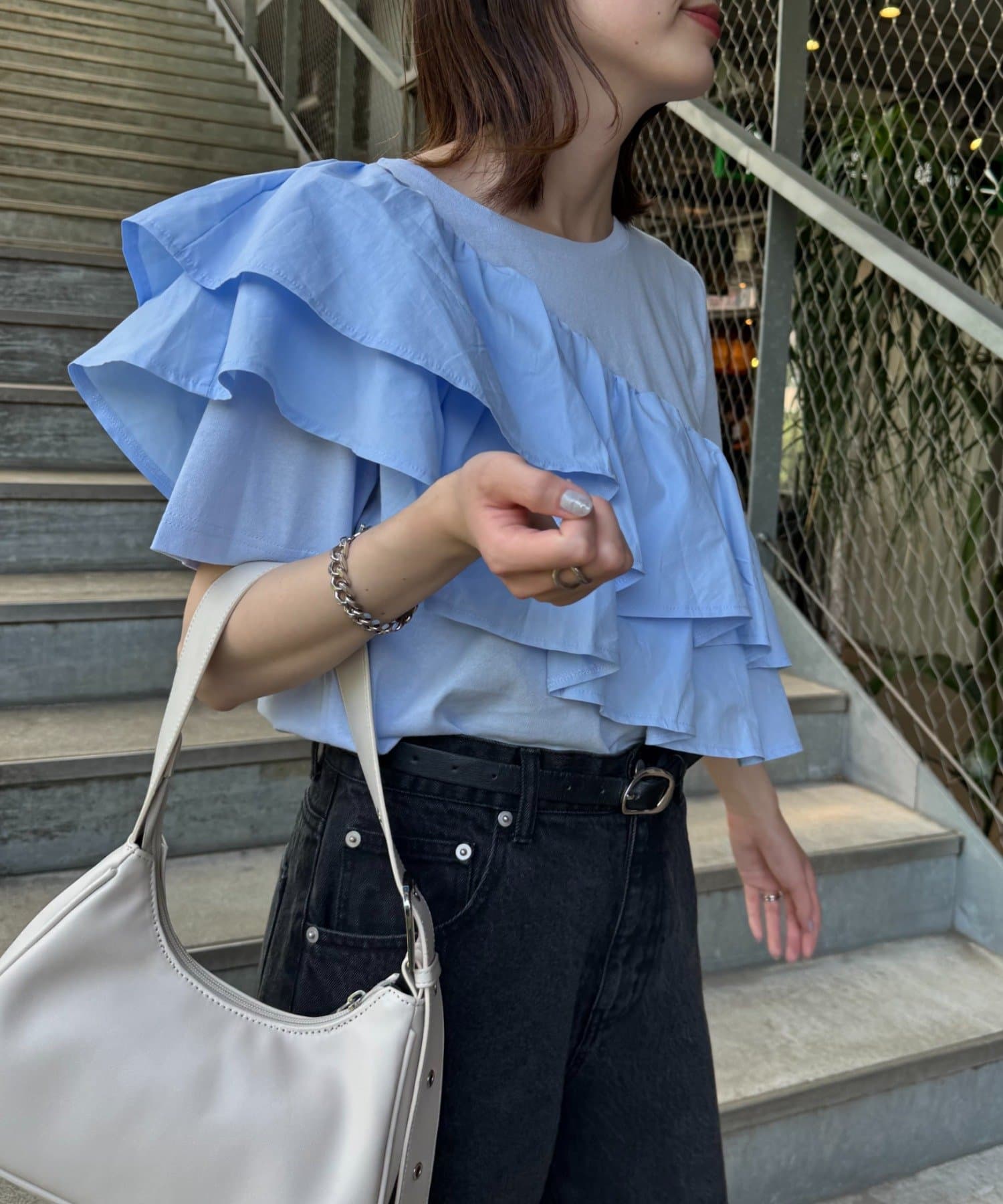 前後にあしらわれたアシンメトリーなフリルで華やかさをプラスしてくれます。