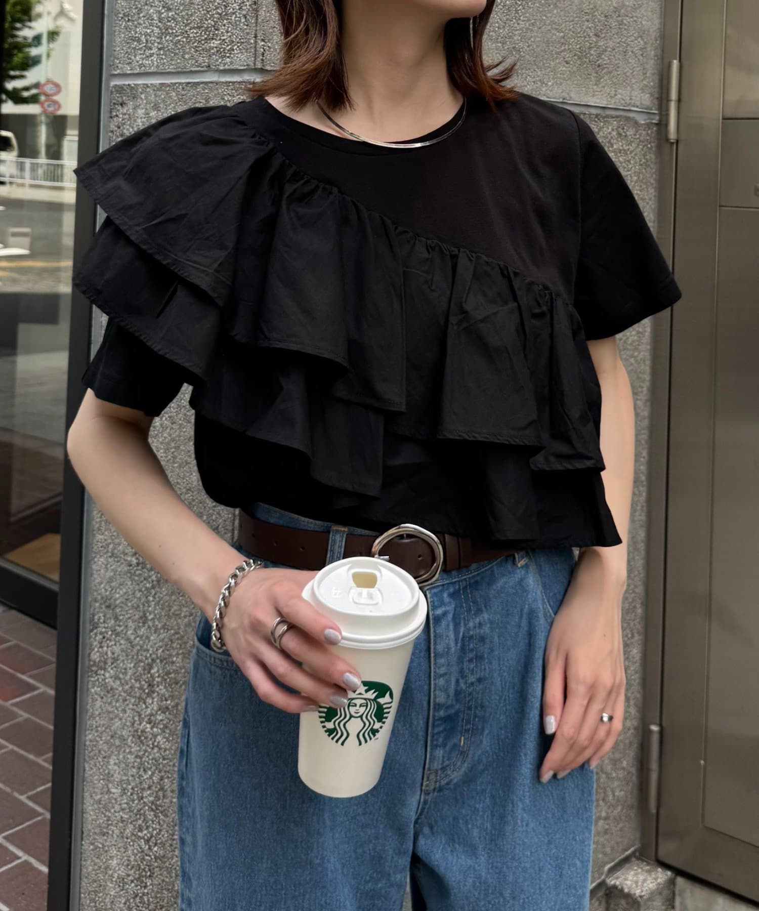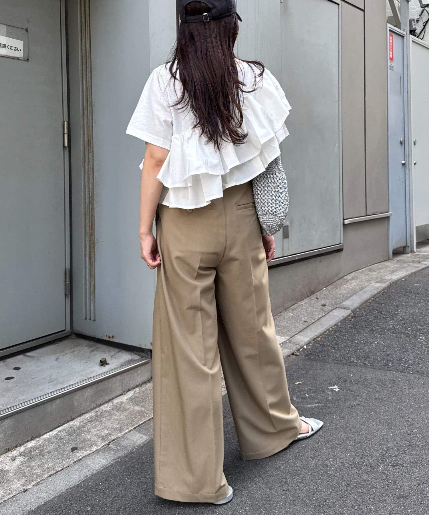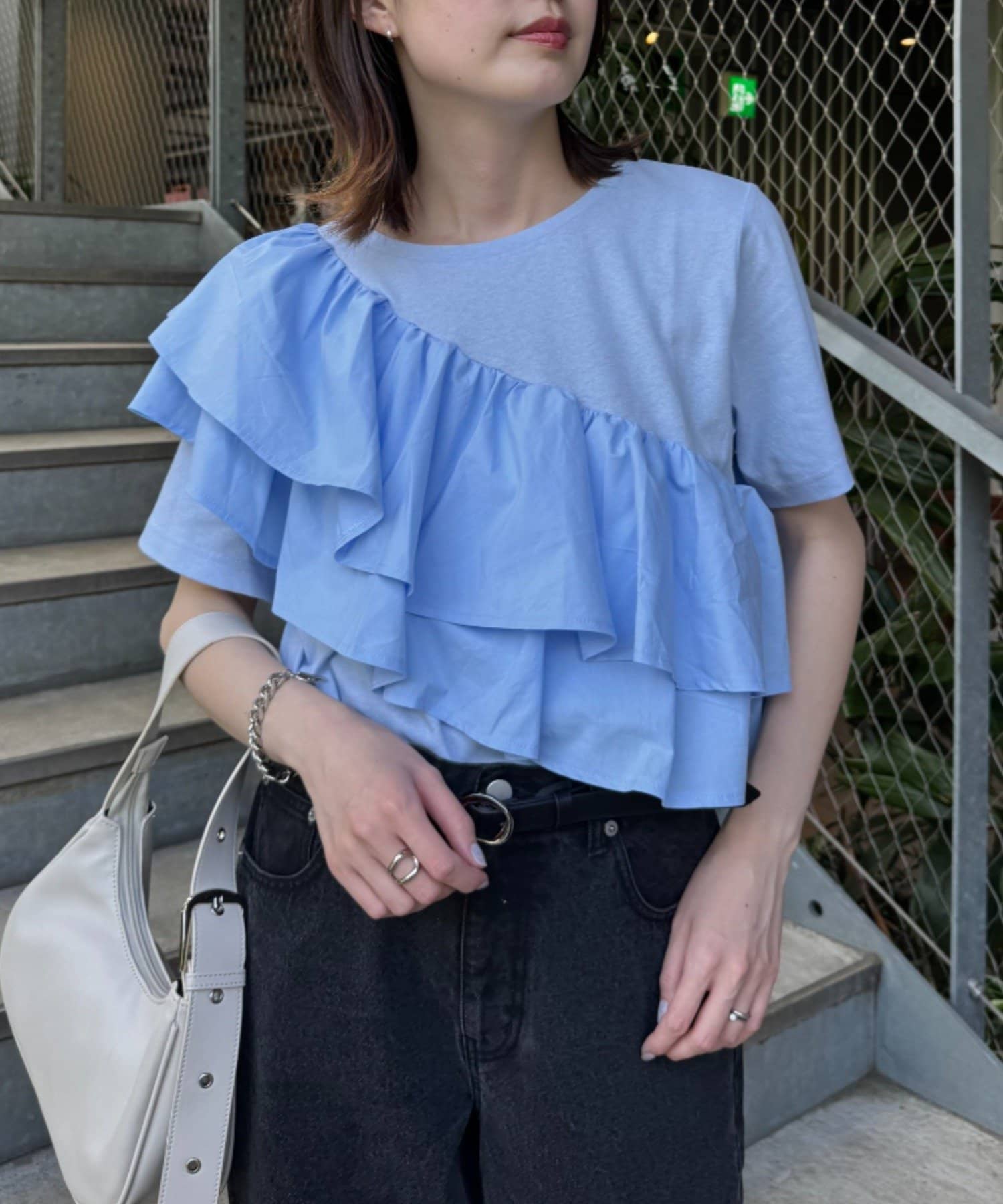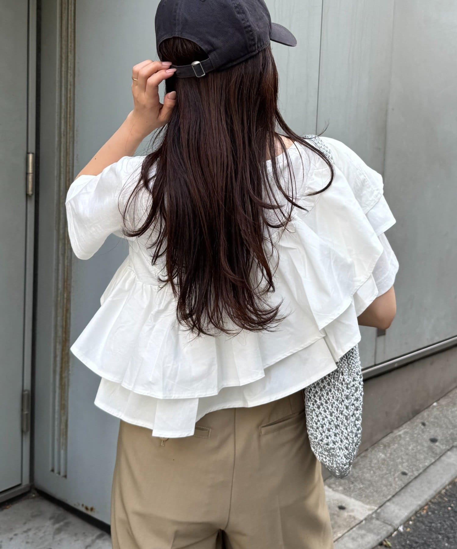 前後にあしらわれたアシンメトリーなフリルで華やかさをプラスしてくれます。
