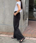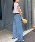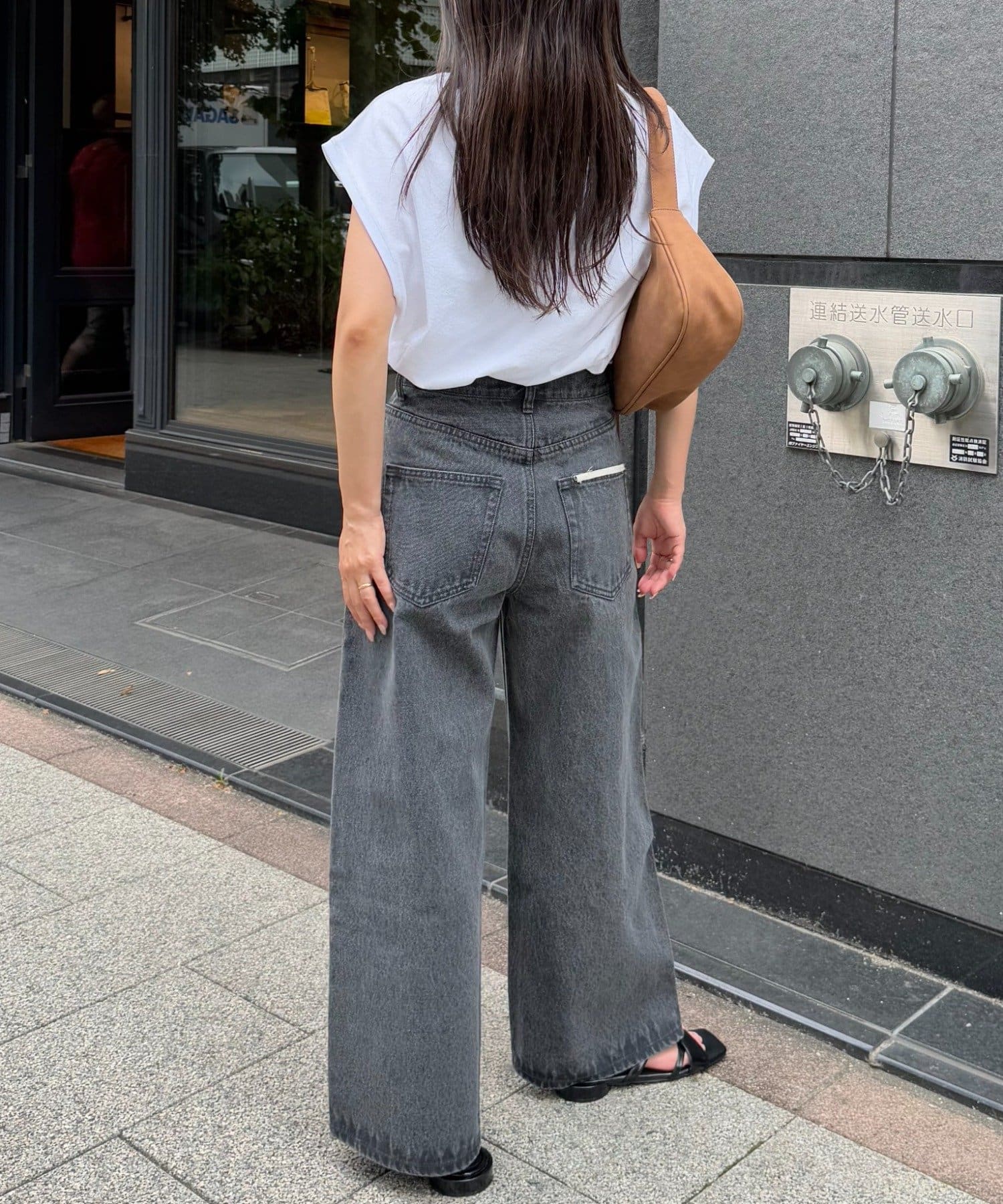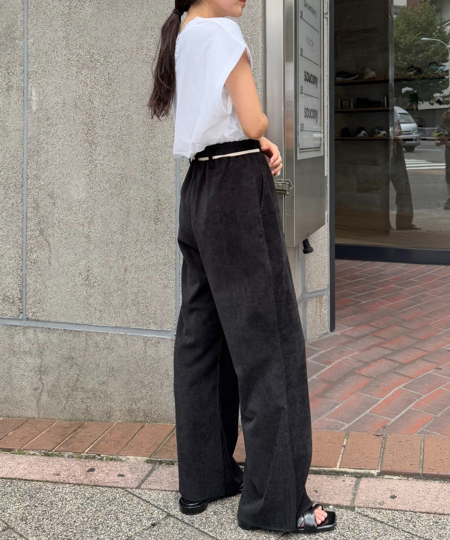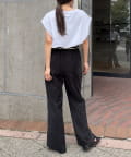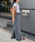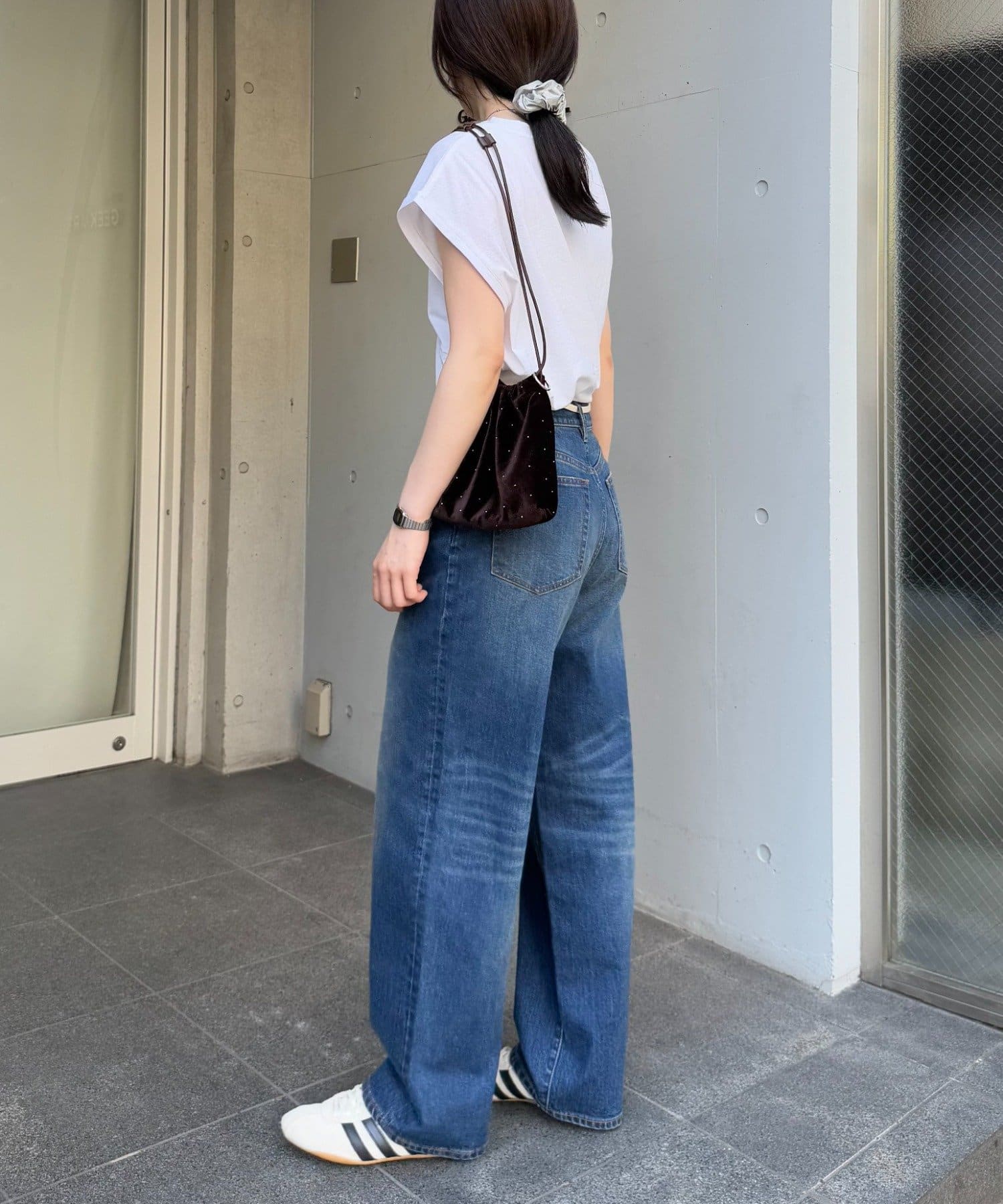 カジュアルすぎない生地感なので、トレンドのワイドパンツ合わせもラフ過ぎないコーデに。