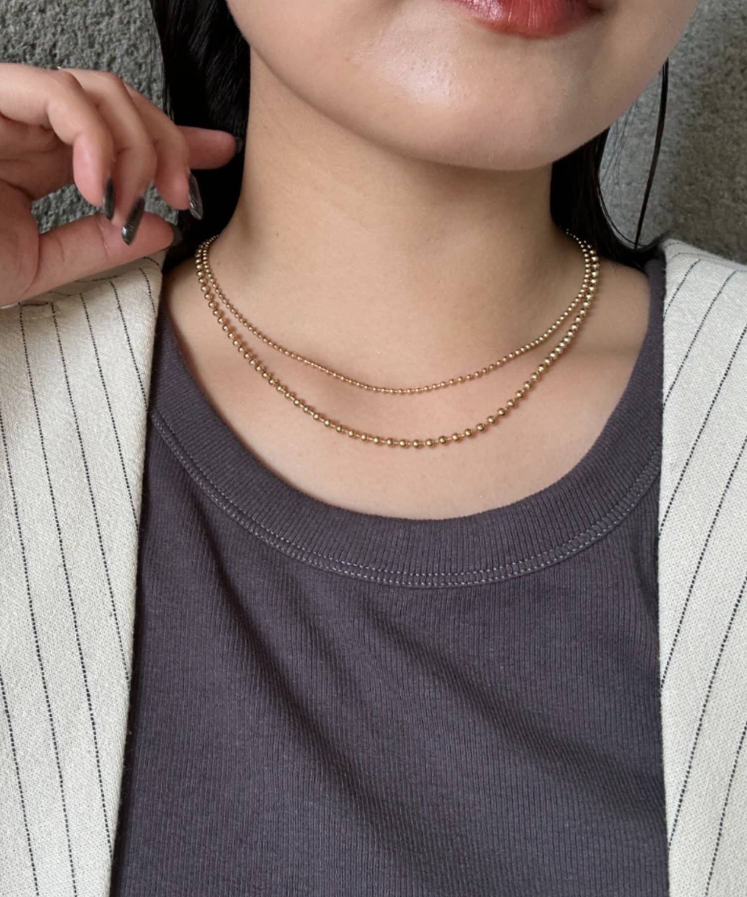 大きさの異なるボールチェーンが2連になっていることで、首元に奥行きと動きが生まれ、洗練された印象を与えます。