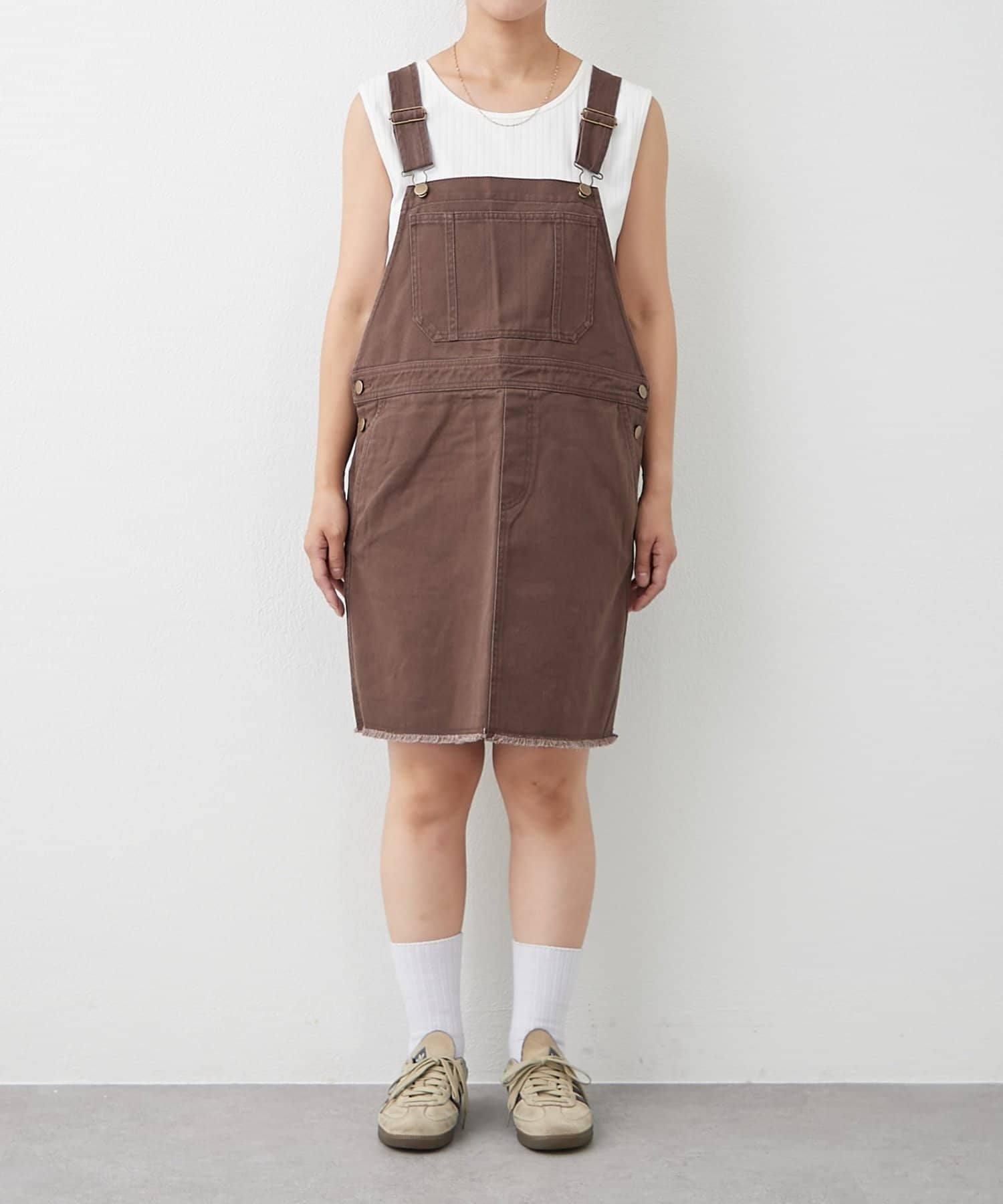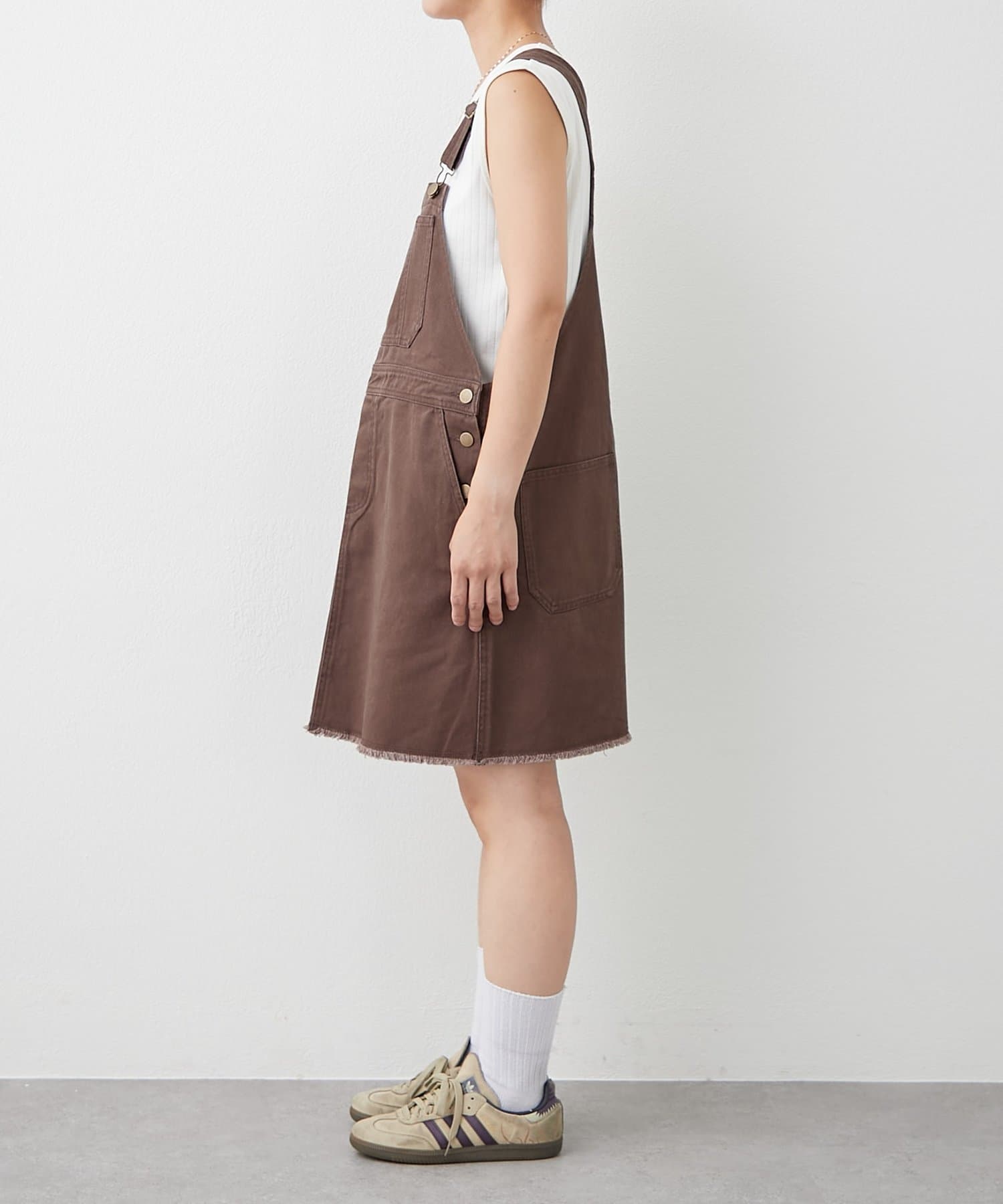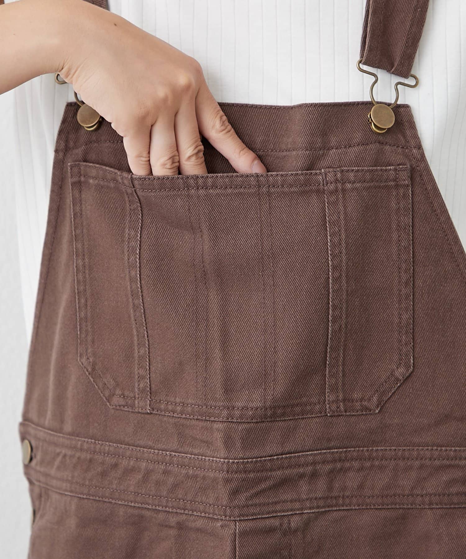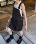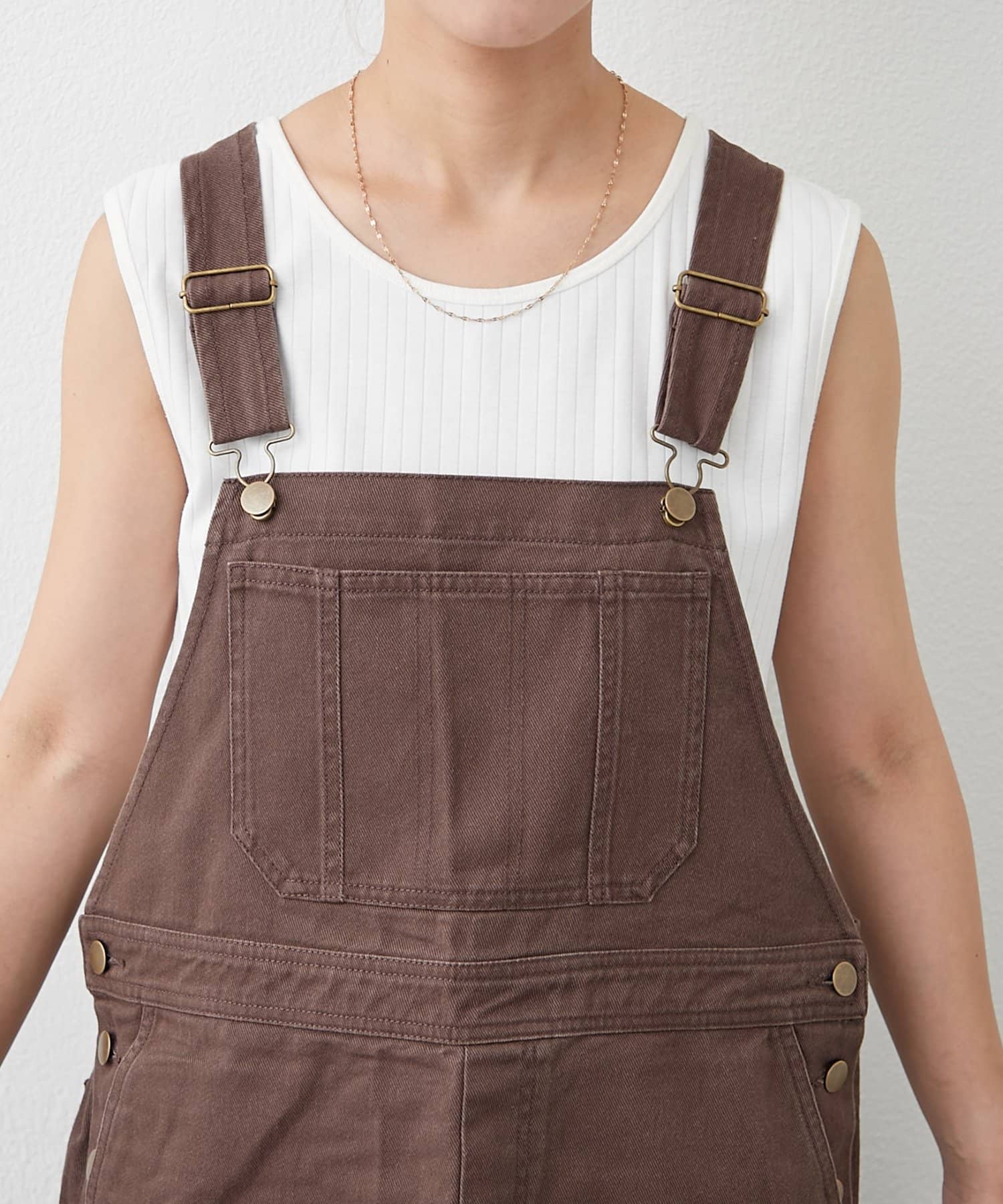 子供っぽく見えがちのショートサロペですが、デニム素材ではなく、