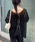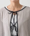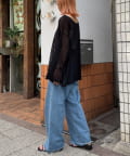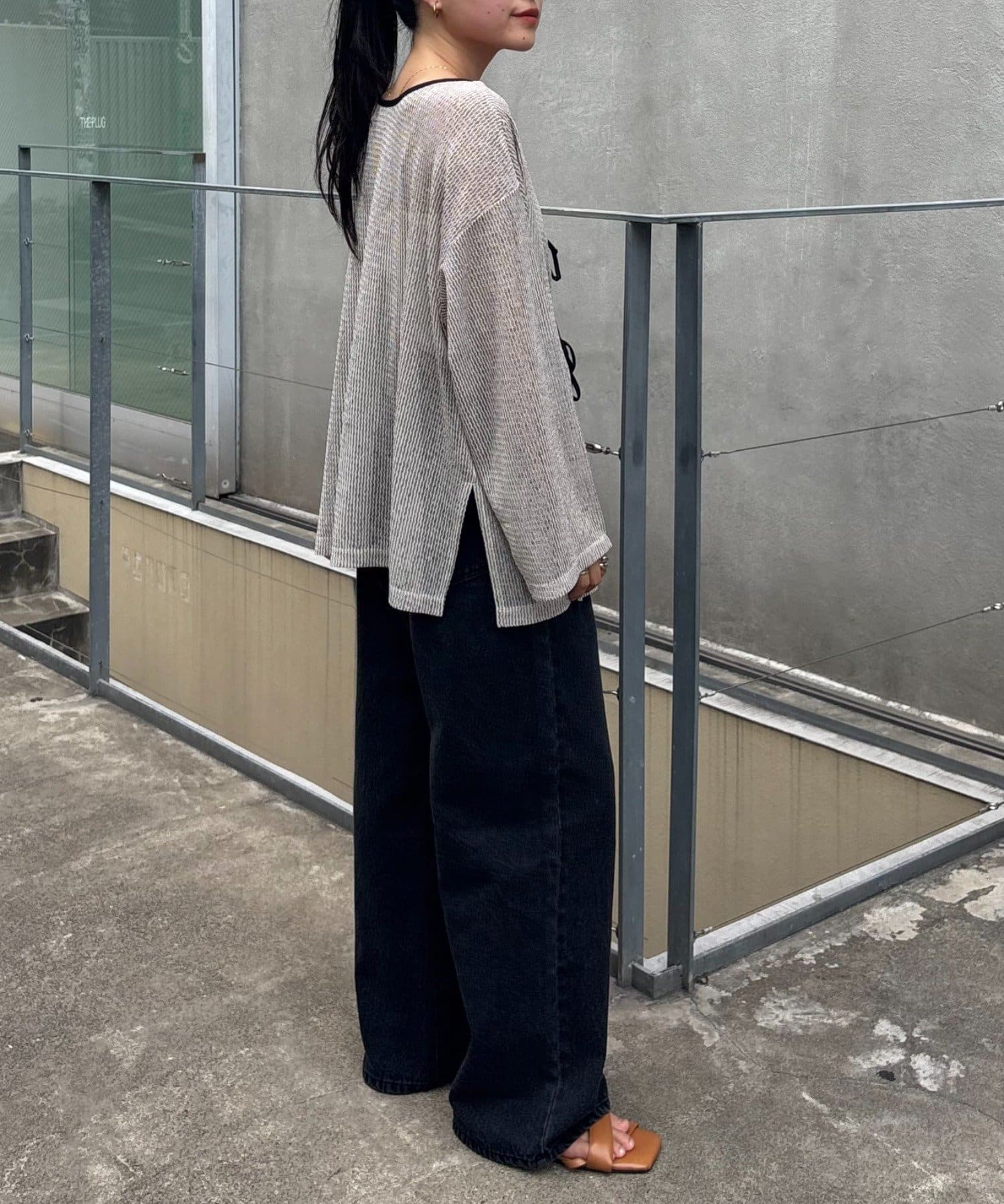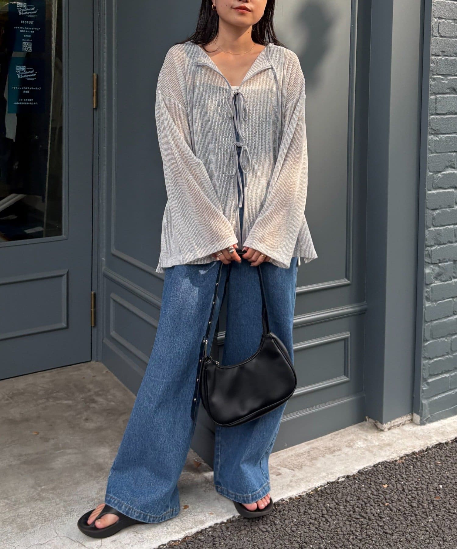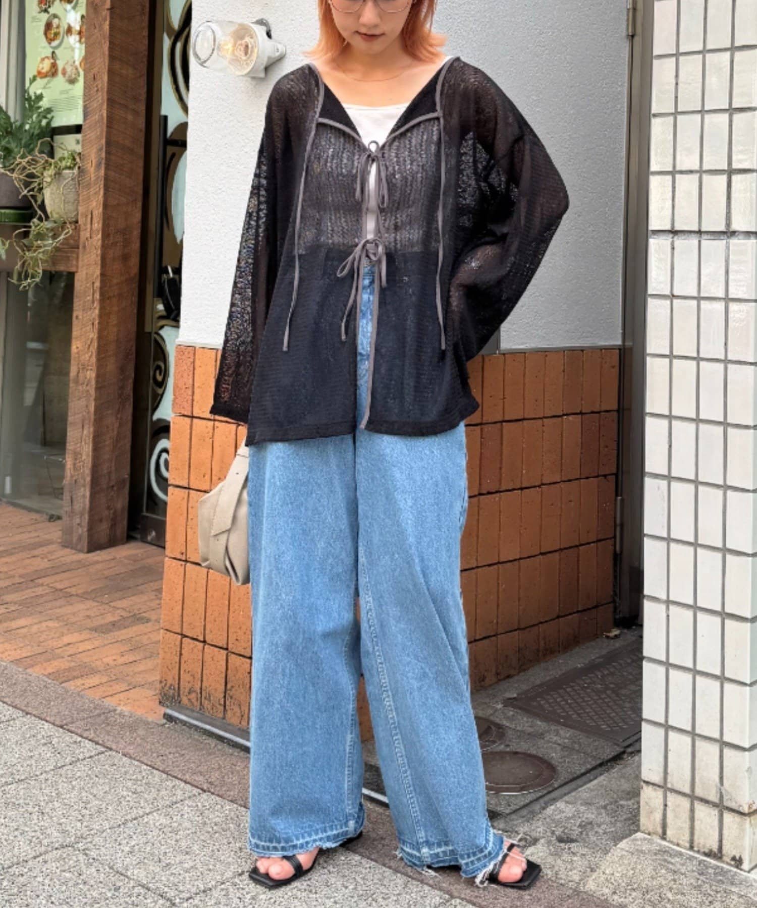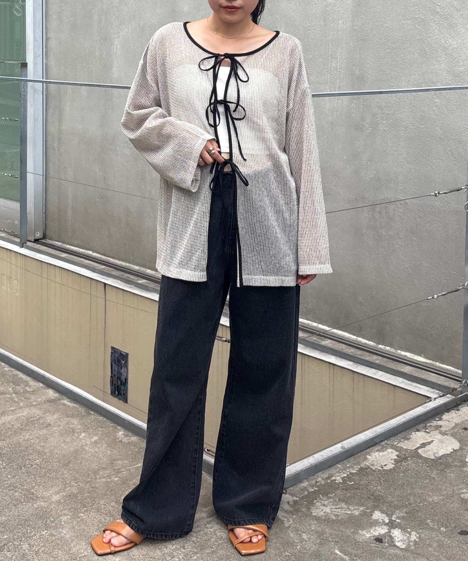 デニムと合わせたカジュアルスタイルも、透け感とリボンで程よくきれいめをプラス。