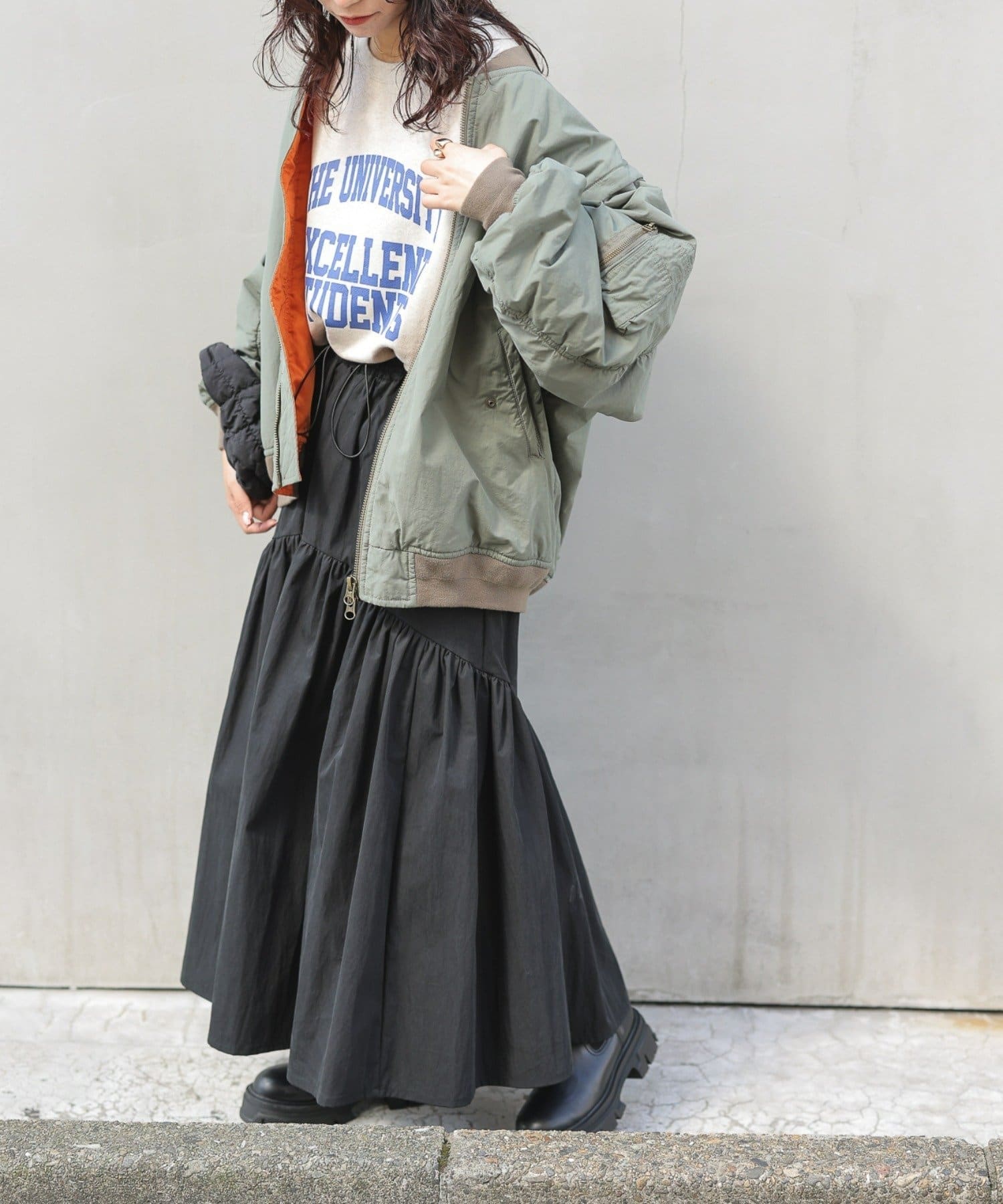 高身長を活かした女性らしいロングスカートとのゆったりコーデもおすすめです!