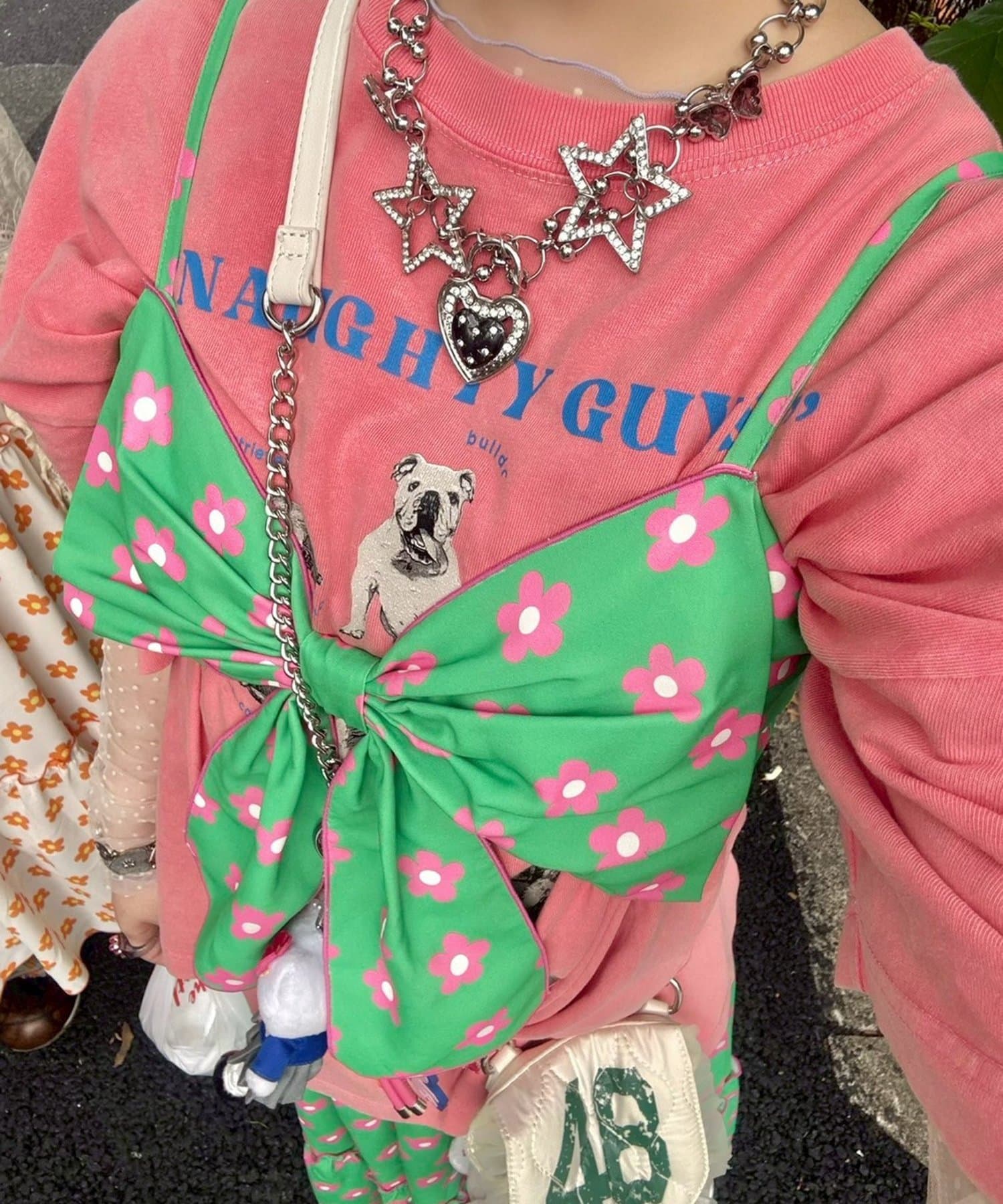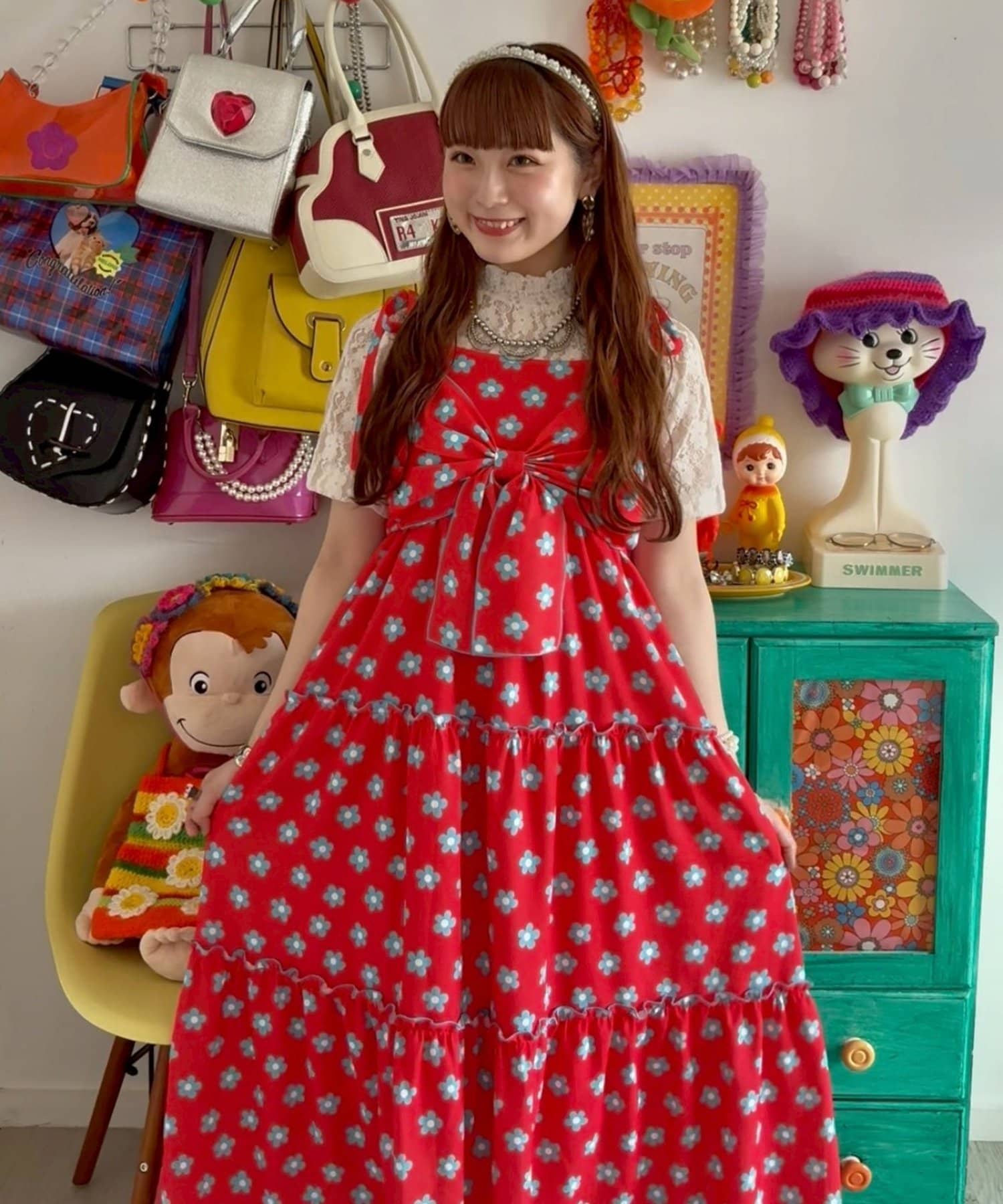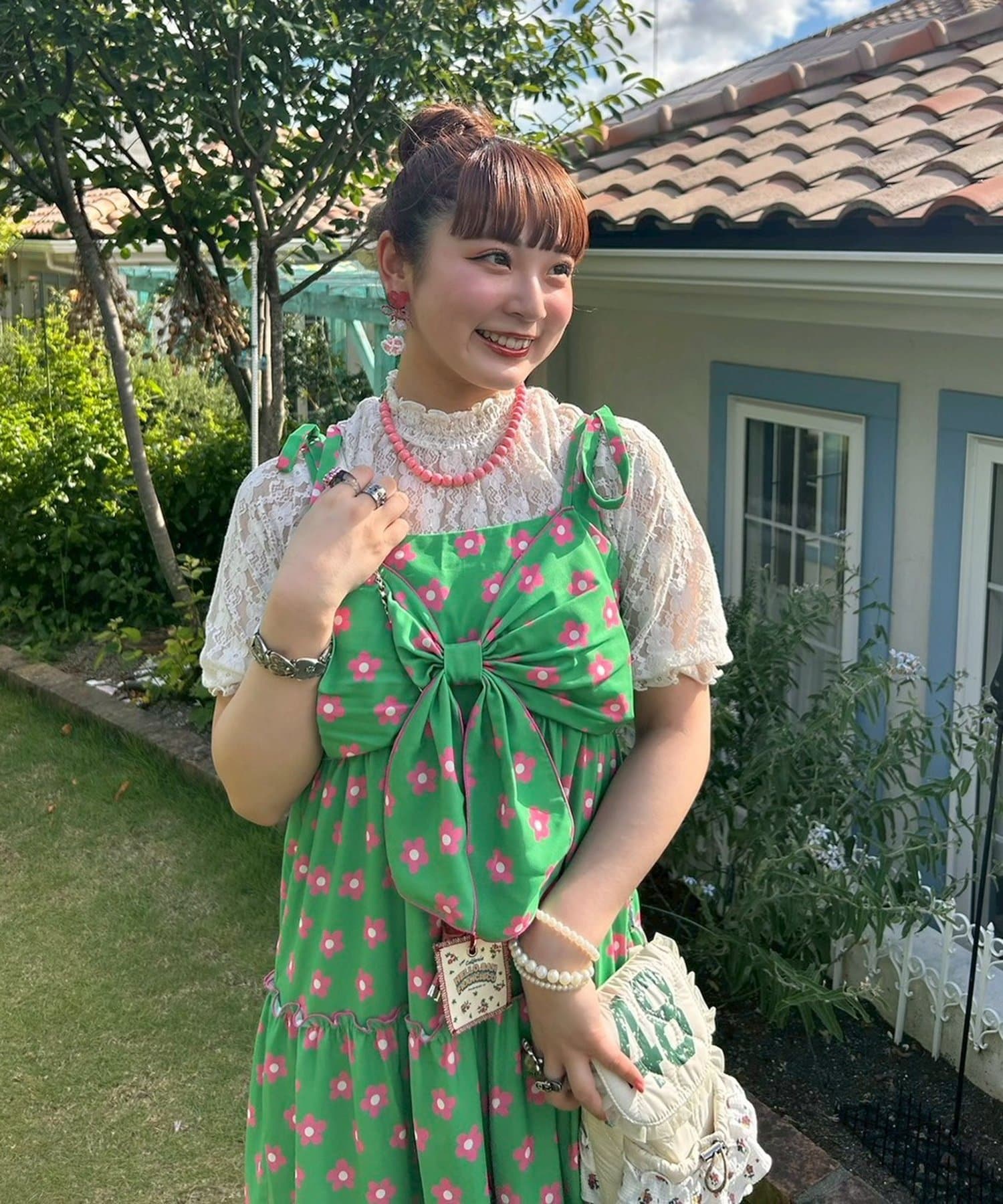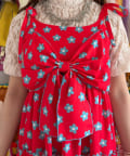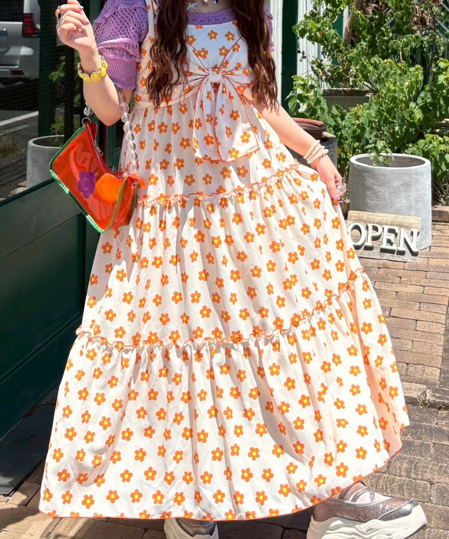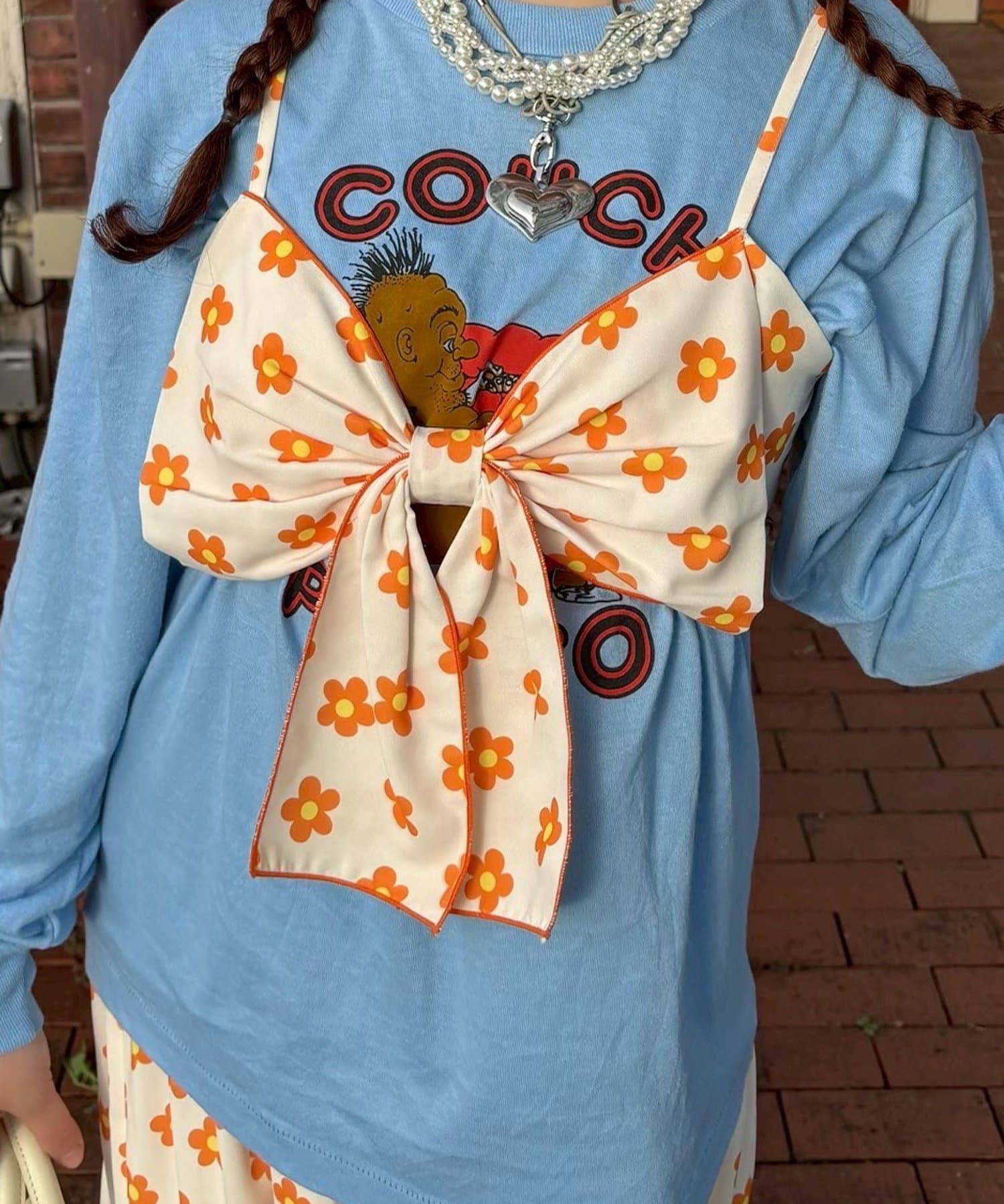 レトロポップな花柄に胸元の大きなリボンがポイントに!