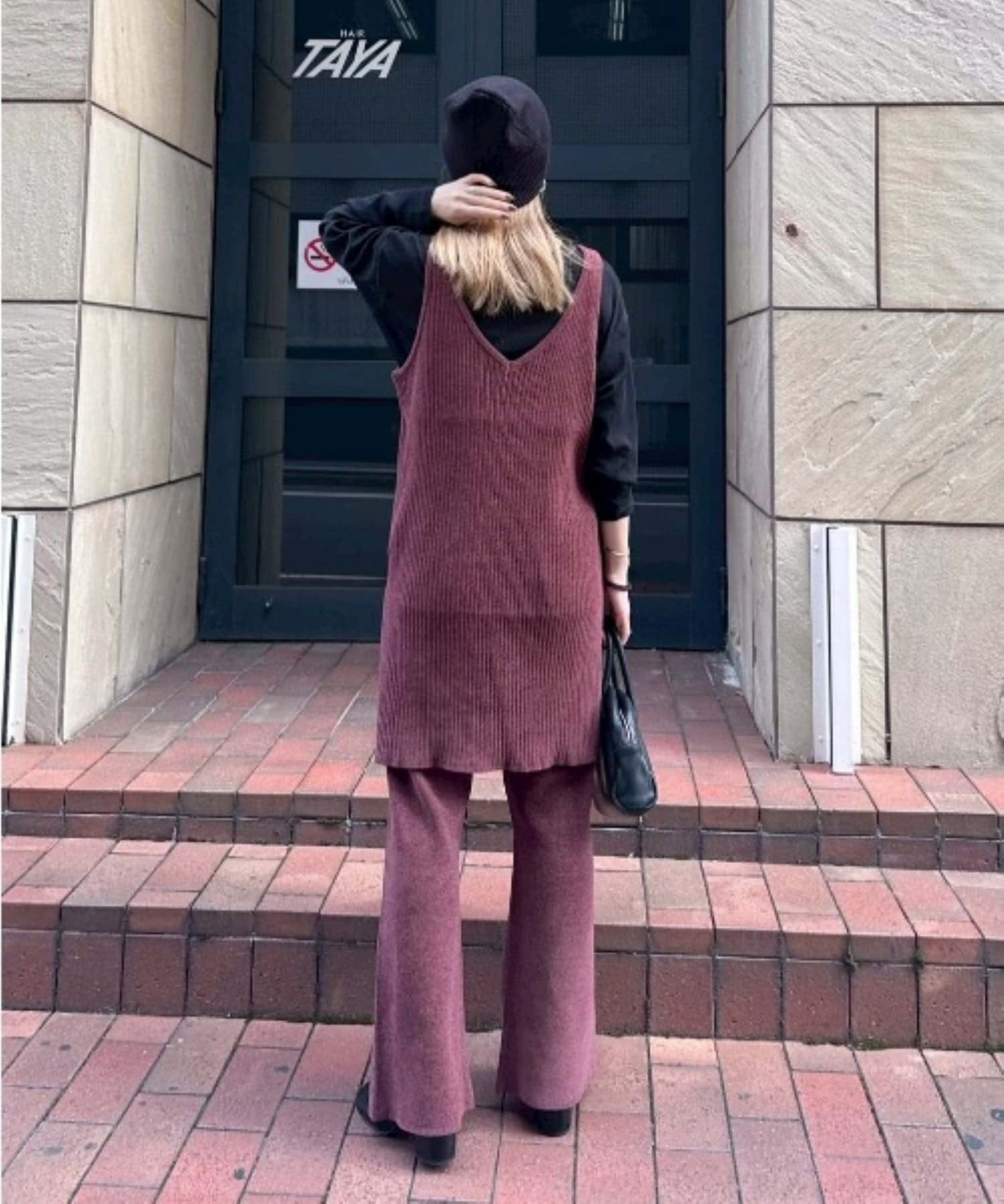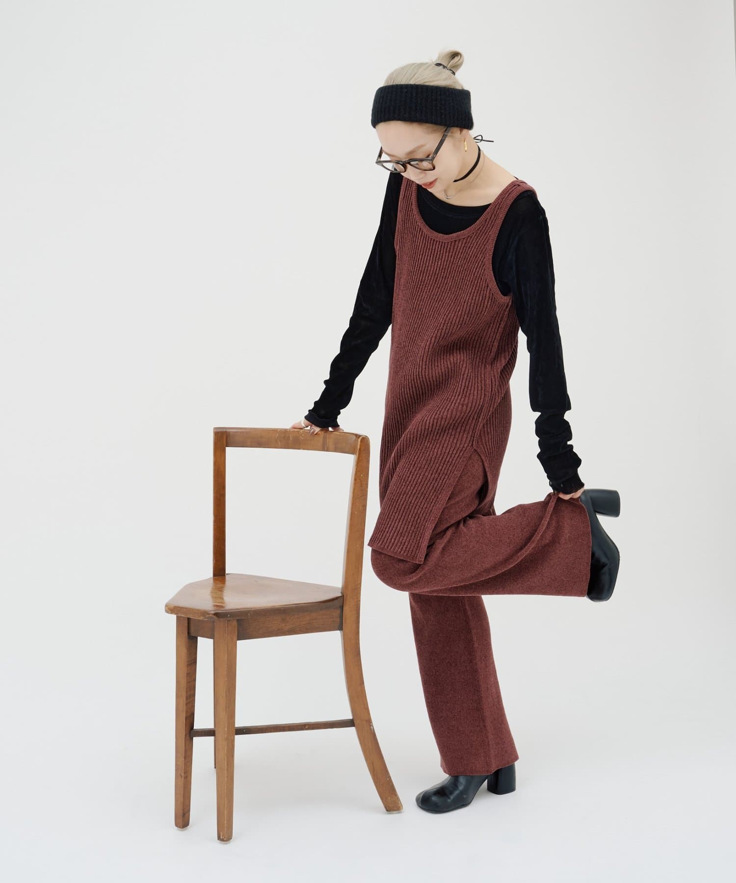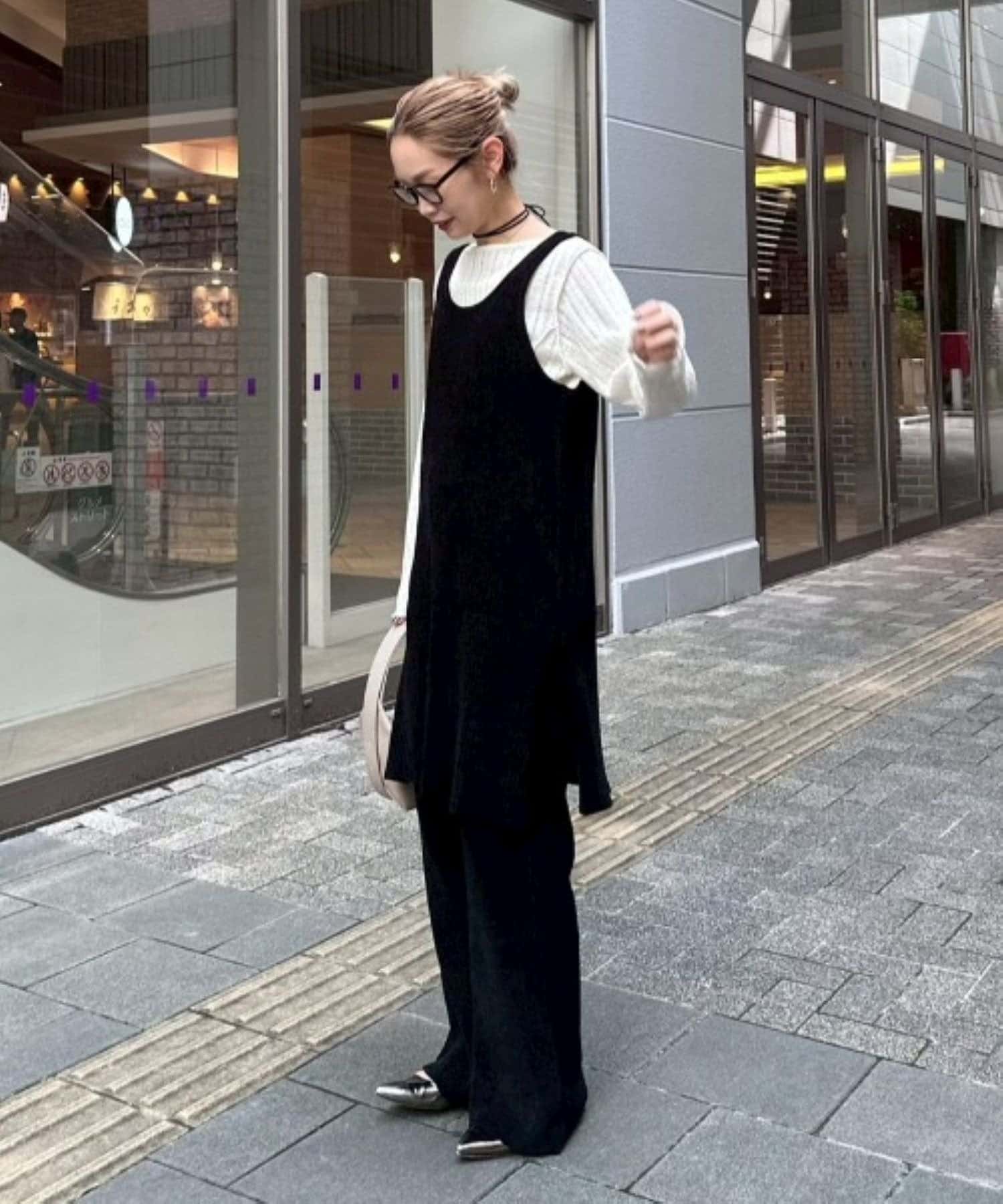同素材のニットチュニックとのセットアップスタイルもお勧めです。