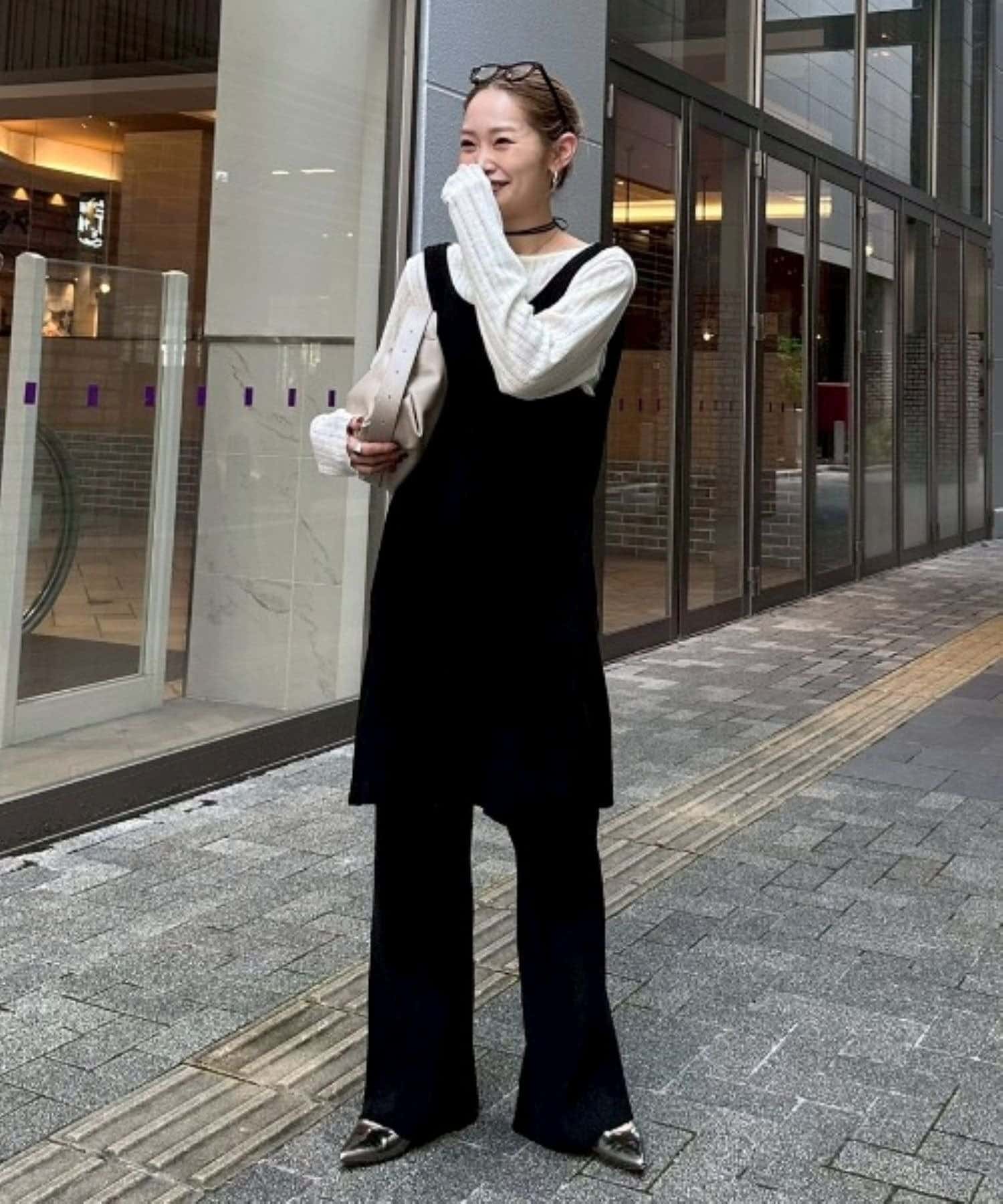 裾に向かって緩やかに広がるシルエットが、脚長効果とこなれ感を演出します。
