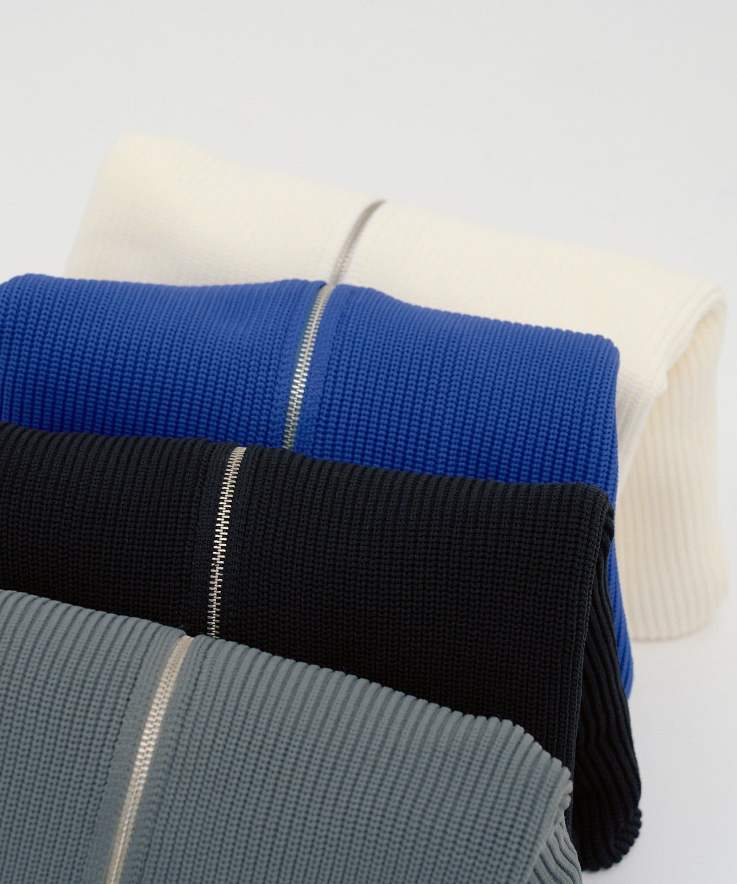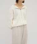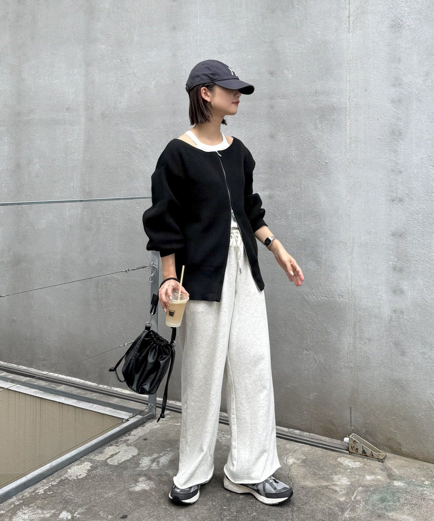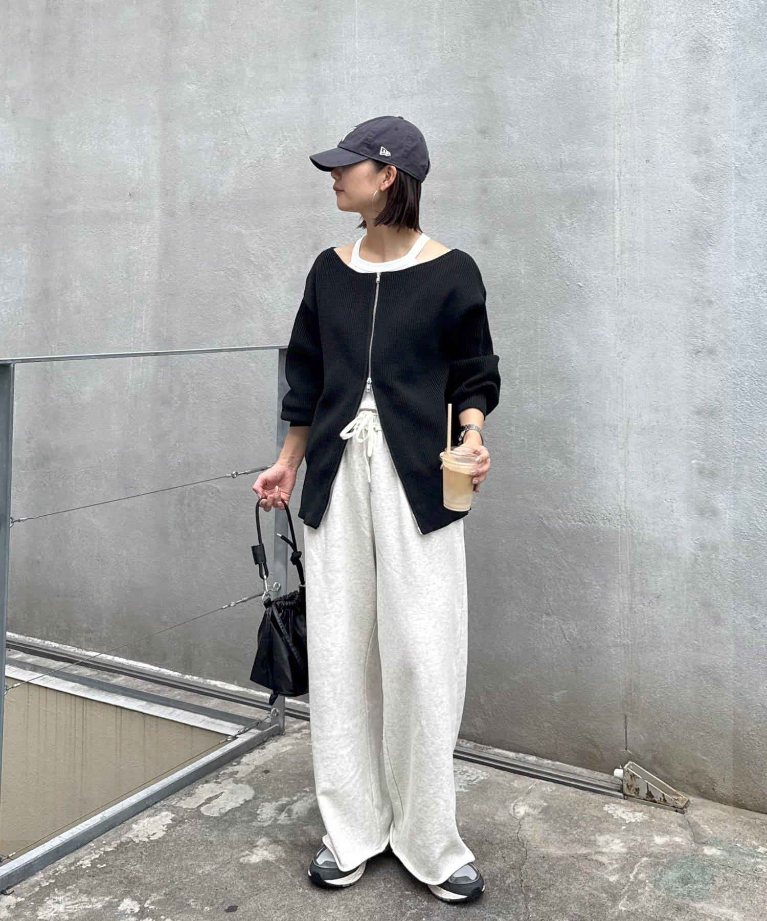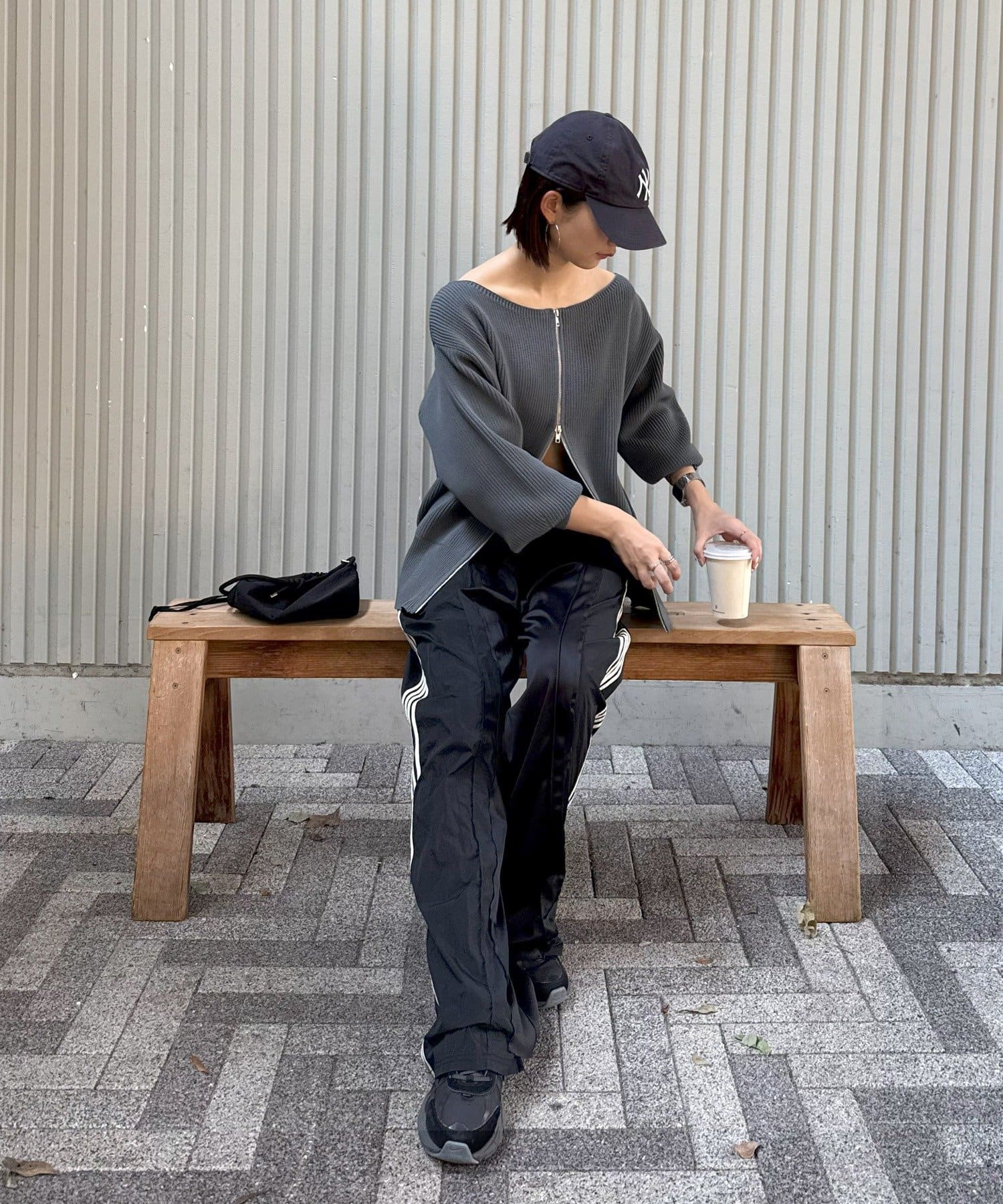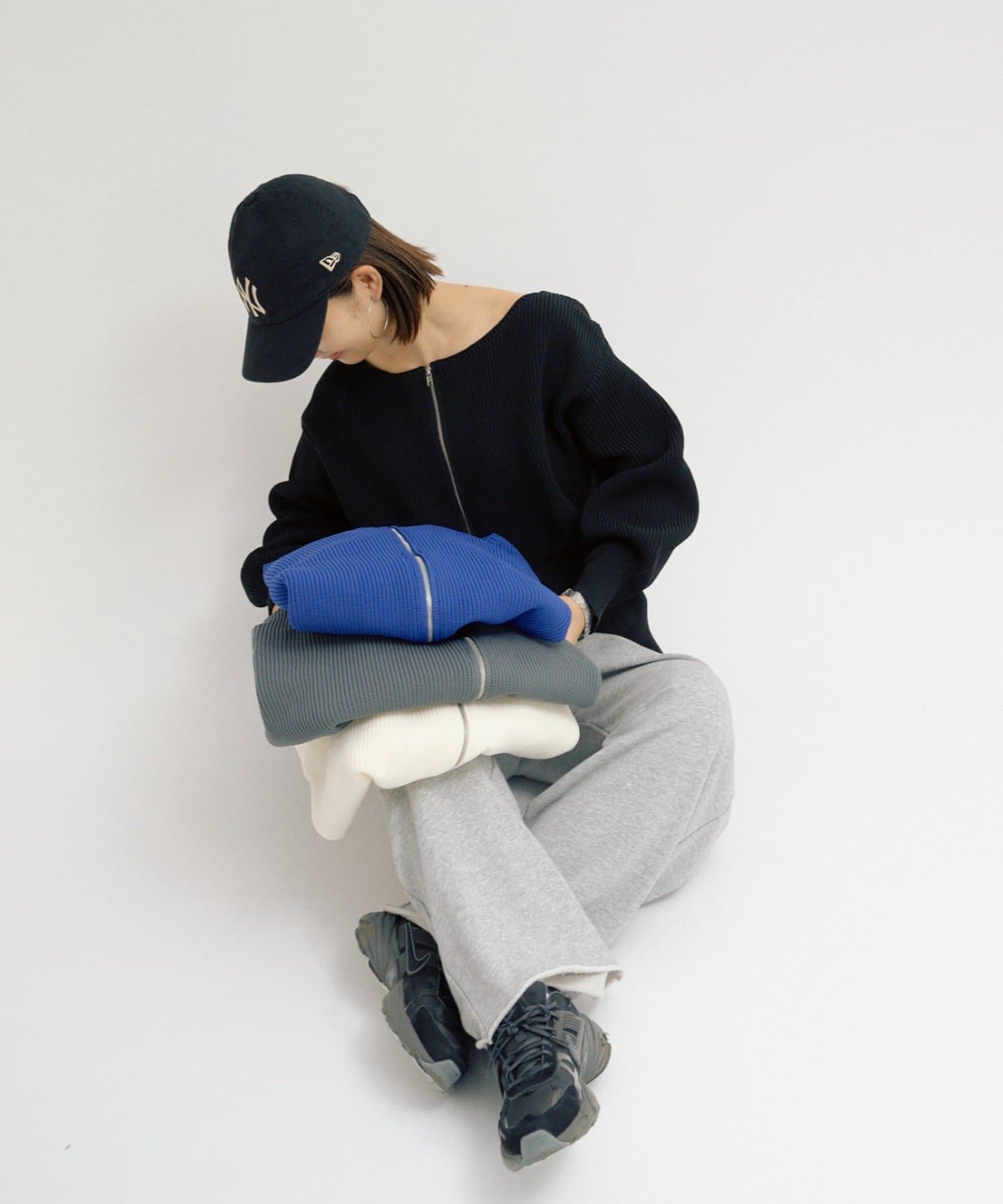 ジップを上だけ少し開けて、襟を折り返せば、ハーフジップニット風にも着こなせます。
