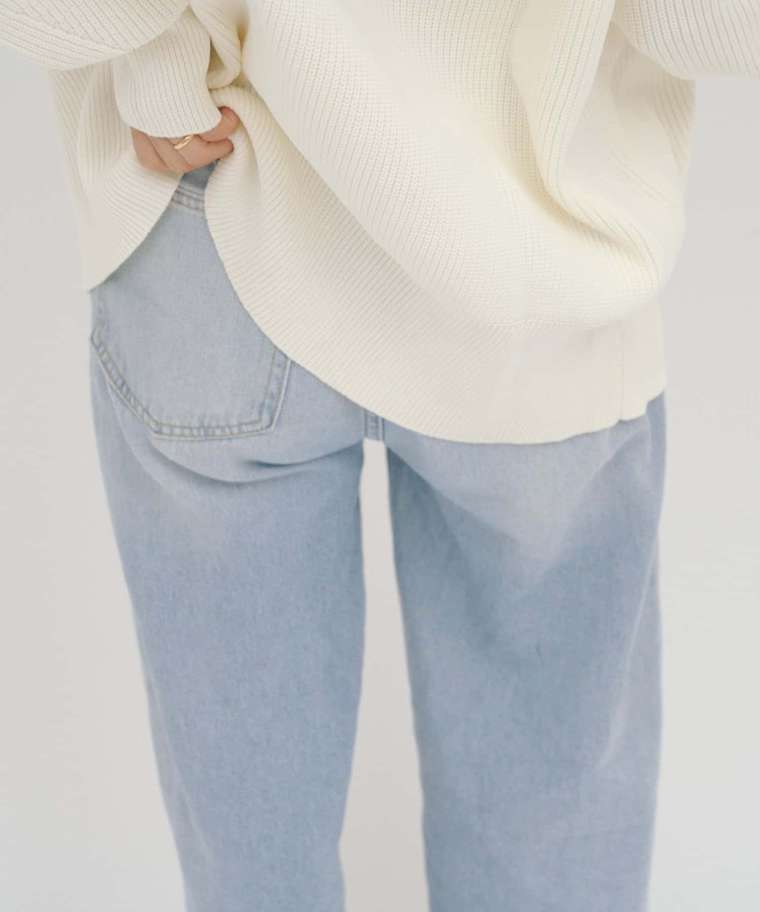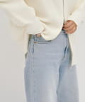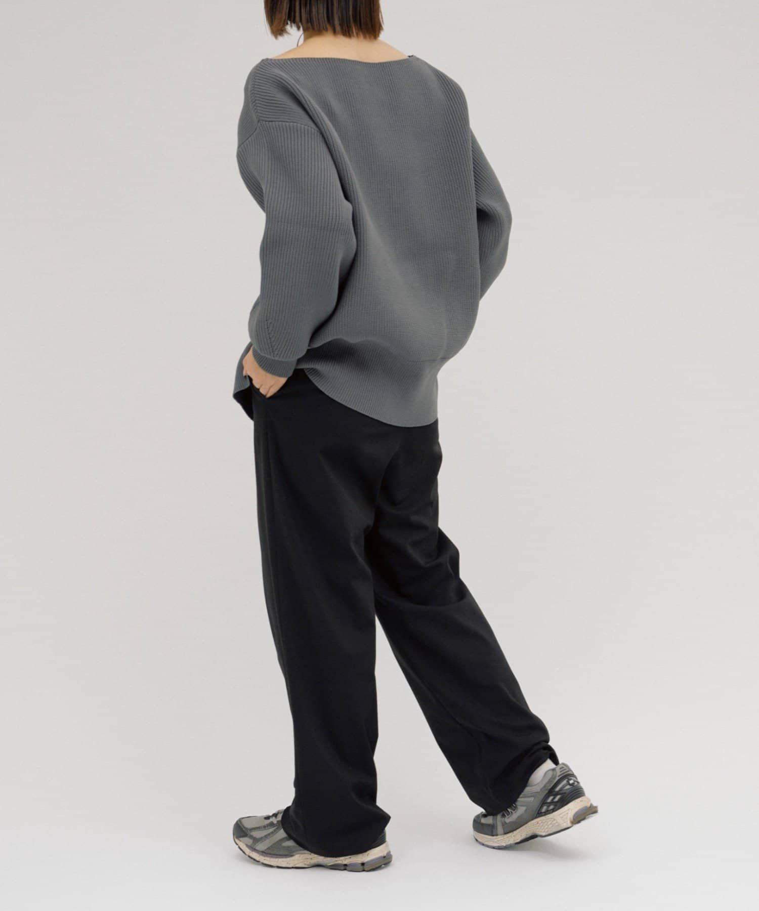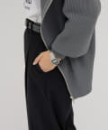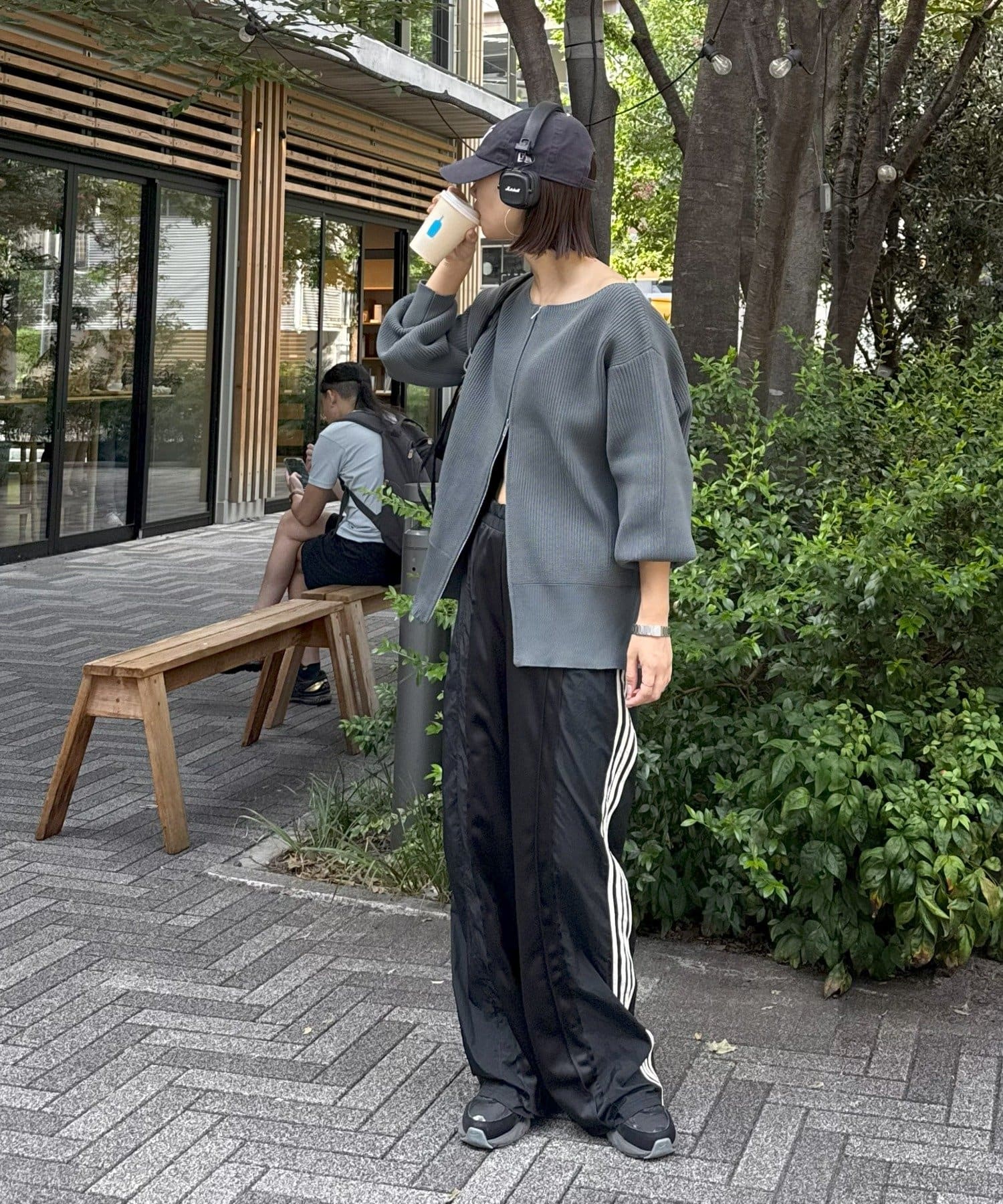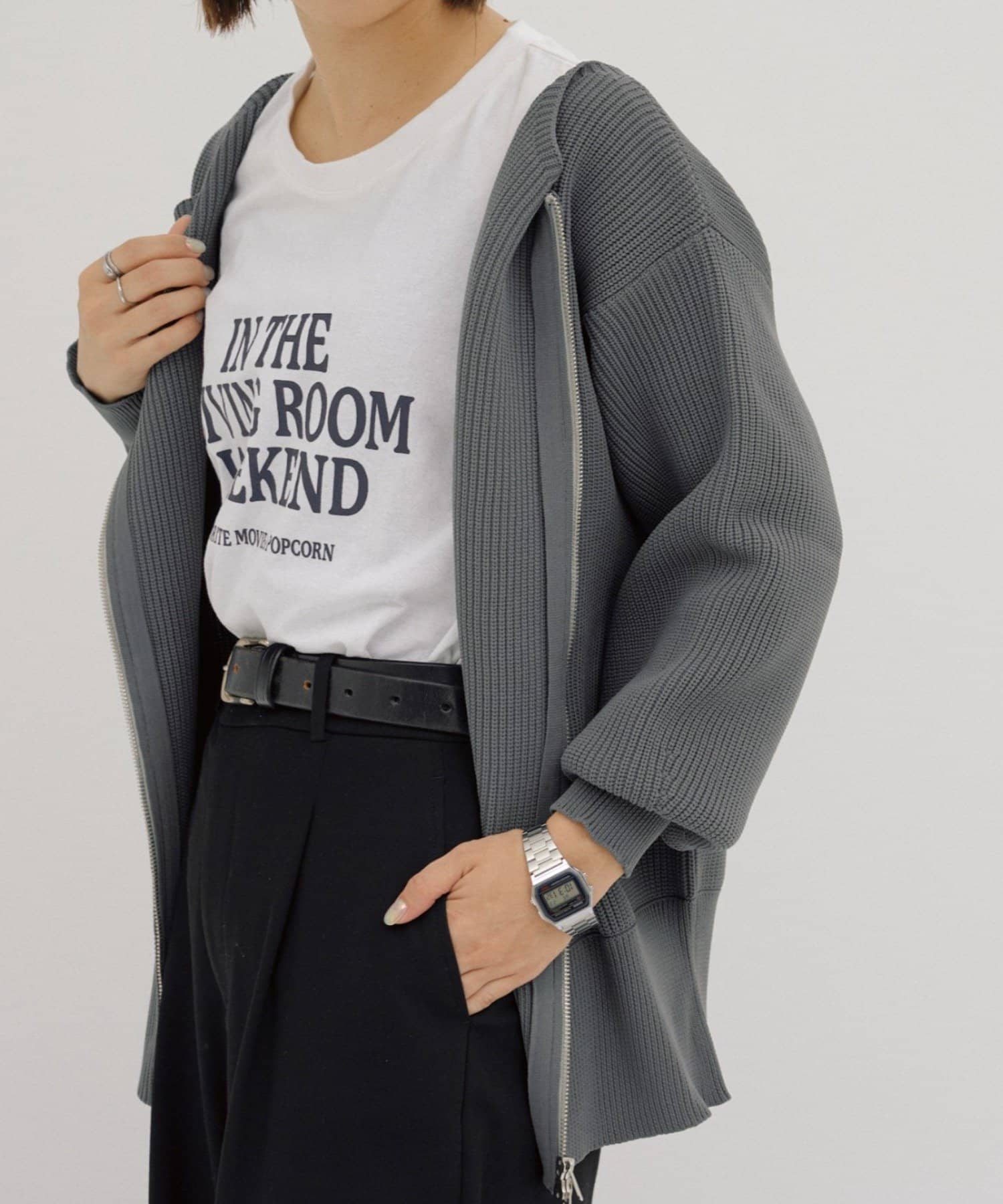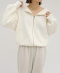 ジップを上だけ少し開けて、襟を折り返せば、ハーフジップニット風にも着こなせます。