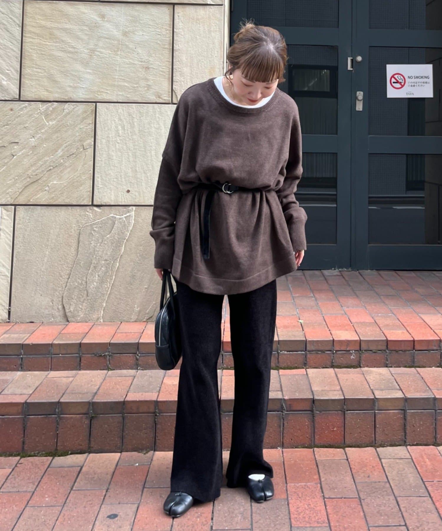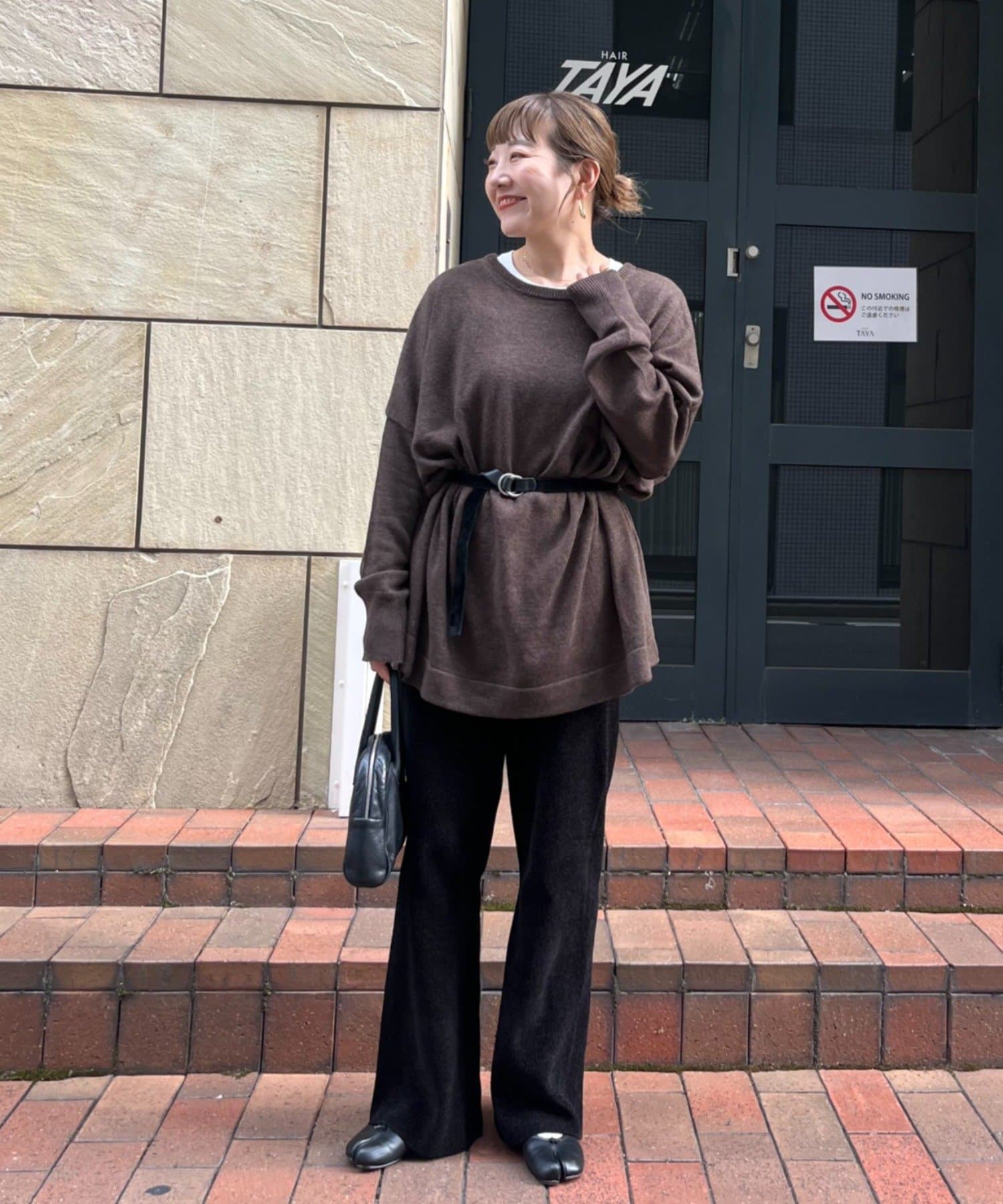 プリーツスカートやテーパードパンツと合わせて、オフィススタイルにも。足元はパンプスやブーツで、上品さを演出。