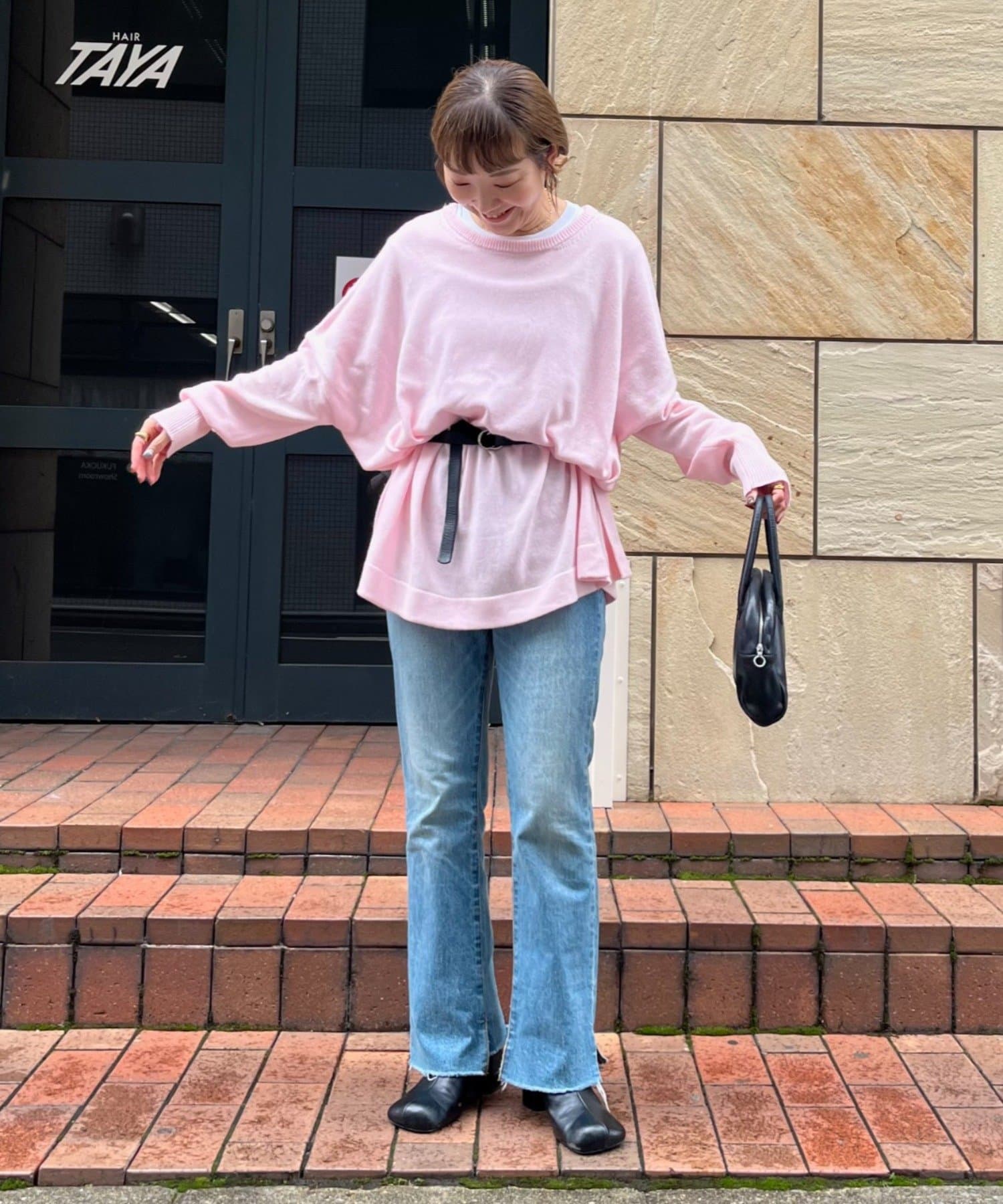 プリーツスカートやテーパードパンツと合わせて、オフィススタイルにも。足元はパンプスやブーツで、上品さを演出。