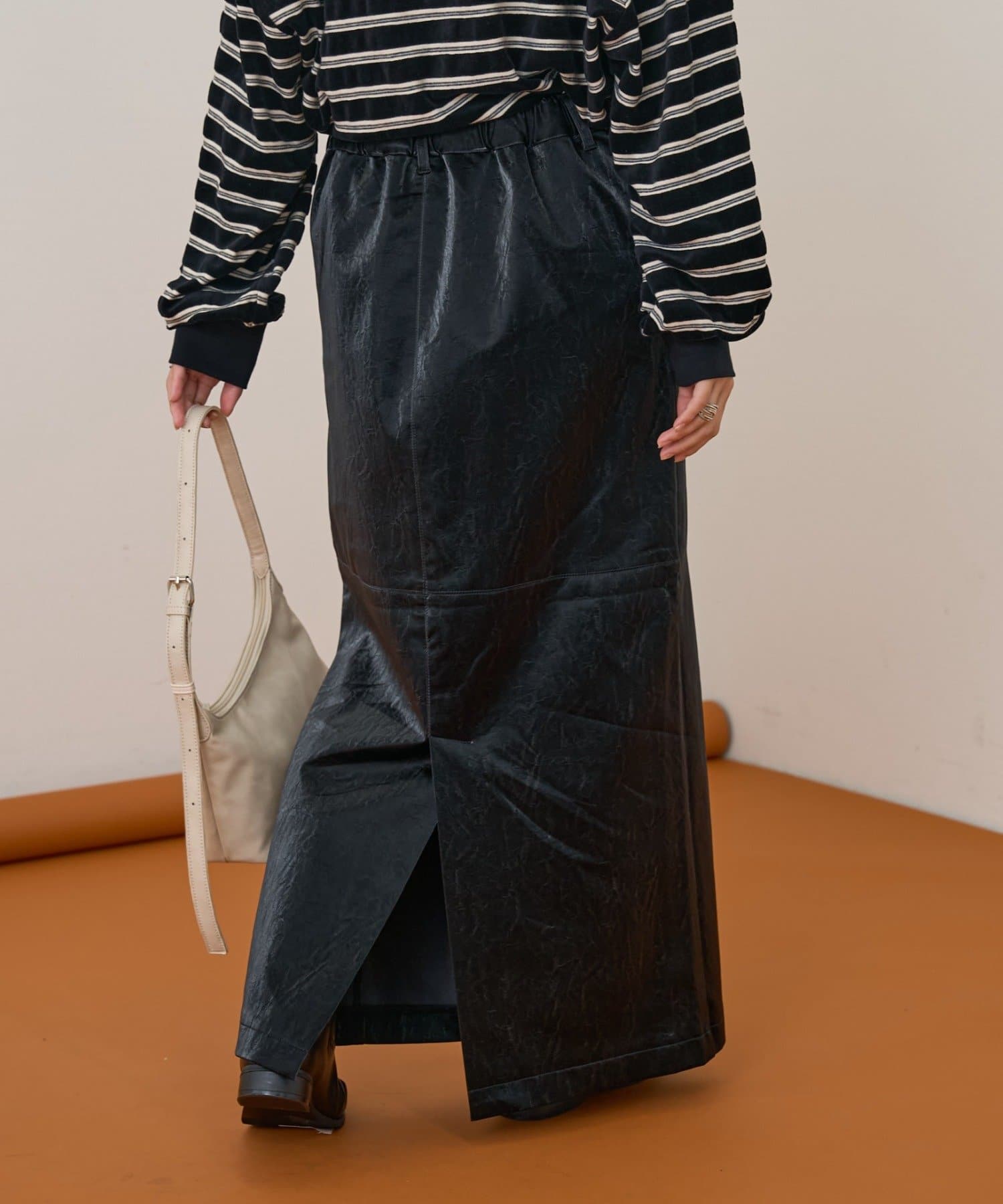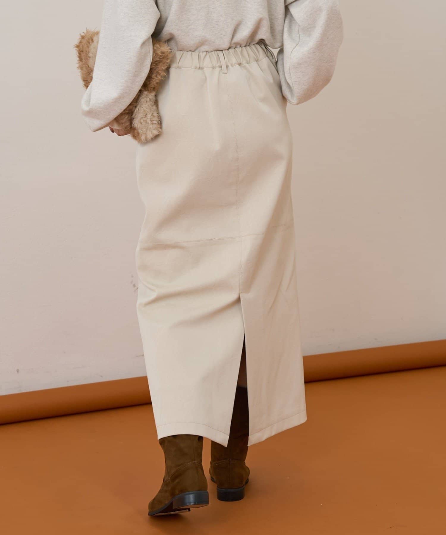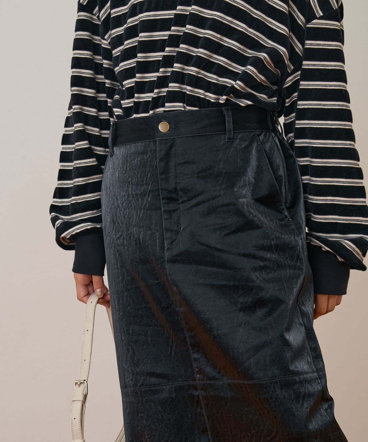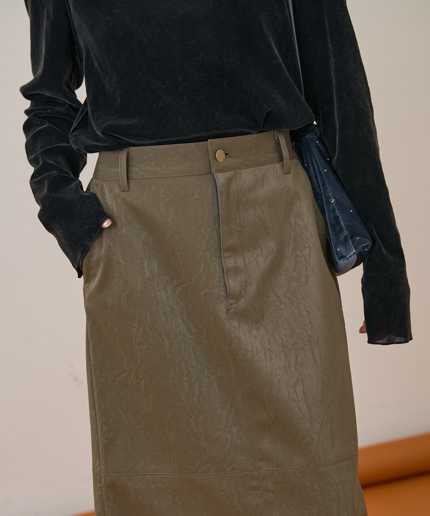 上品な光沢感とハリのあるフェイクレザーを使用した、ナローシルエットのスカート!