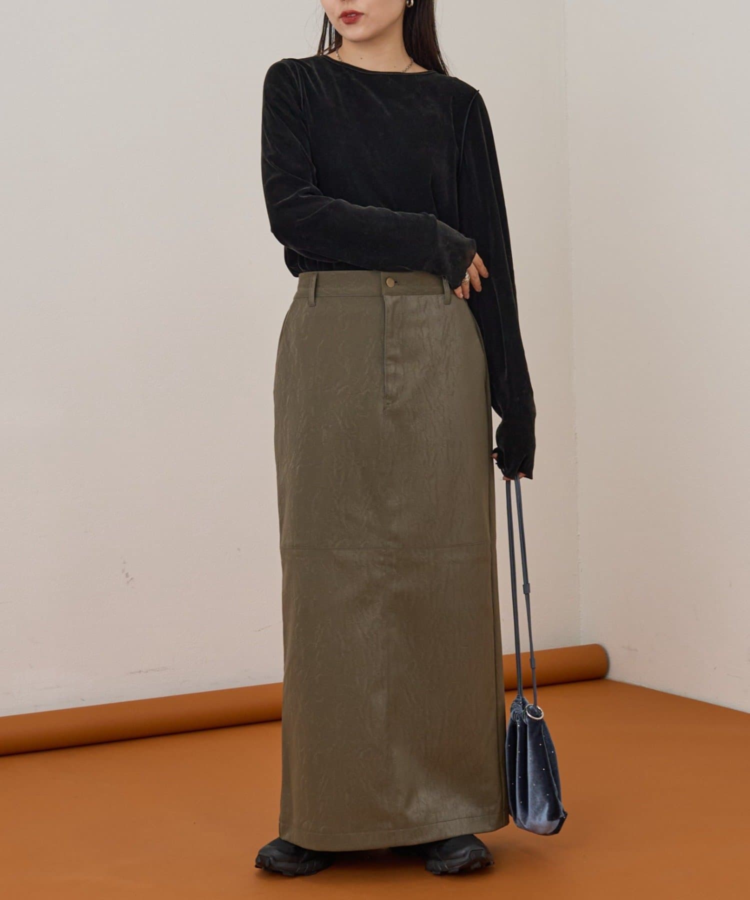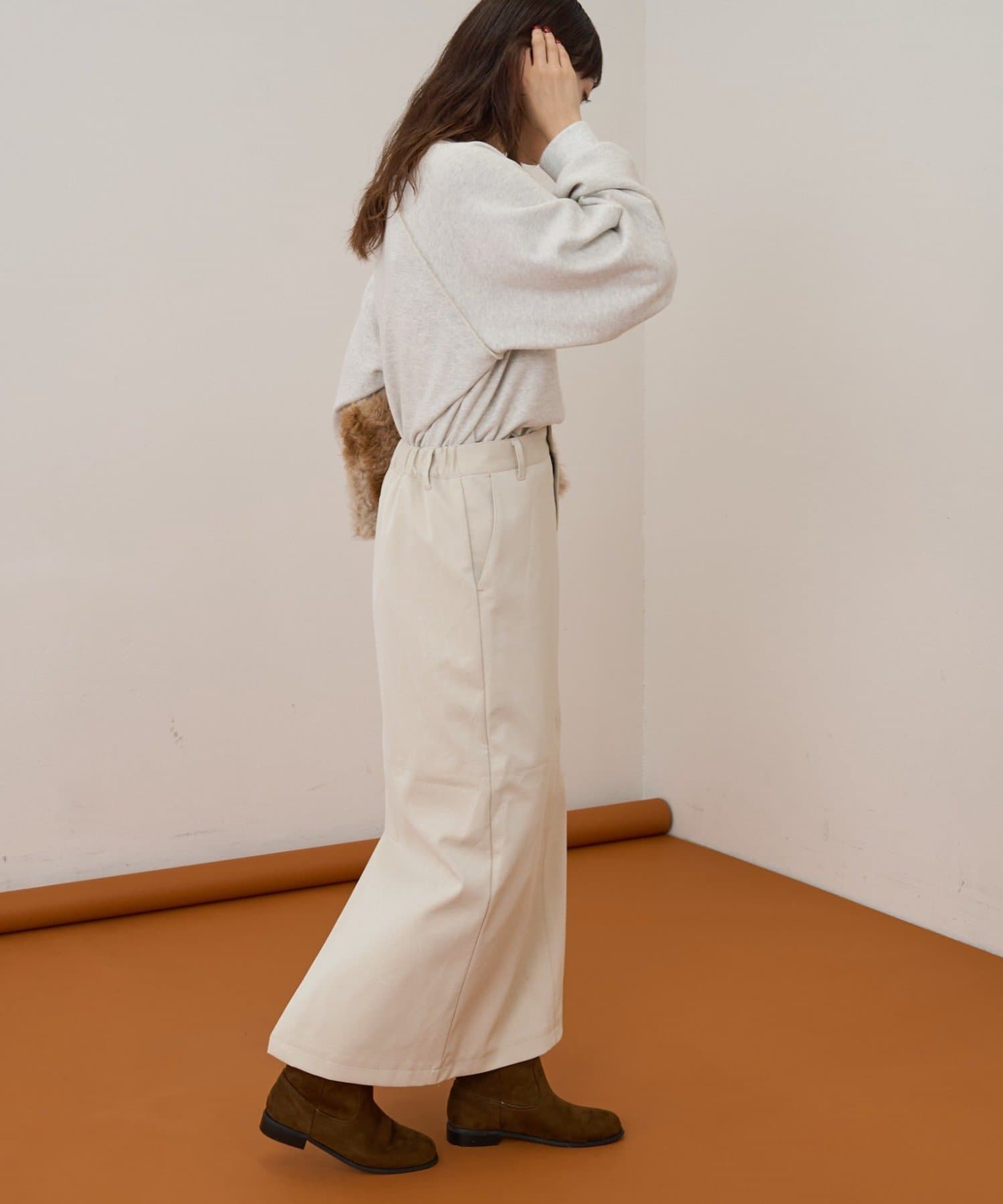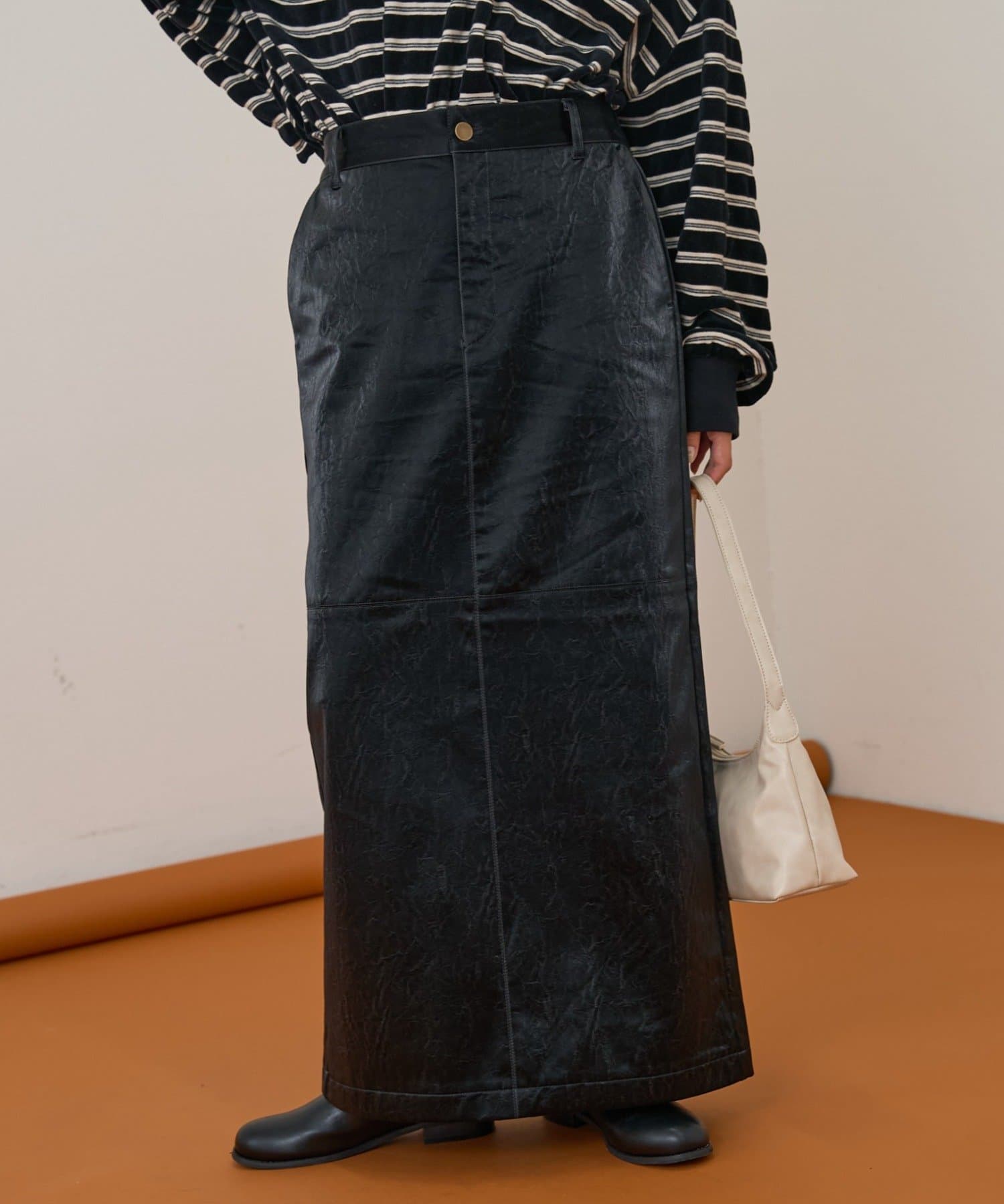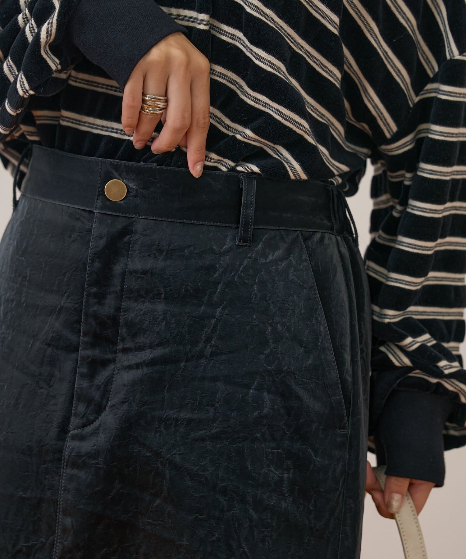 上品な光沢感とハリのあるフェイクレザーを使用した、ナローシルエットのスカート!