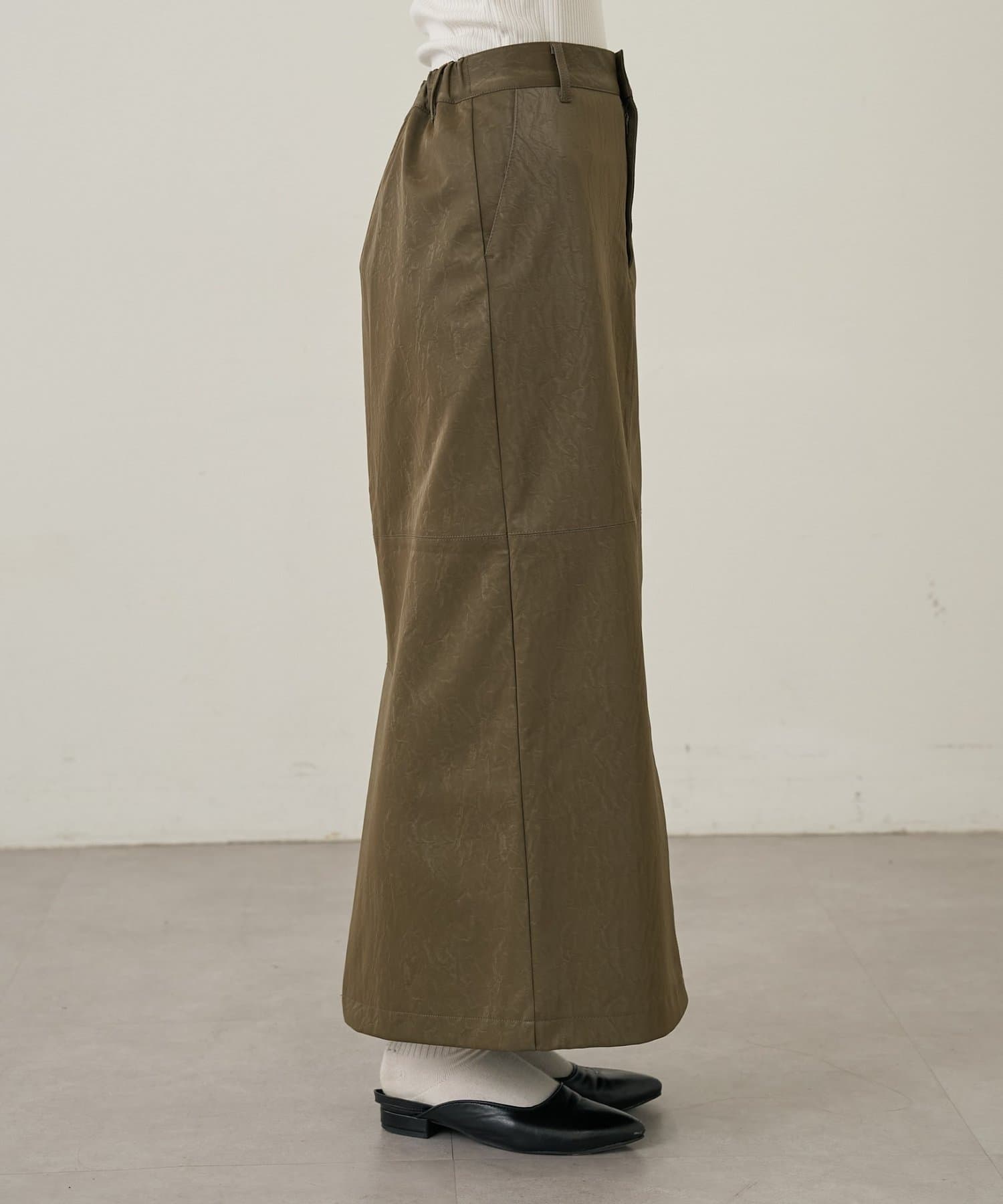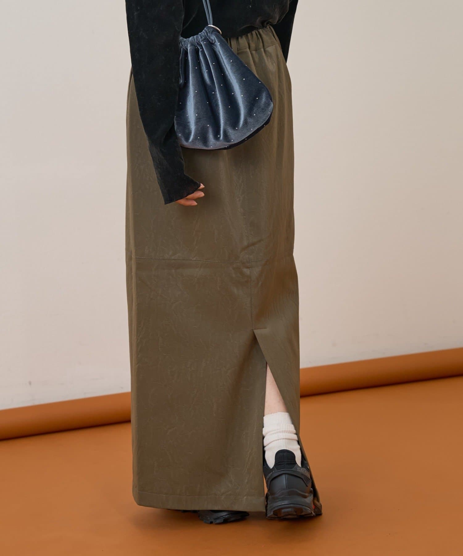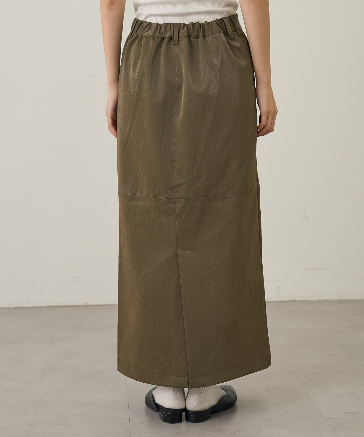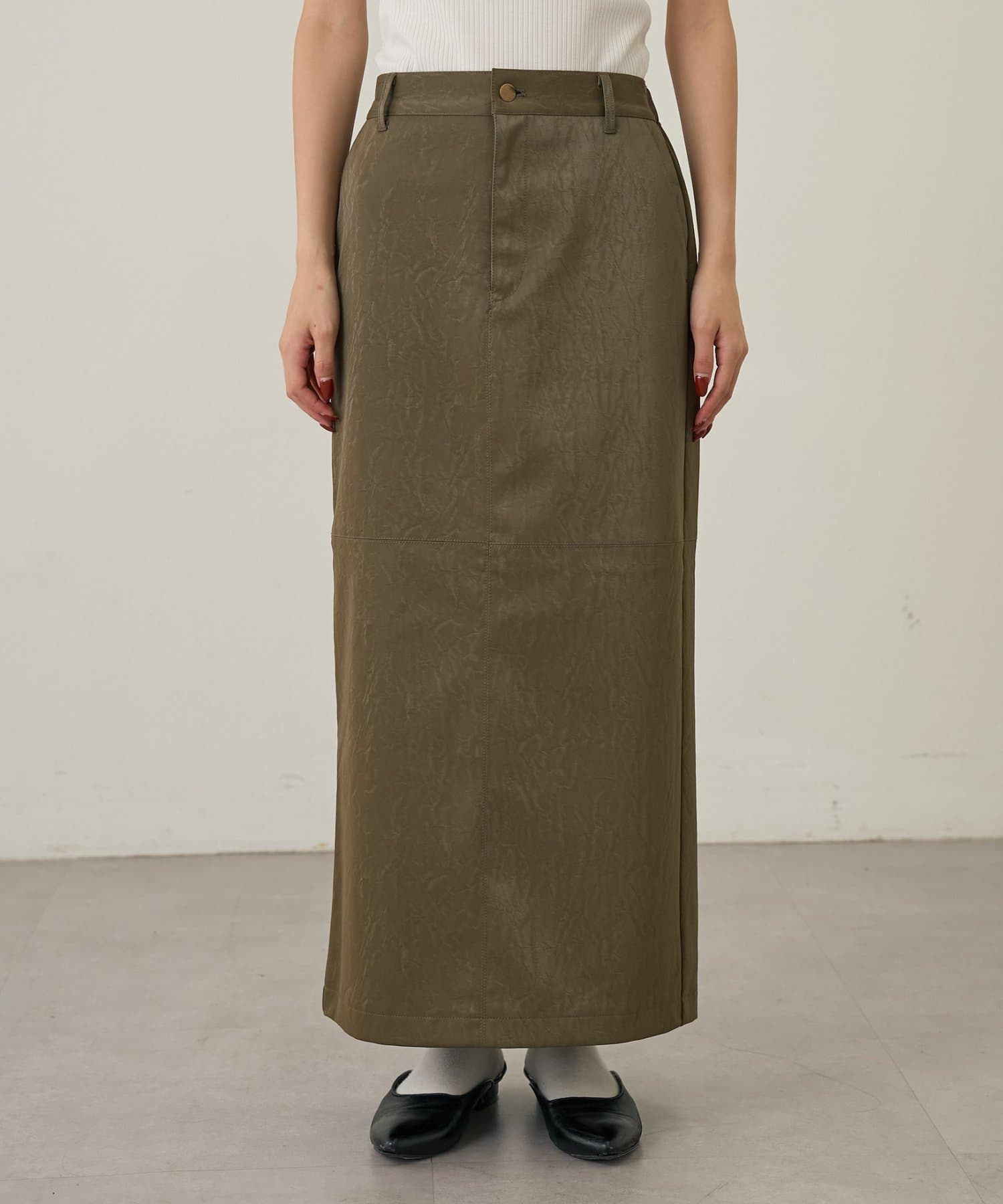上品な光沢感とハリのあるフェイクレザーを使用した、ナローシルエットのスカート!
