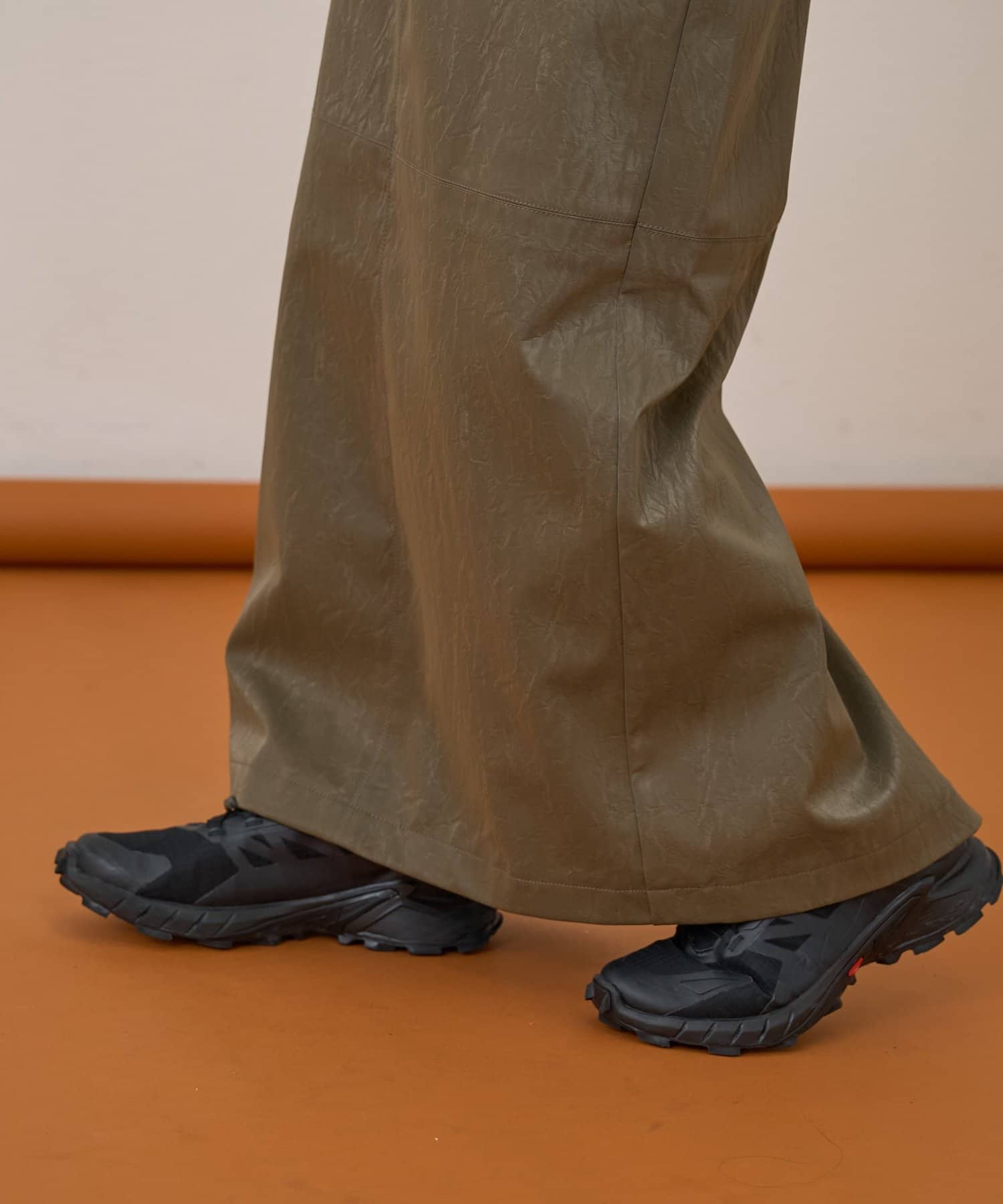 スウェットやオーバーサイズシャツと組み合わせると、レザーの質感が引き立ってラフなコーデもぐっと洒落見え◎