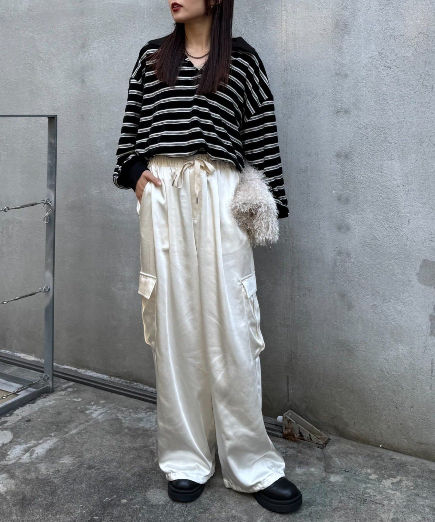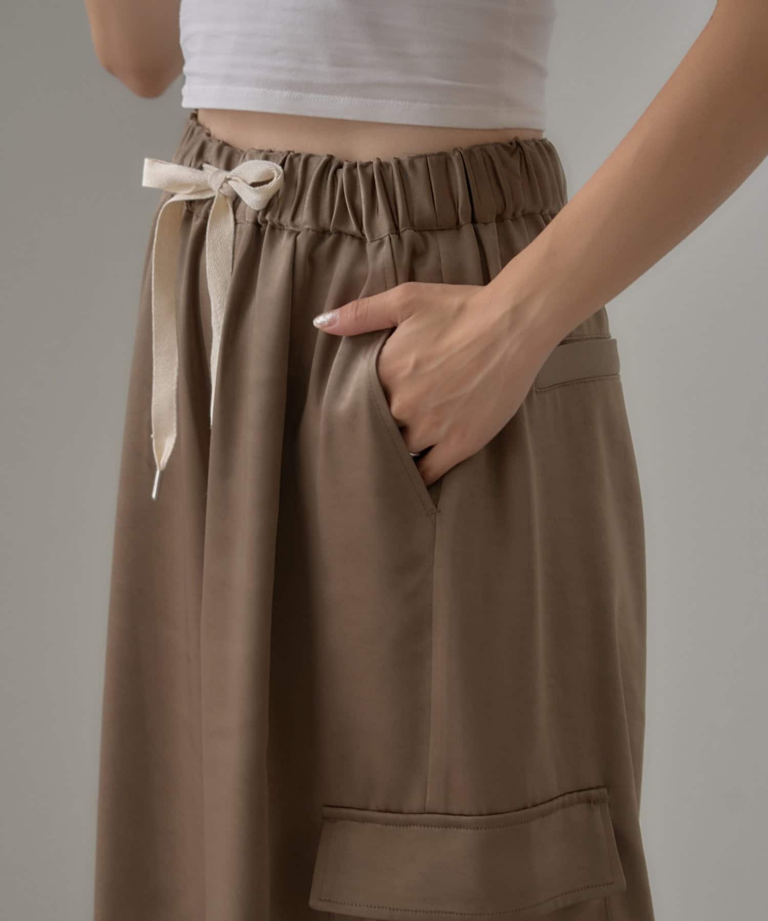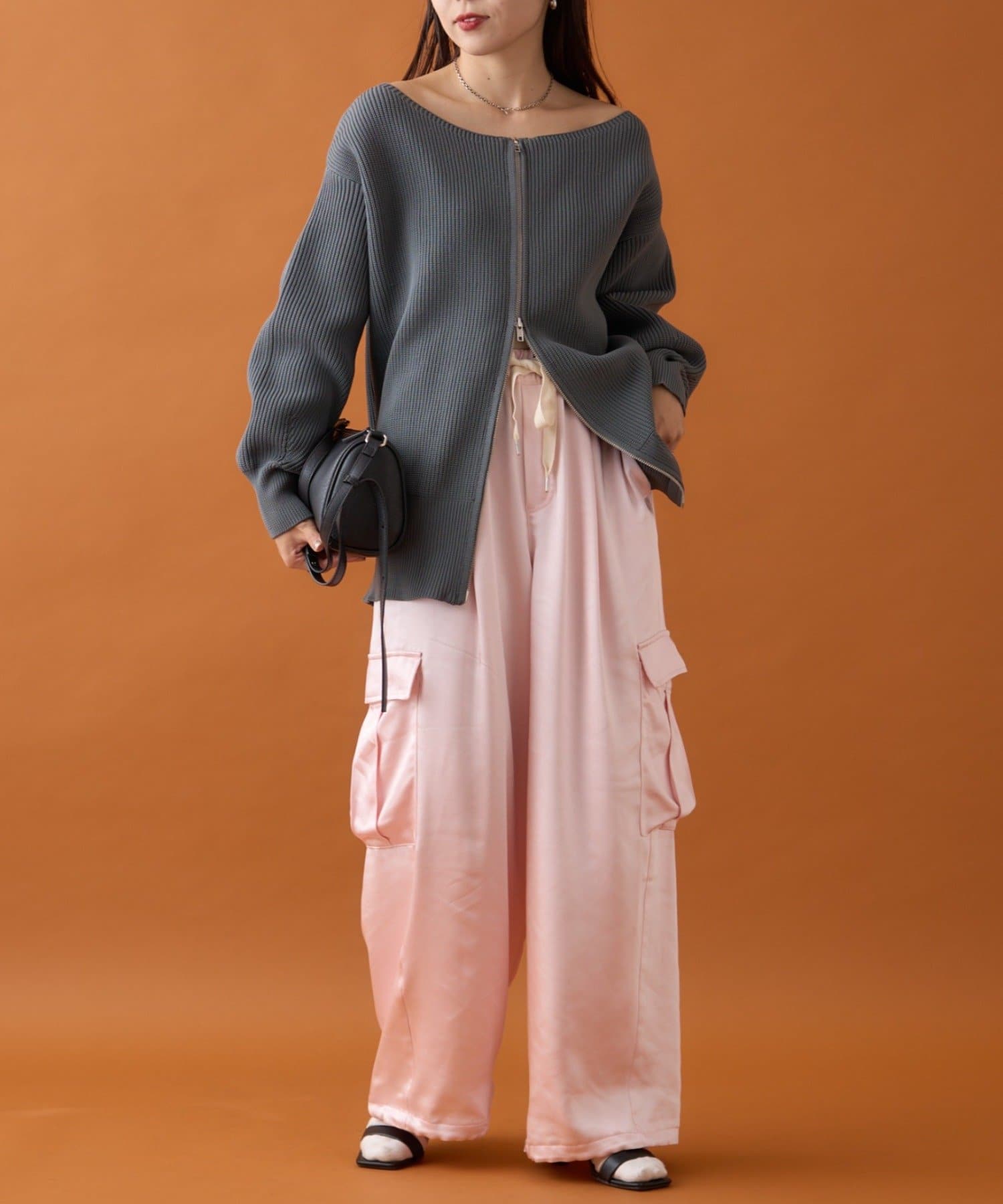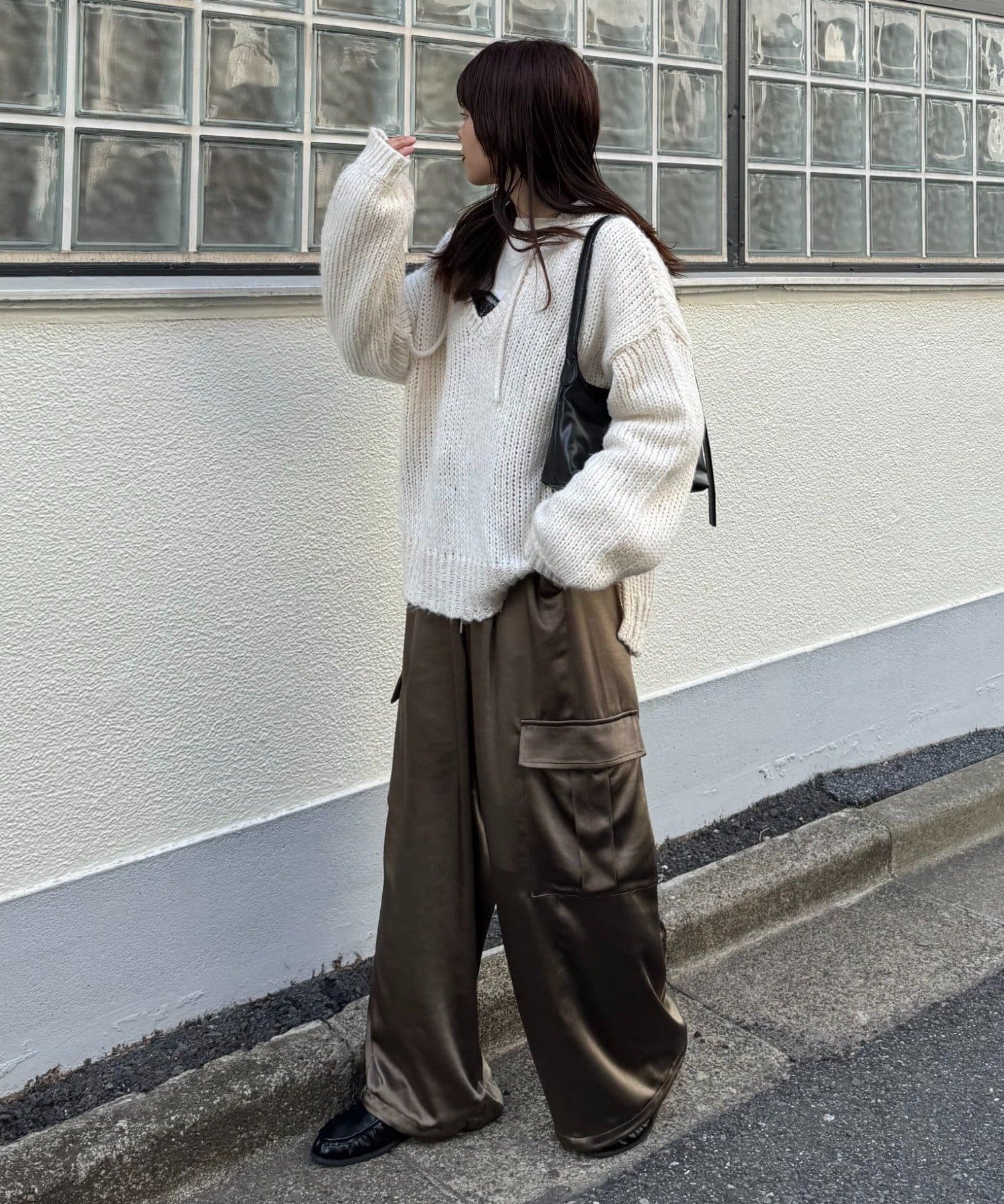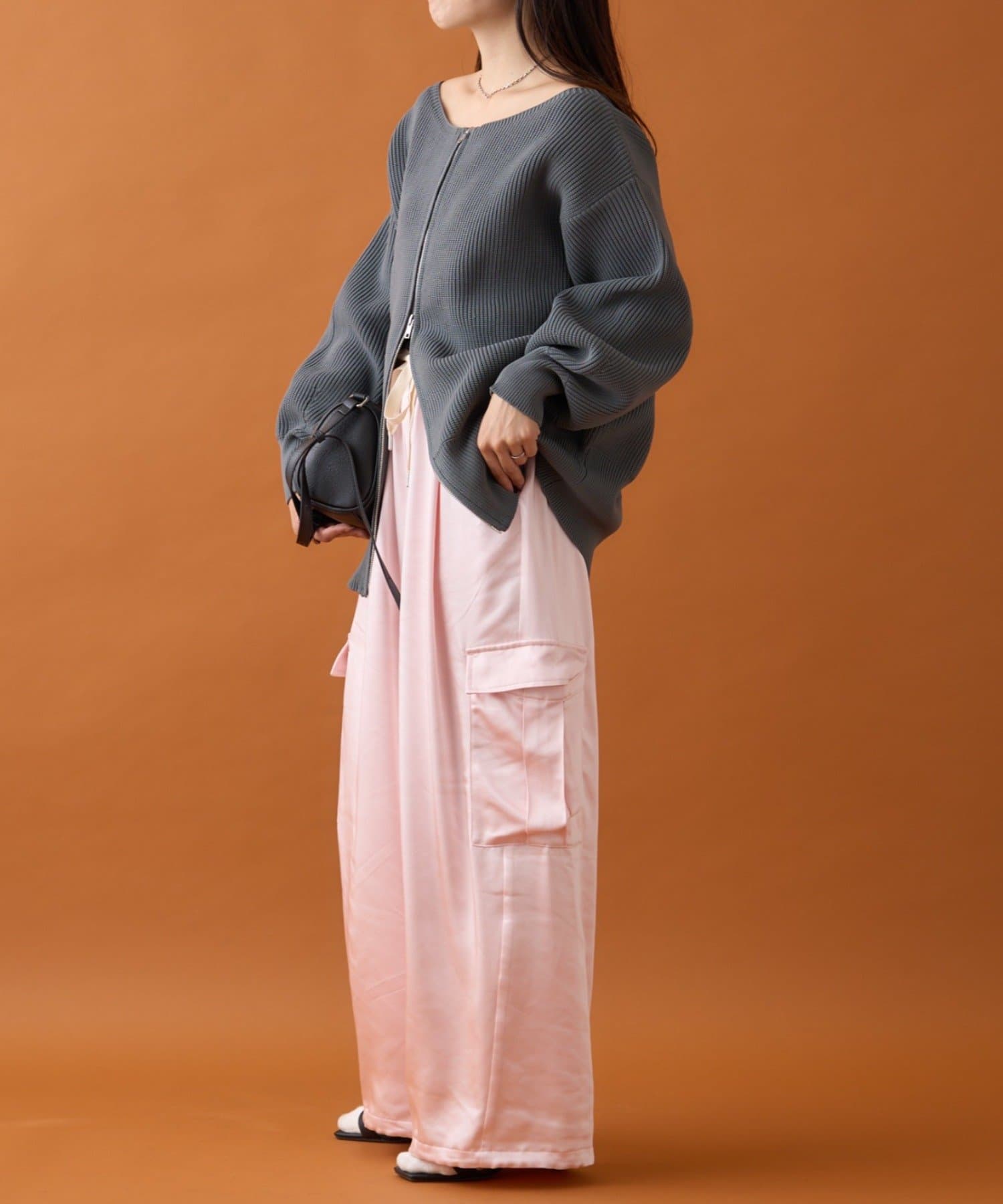 上品な光沢感が女性らしさを演出してくれるカーゴパンツが登場。