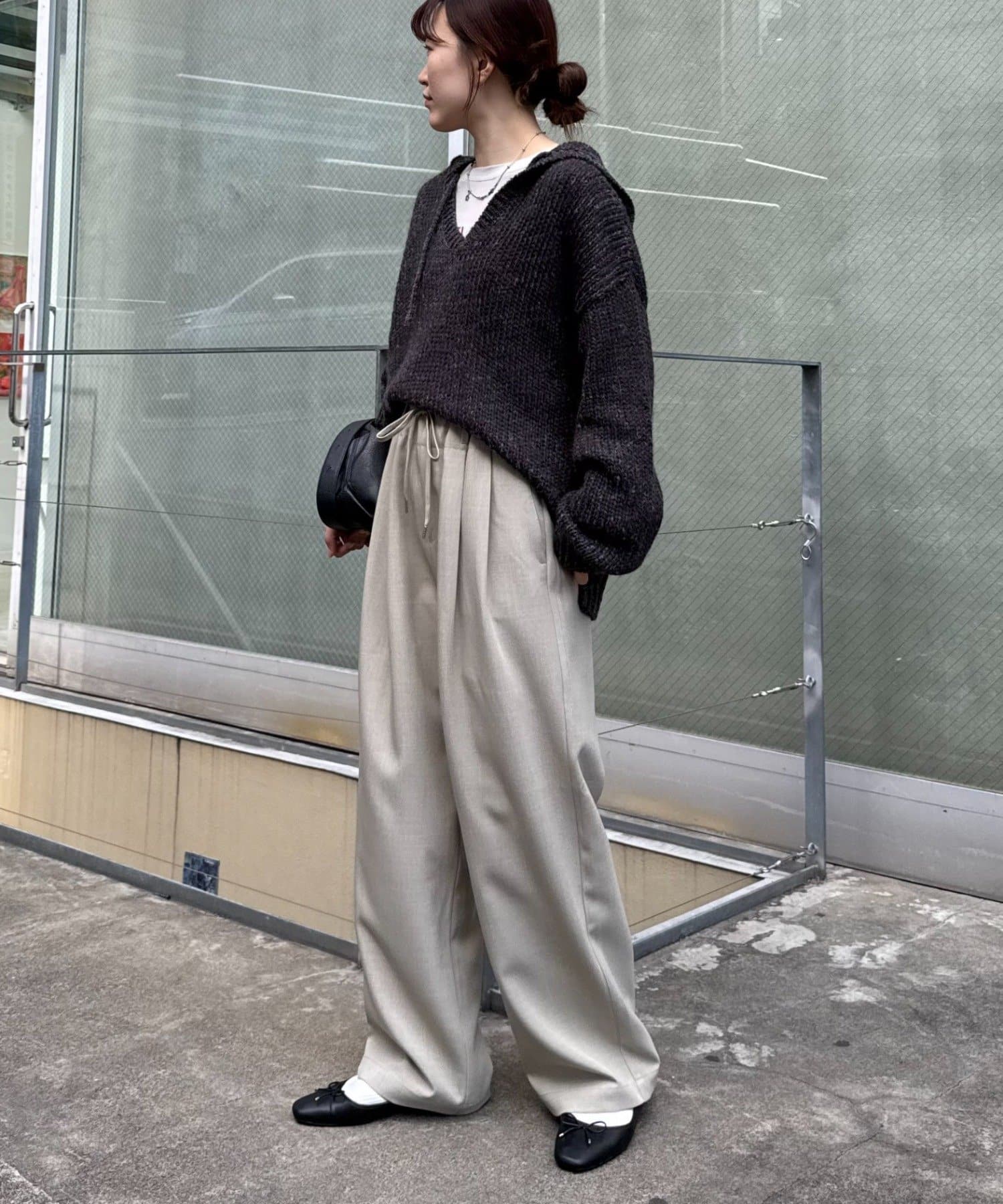 ワイドシルエットなので足元はスニーカーでラフにまとめても、ローファーやブーツで上品に格上げしても相性抜群。