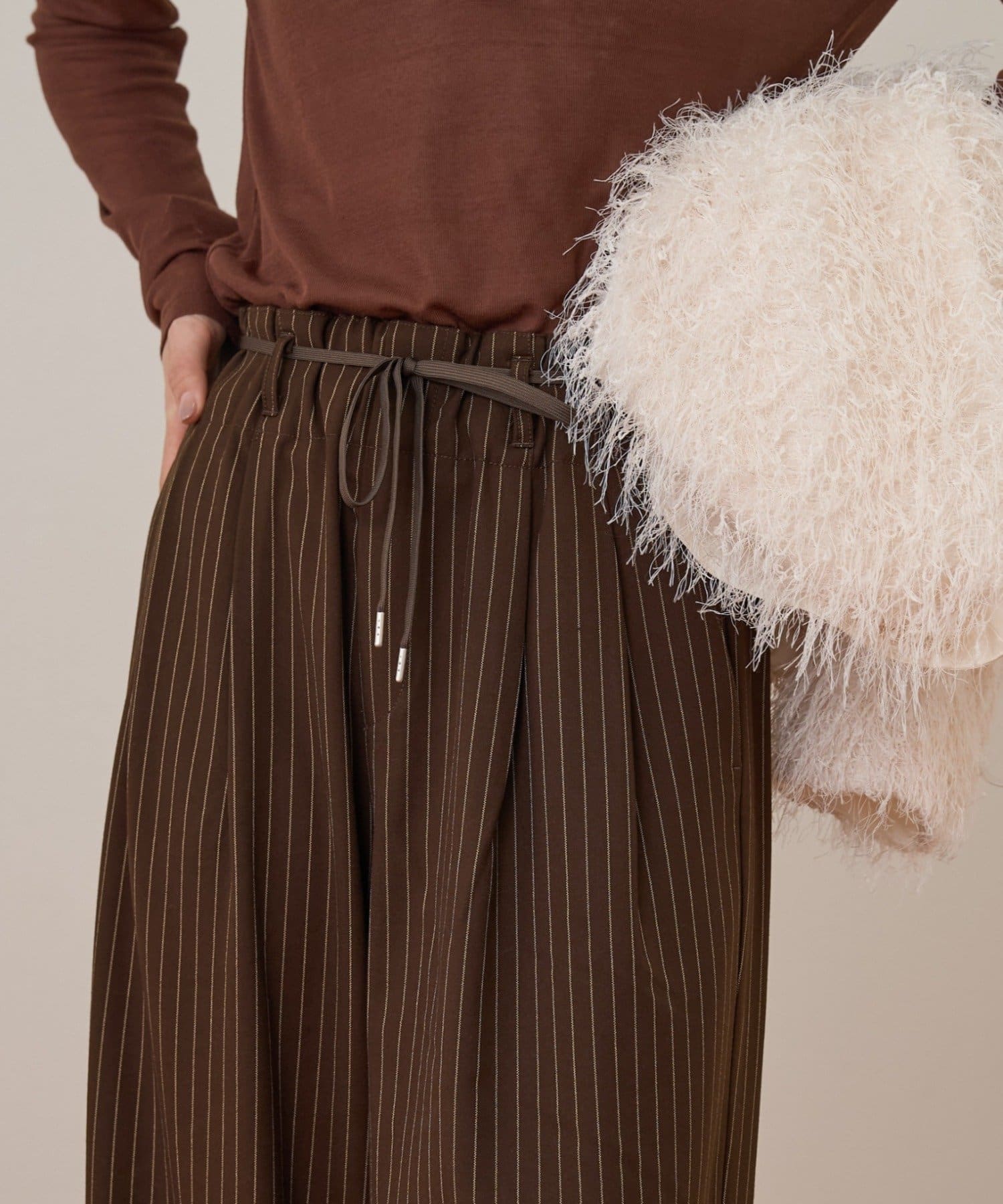 コンパクトなトップスに合わせて、紐ベルトでウエストをキュッと締めると今っぽいメリハリあるバランスに。
