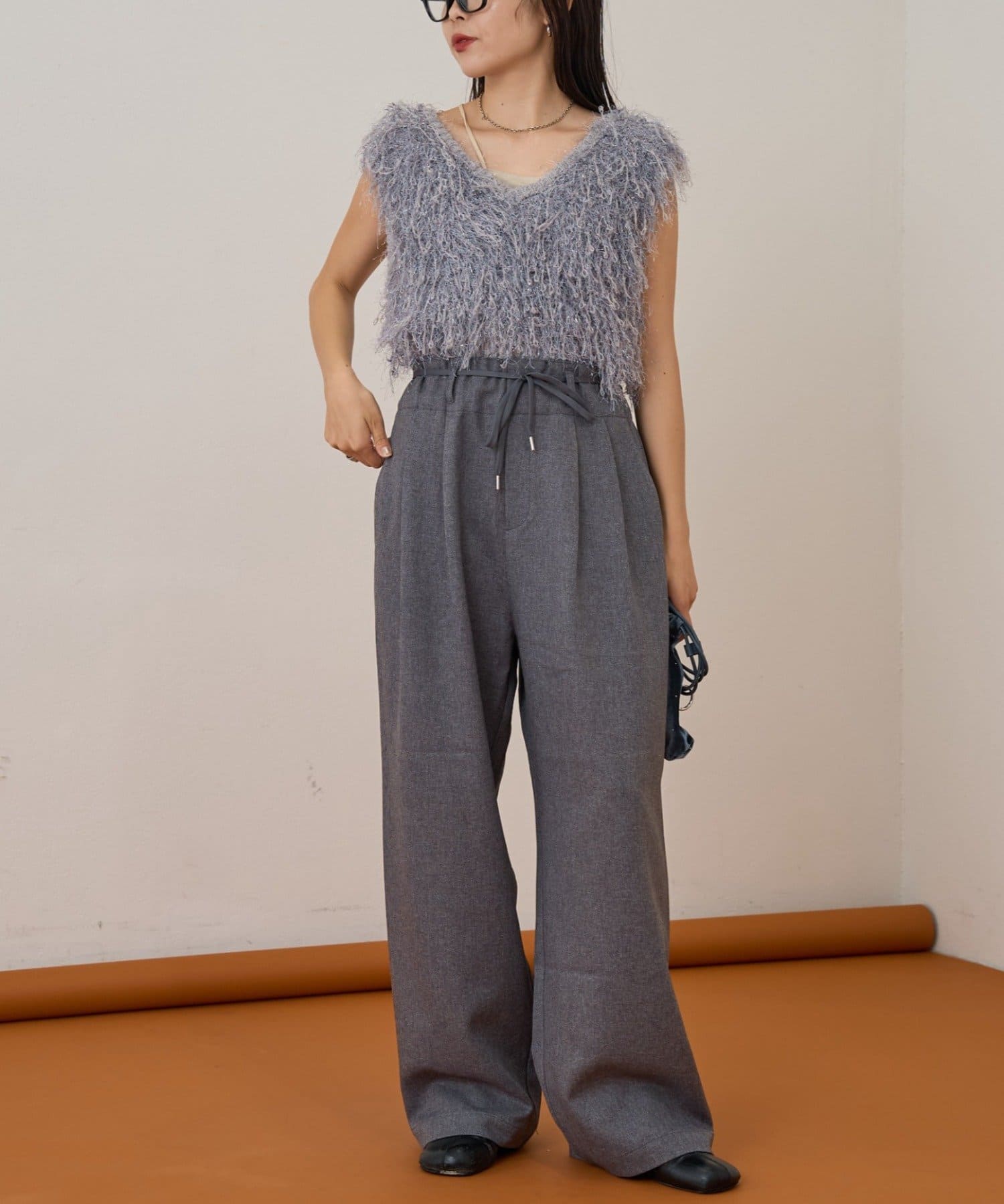 コンパクトなトップスに合わせて、紐ベルトでウエストをキュッと締めると今っぽいメリハリあるバランスに。
