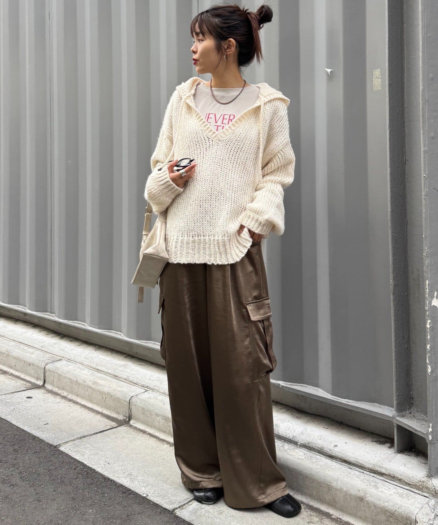 インナーにシアートップスやロンTを重ねると奥行きが出て一気に今っぽい印象に仕上がります◎