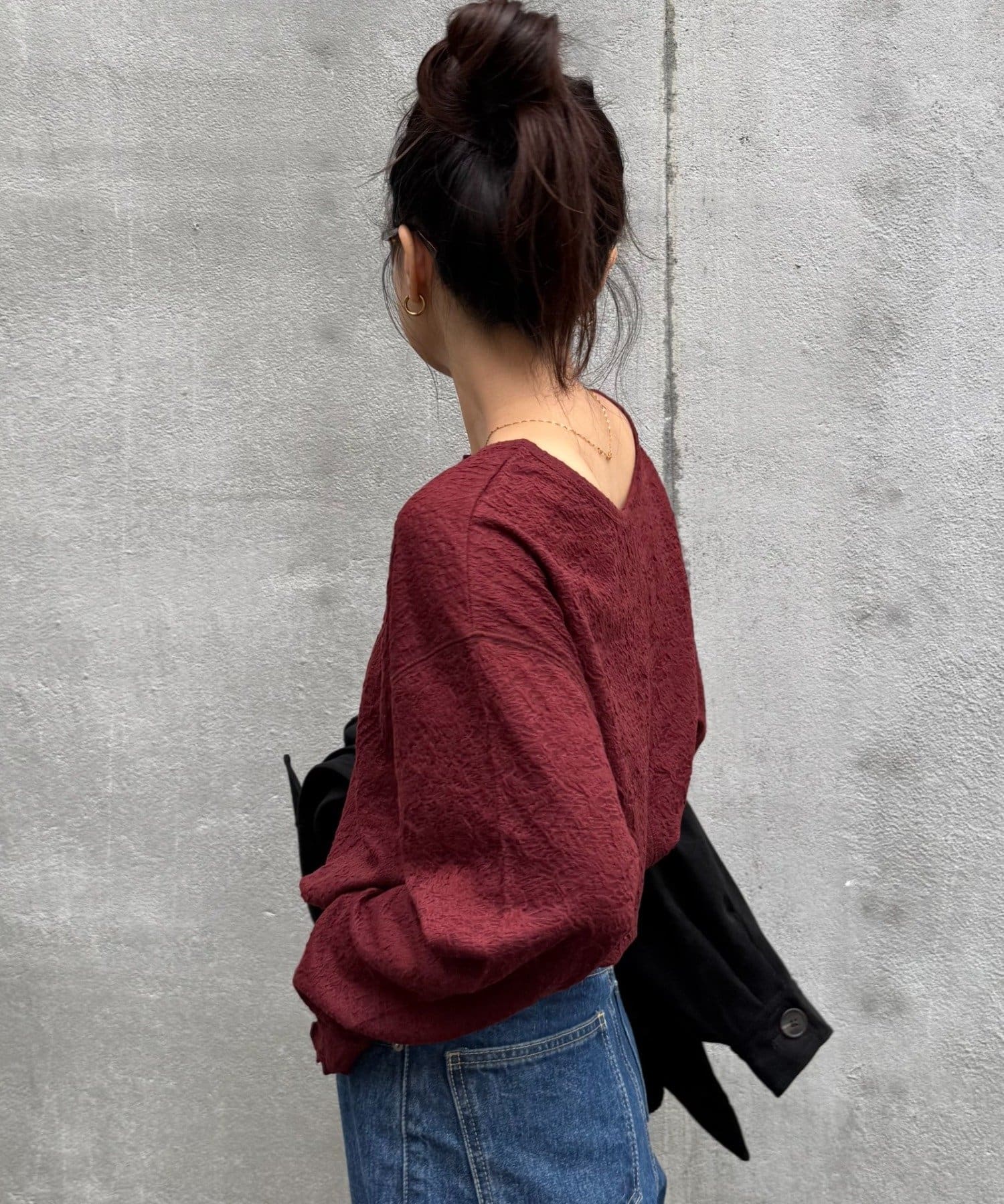 ジャガードの素材感が映えるので、1枚で着てもサマ見えするスタイルに。