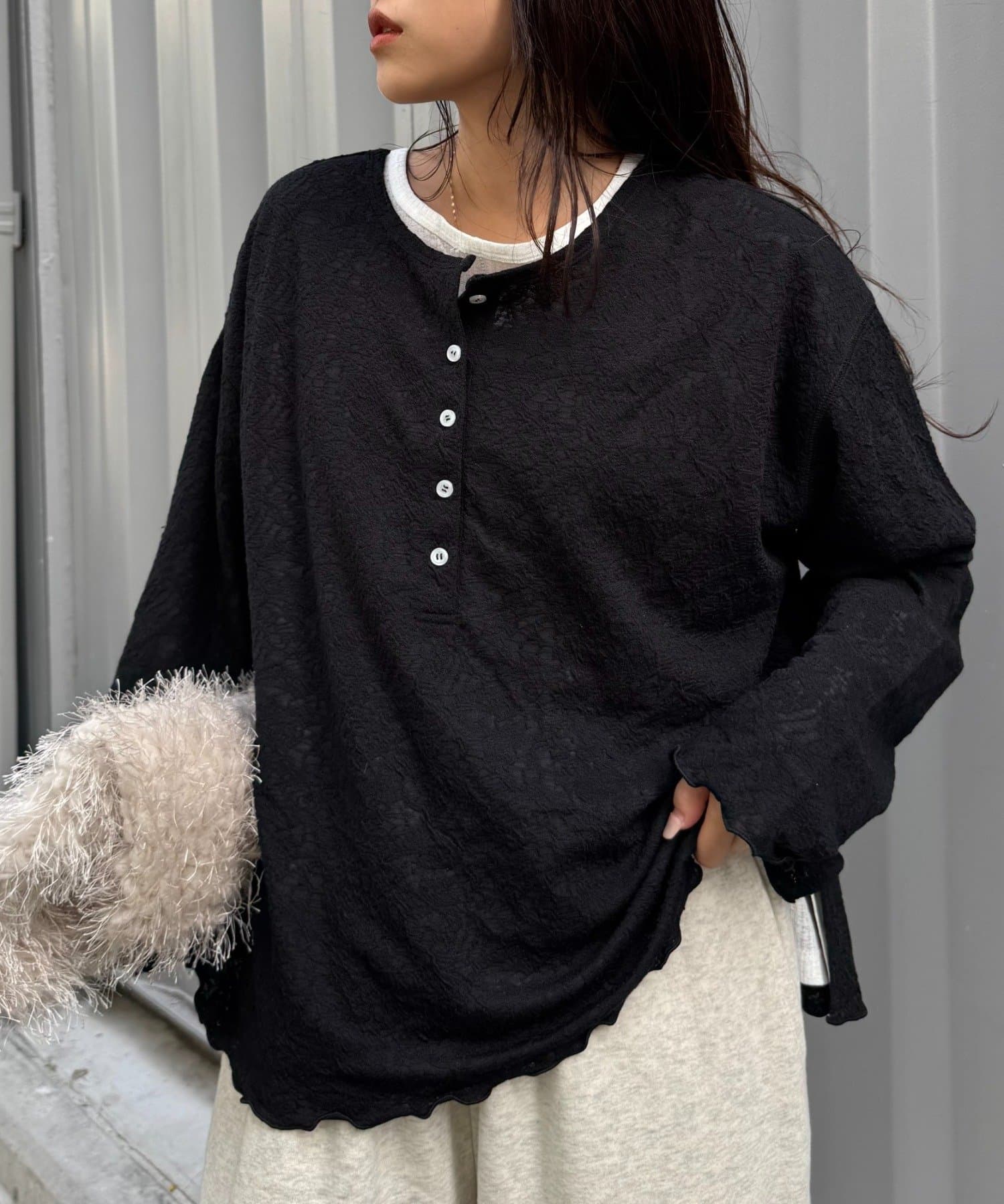 ジャガード織りならではの立体的な模様がポイントのヘンリーネックTee