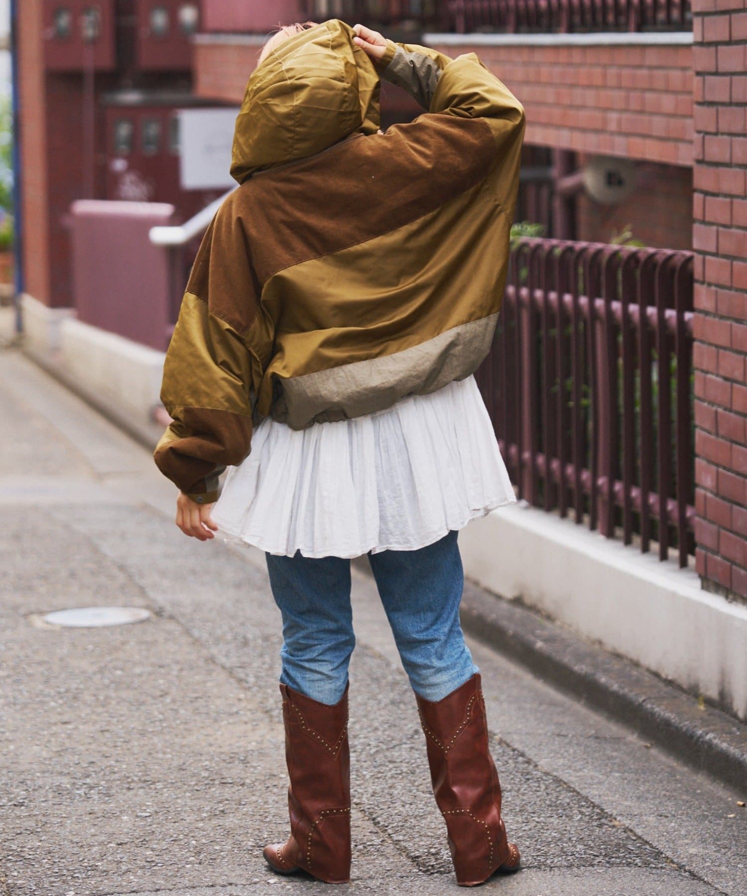 デニムやパンツと合わせたカジュアルスタイルで、こなれ感を演出。