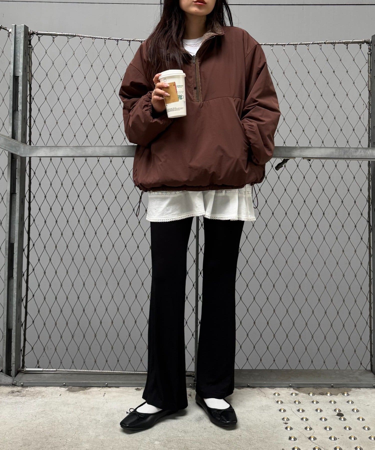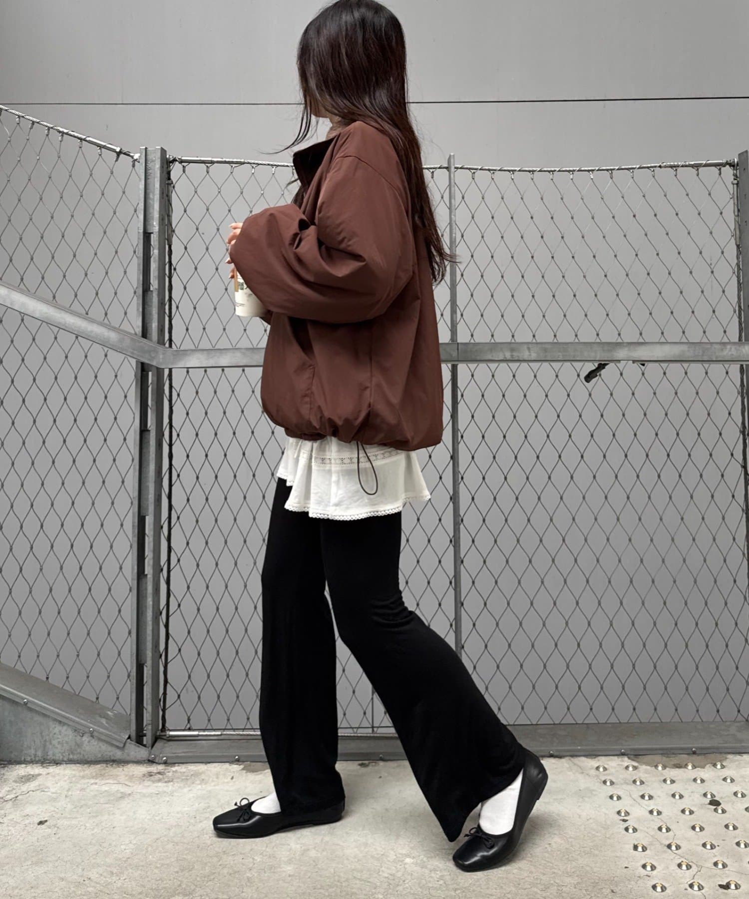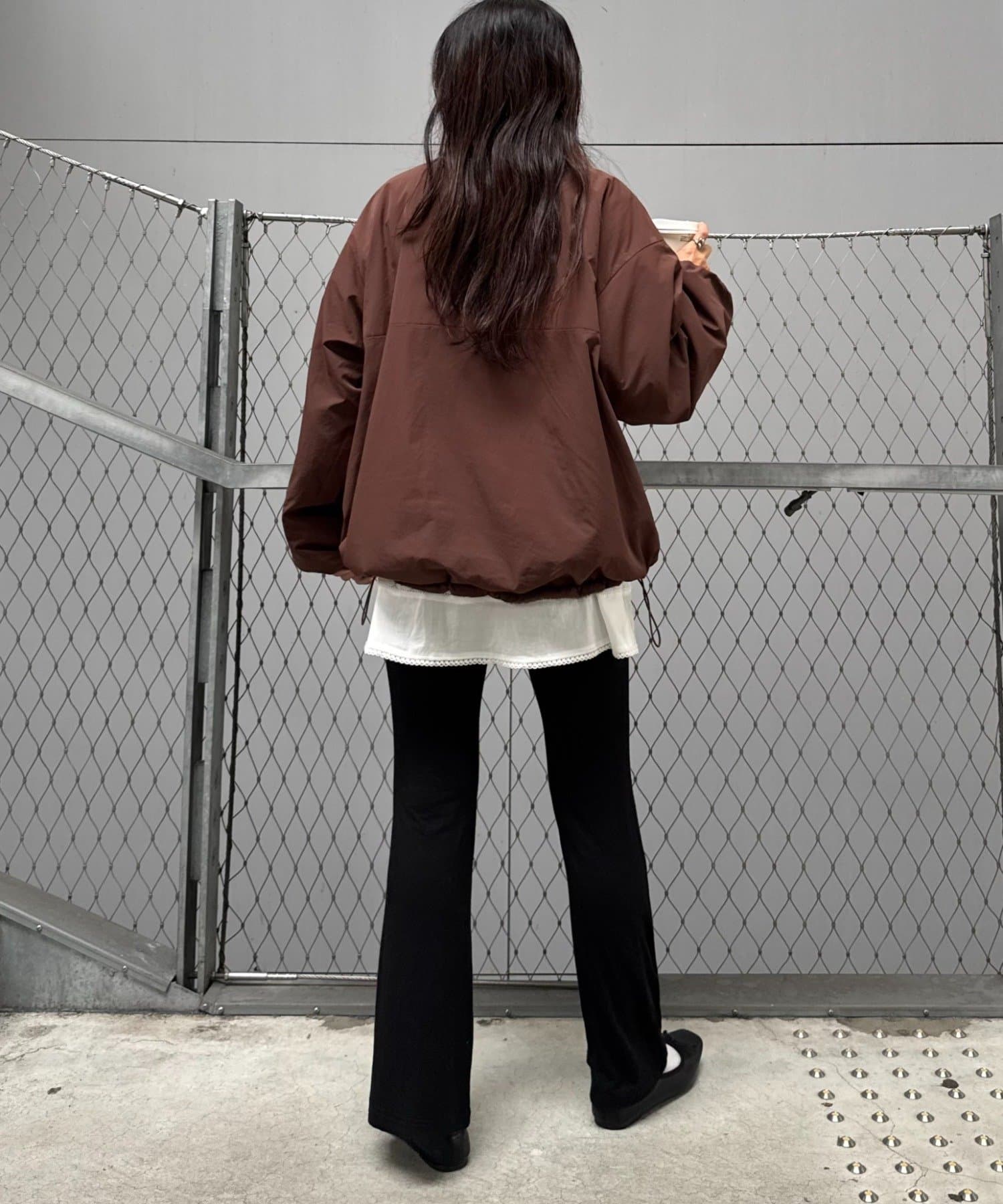 裾サイドにはドローコードが付いているので、シルエットを絞って着こなしに変化をつけられます。