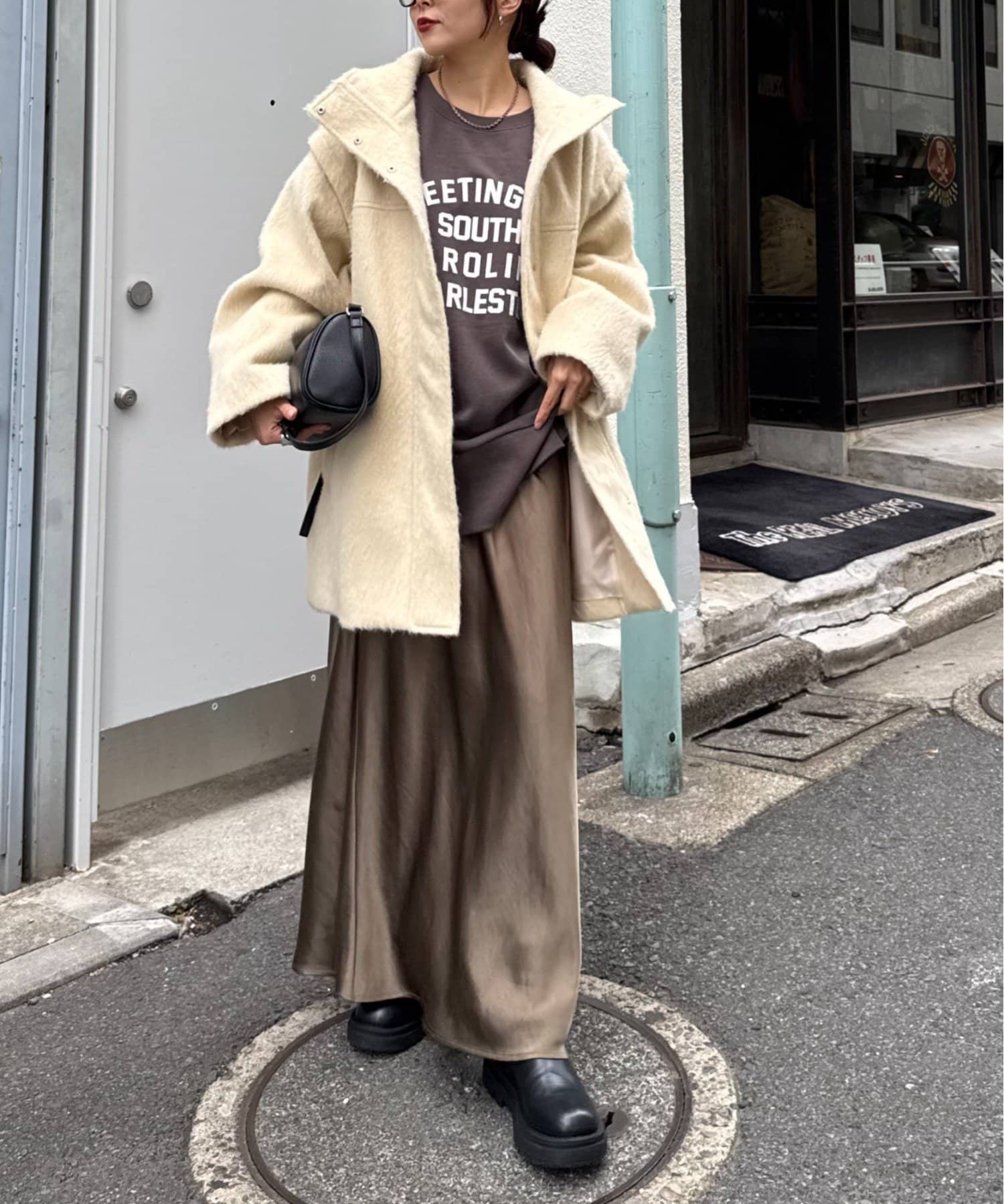 ボリュームのあるシルエットなので、ストレートやフレアのボトムと合わせるとバランス◎