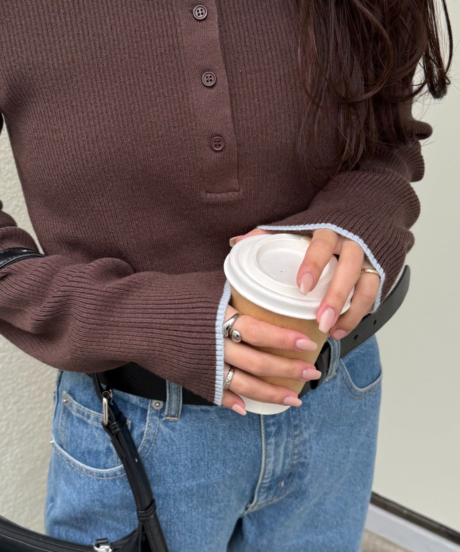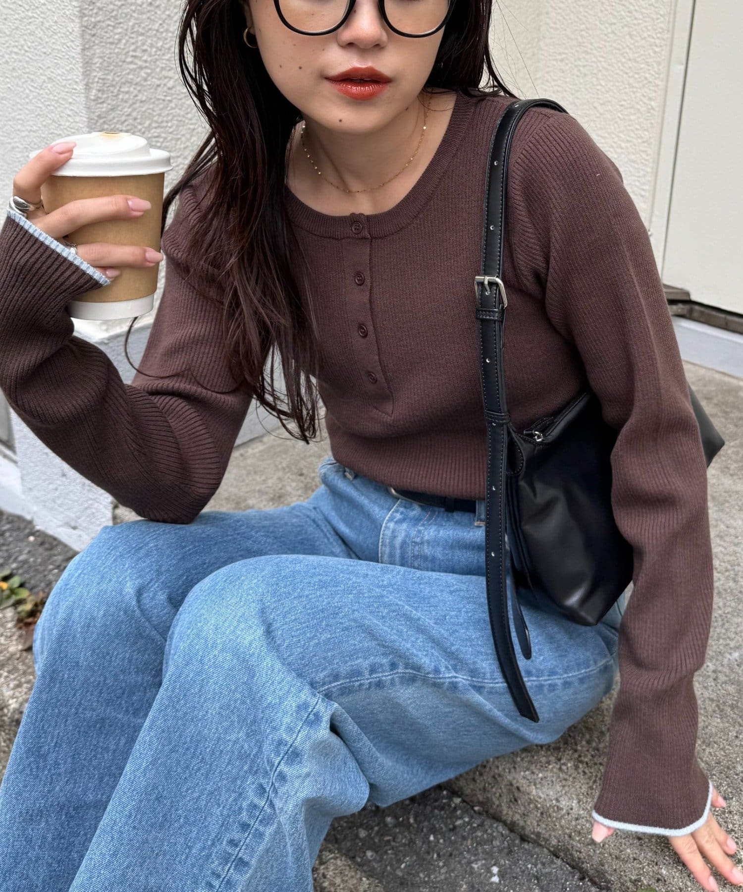ヘンリーネックにさりげない袖の配色が程よいお洒落さを演出。