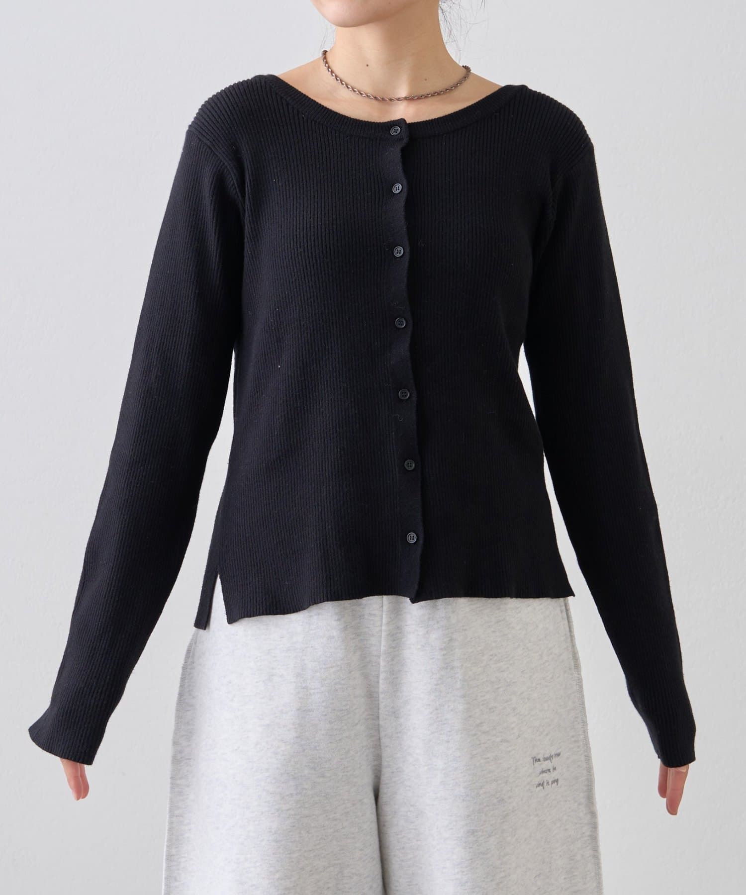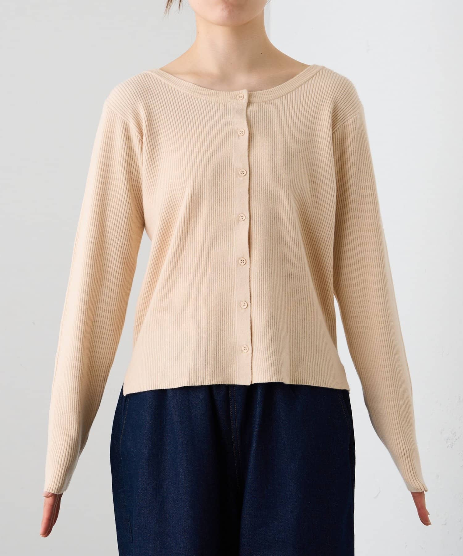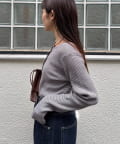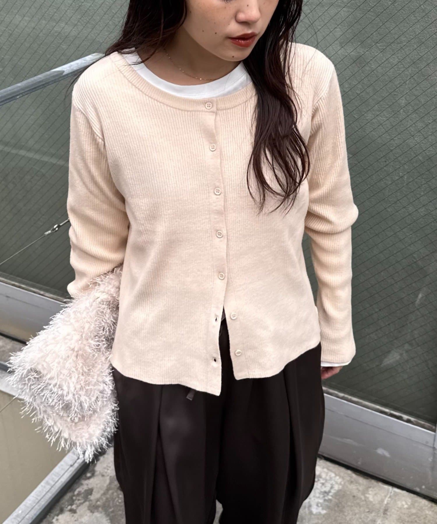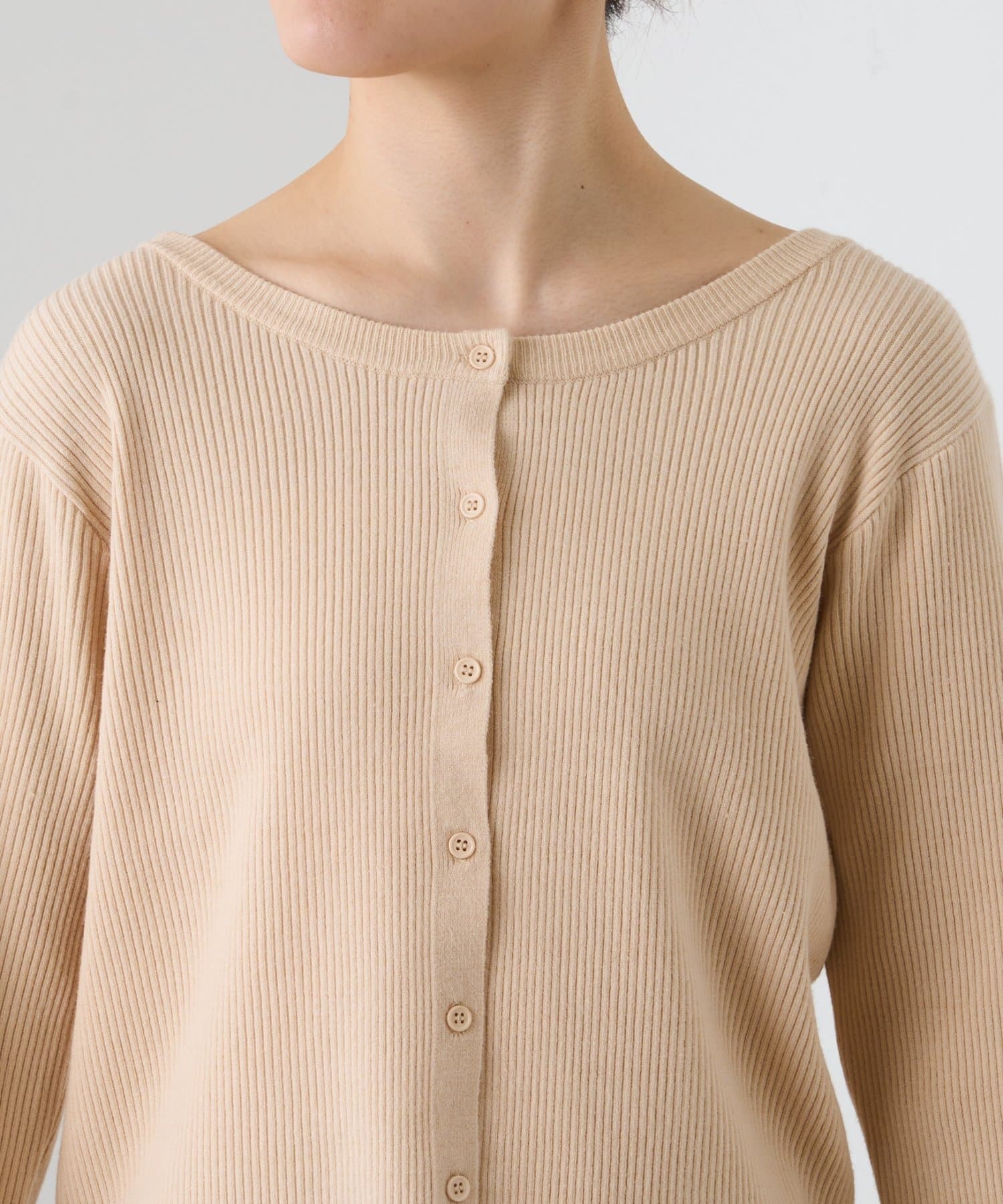 ボタンを前にしてカーデとしても、後ろにしてプルオーバー風にも着こなせる