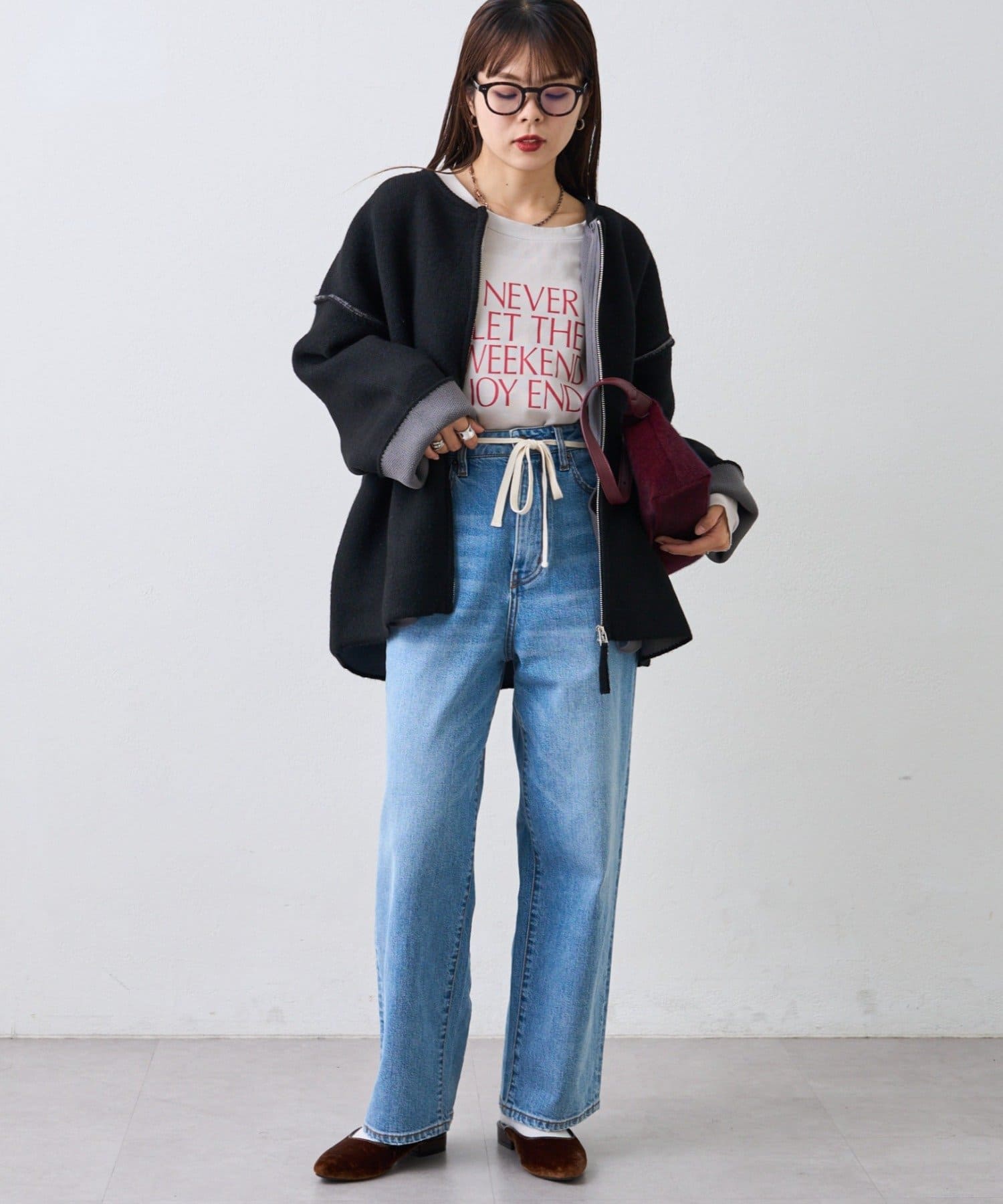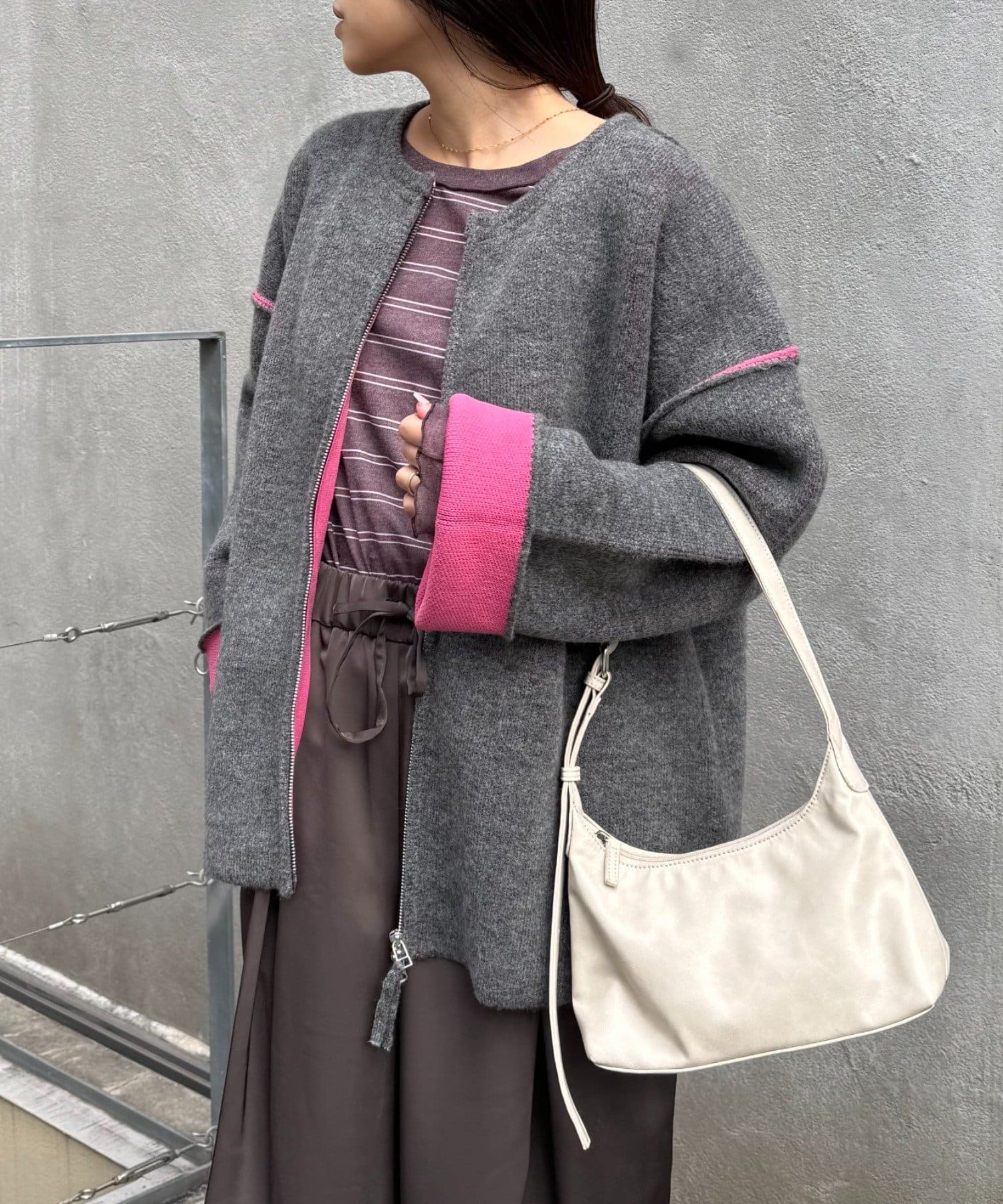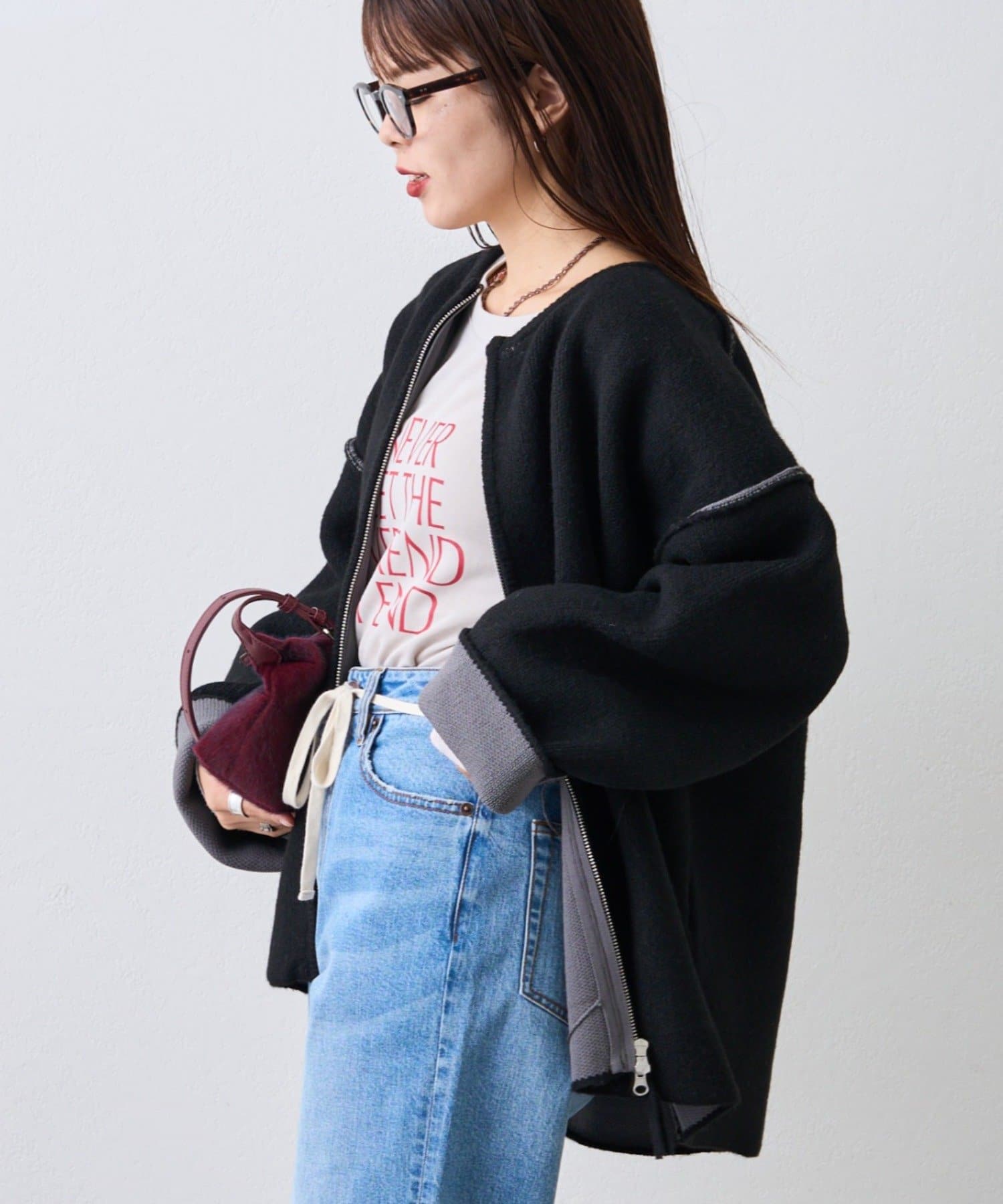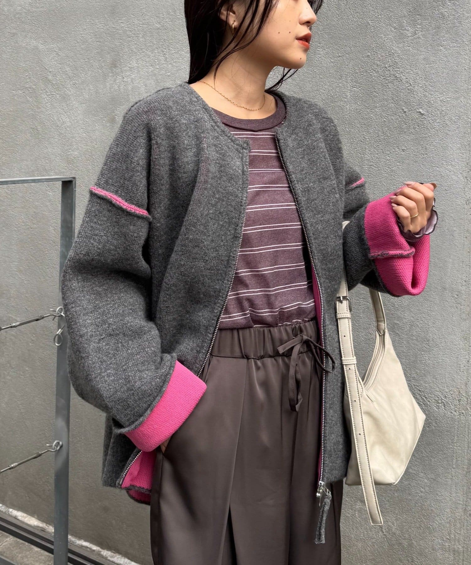 ジップを閉めてコンパクトにまとめればきれいめカジュアルに、