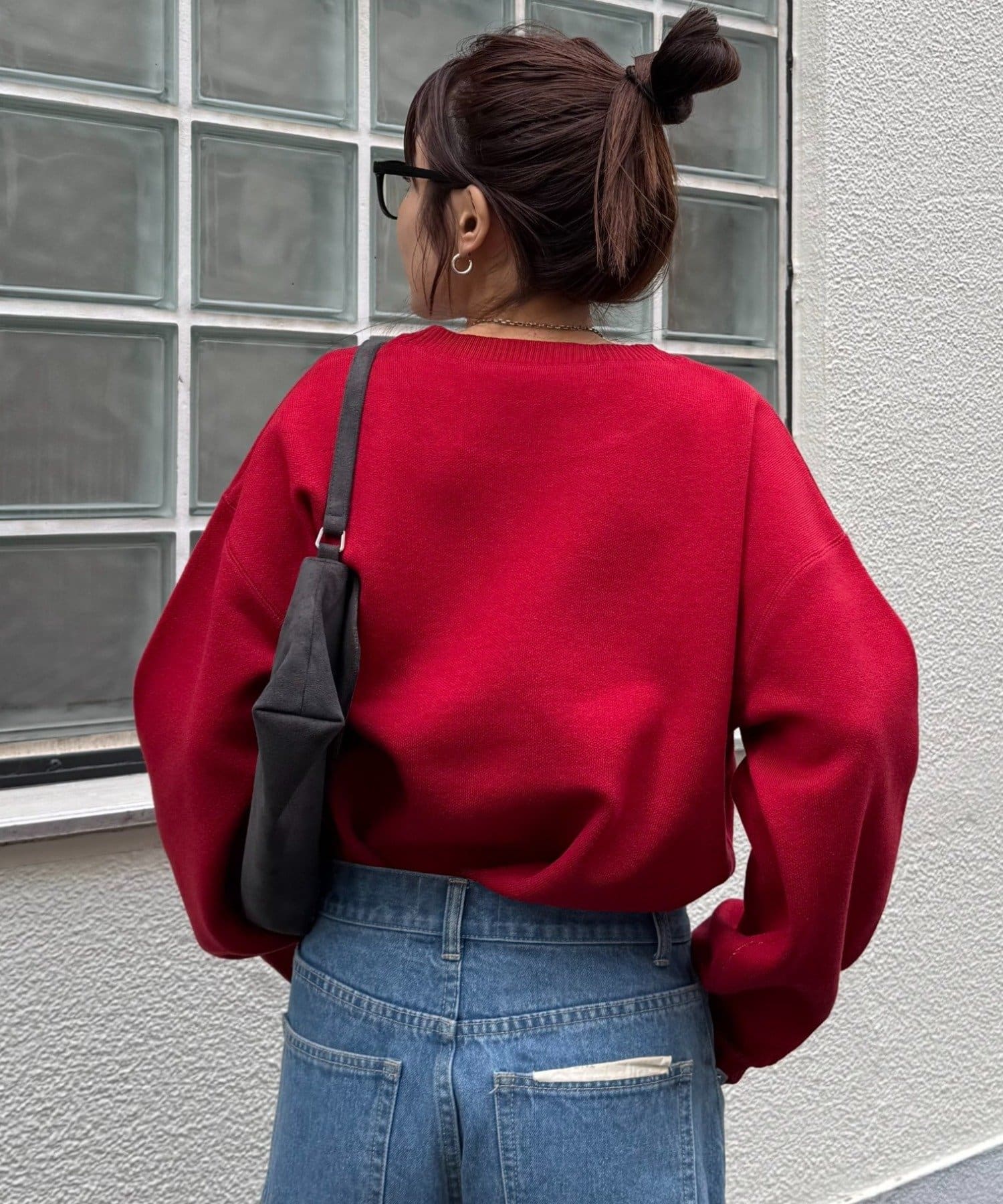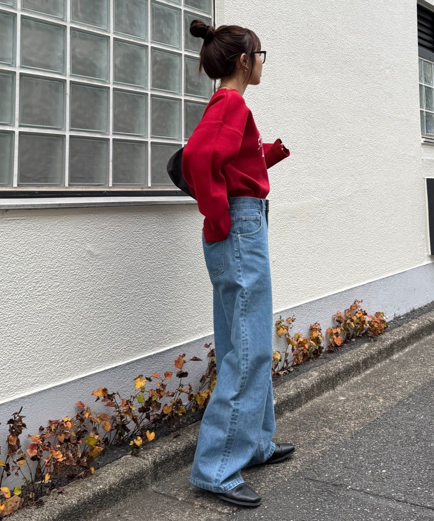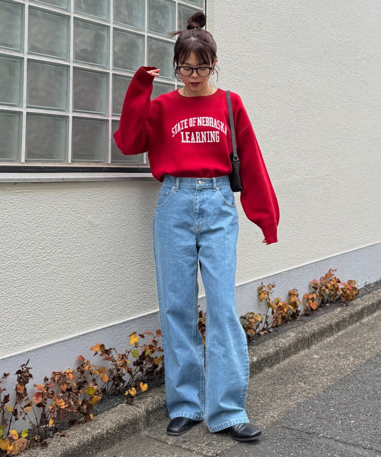 定番デニム×スウェットも、ニット素材でこなれた雰囲気に!