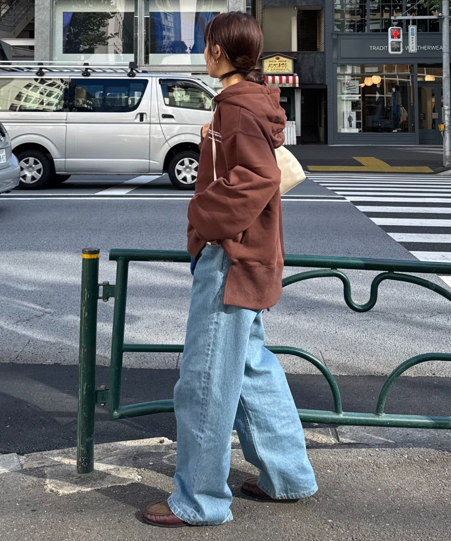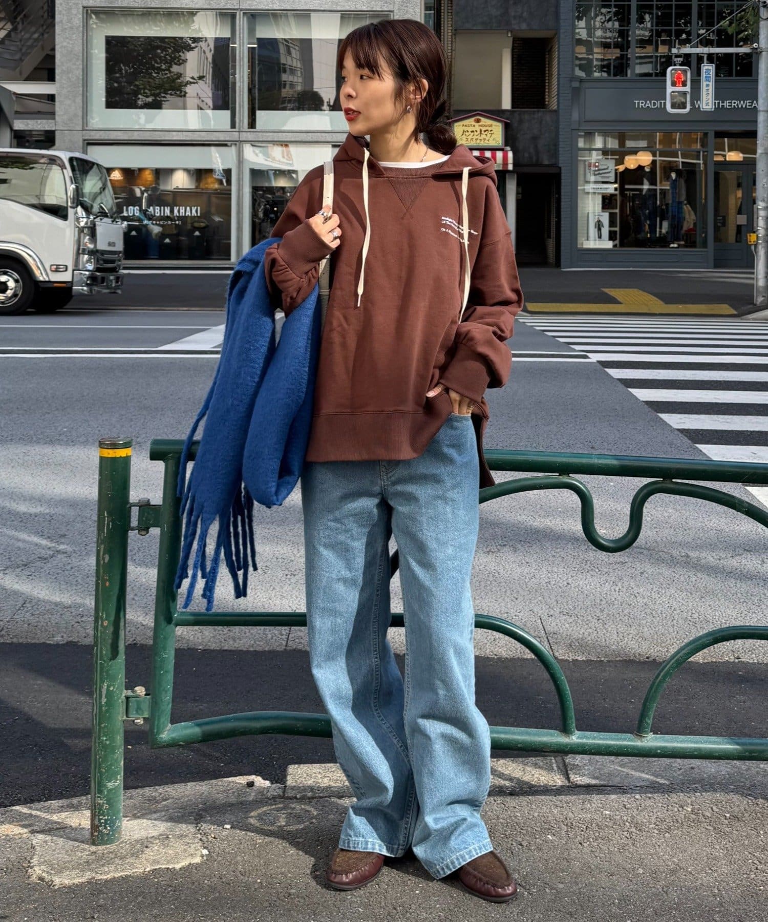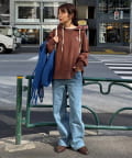 ボリュームのあるスウェットは、ストレートなパンツやスカートを合わせてバランスよく。