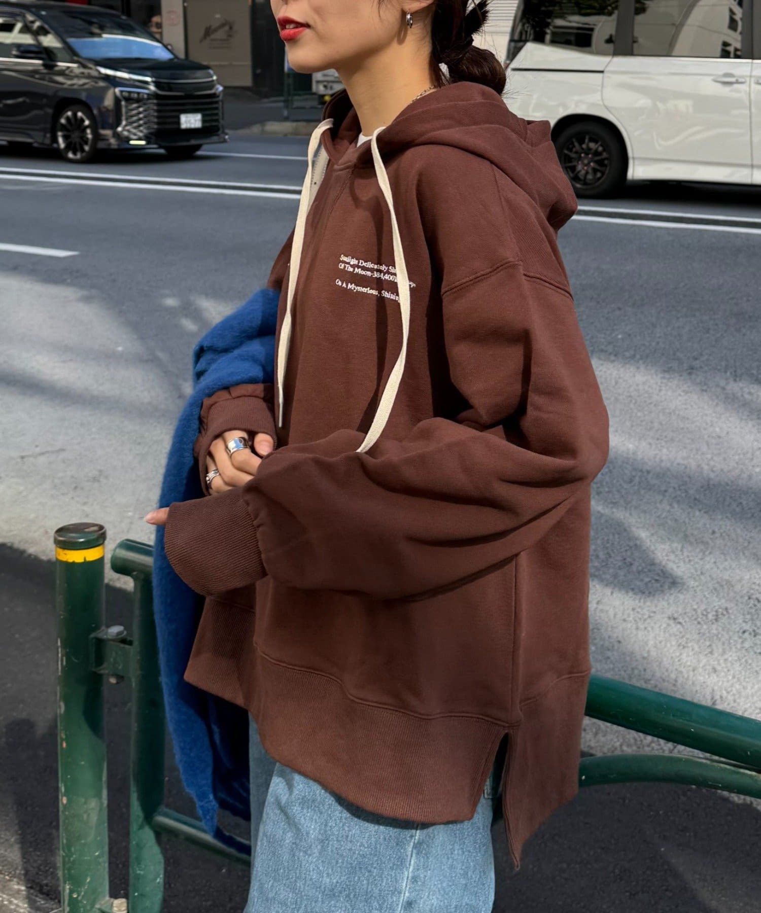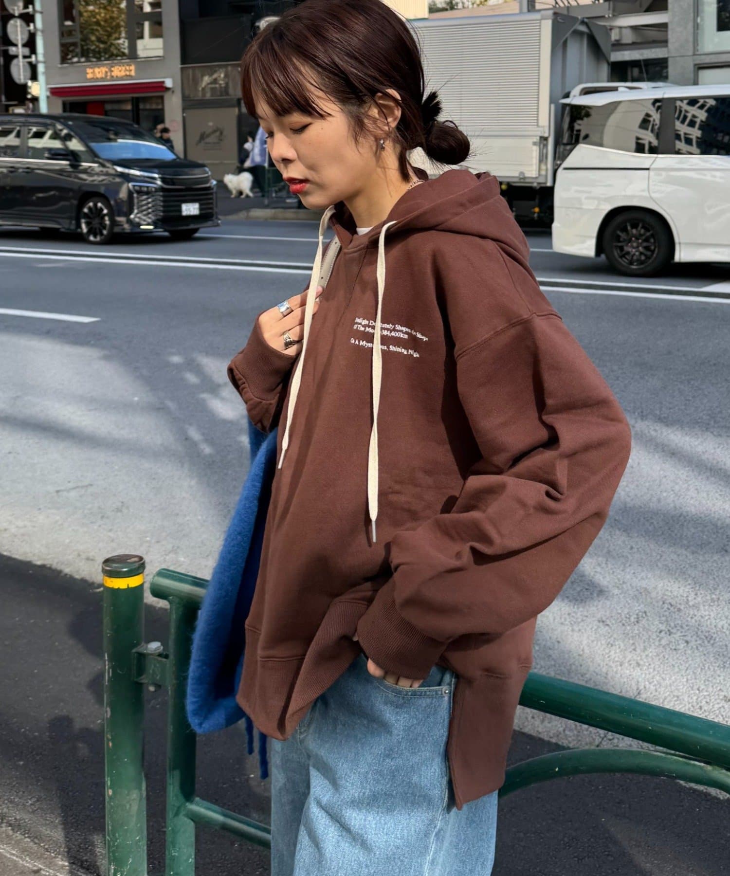 胸元のメッセージ刺繍がアクセントになった、シンプルながらも着映えするフーディー!