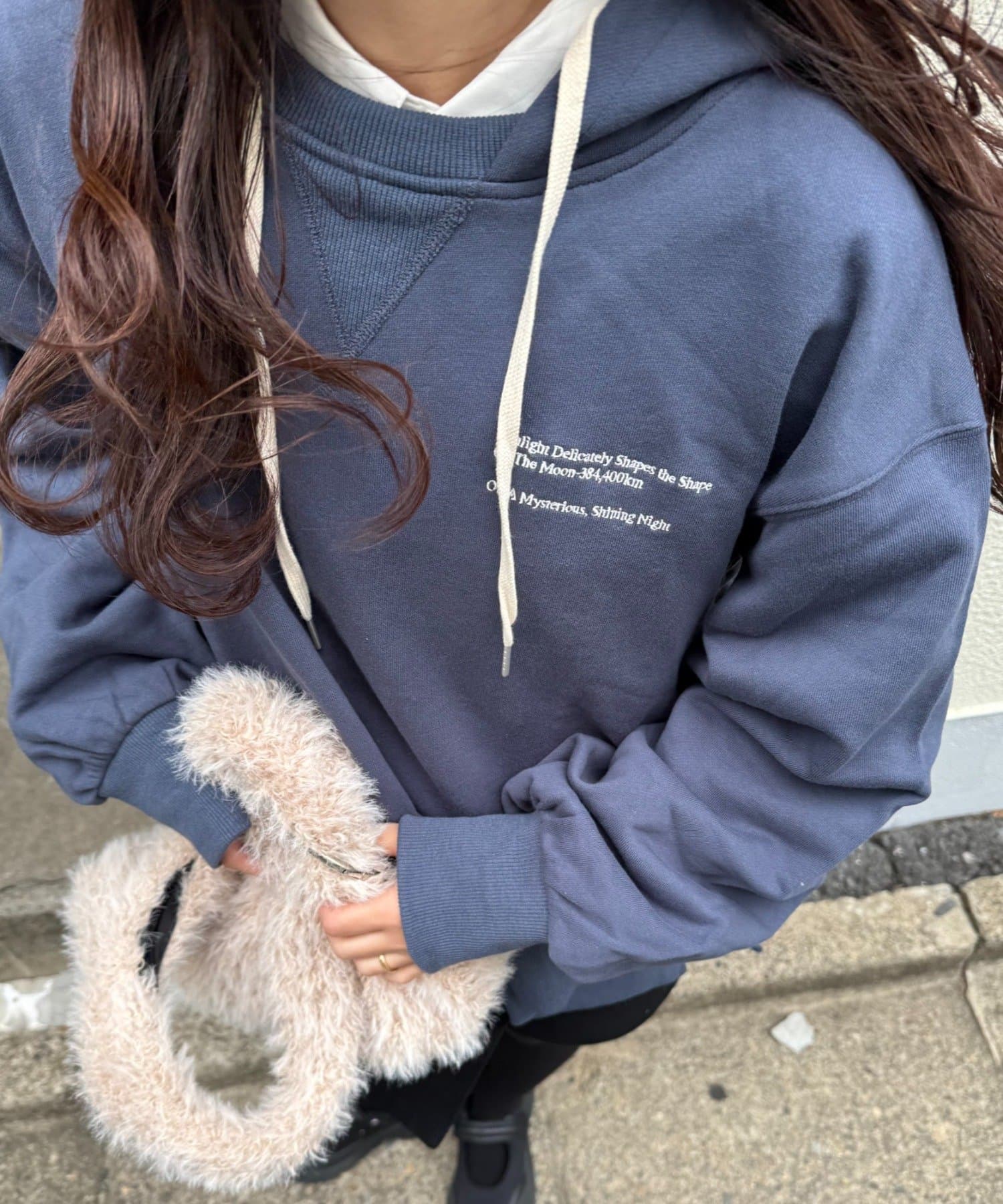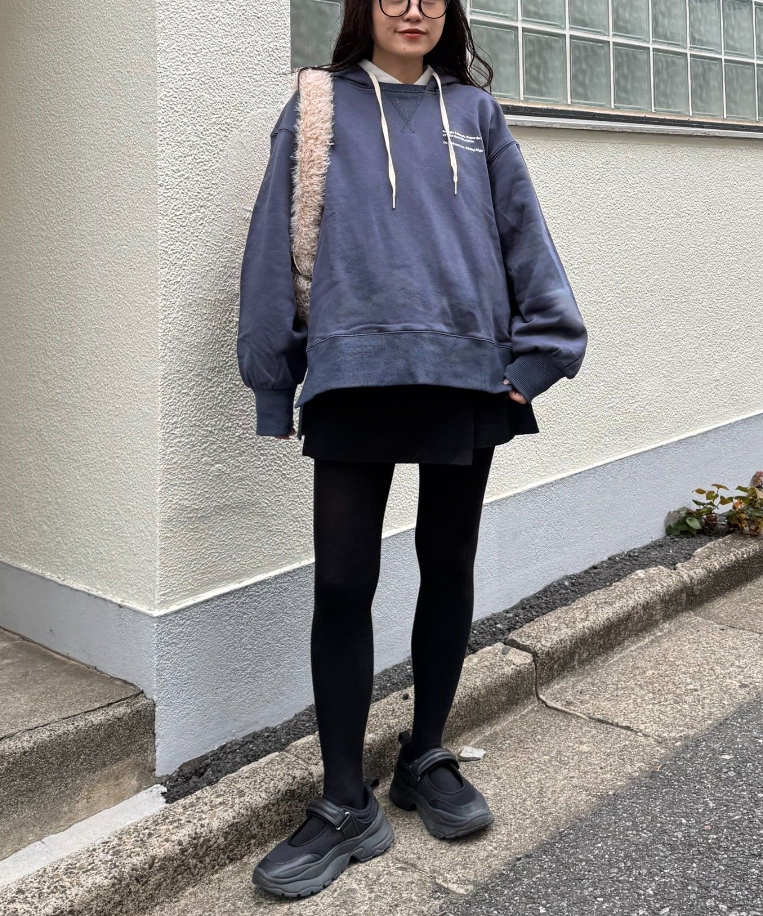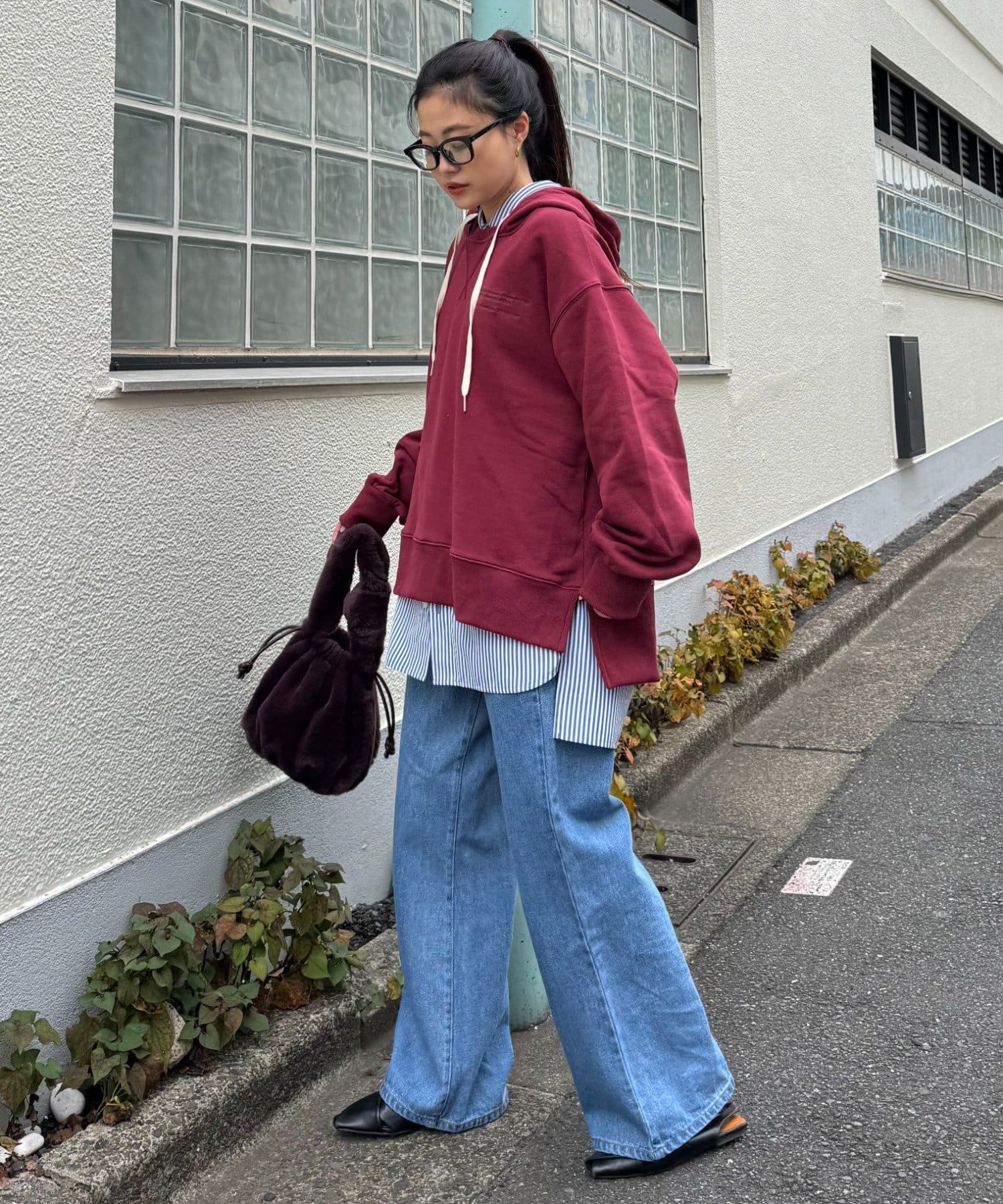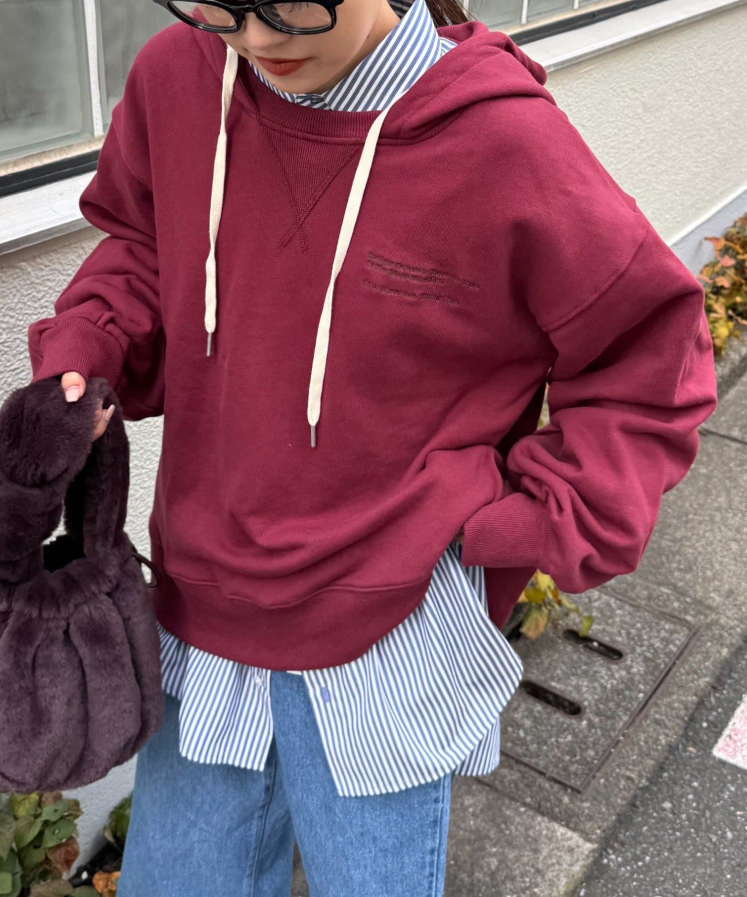 ボリュームのあるスウェットは、ストレートなパンツやスカートを合わせてバランスよく。