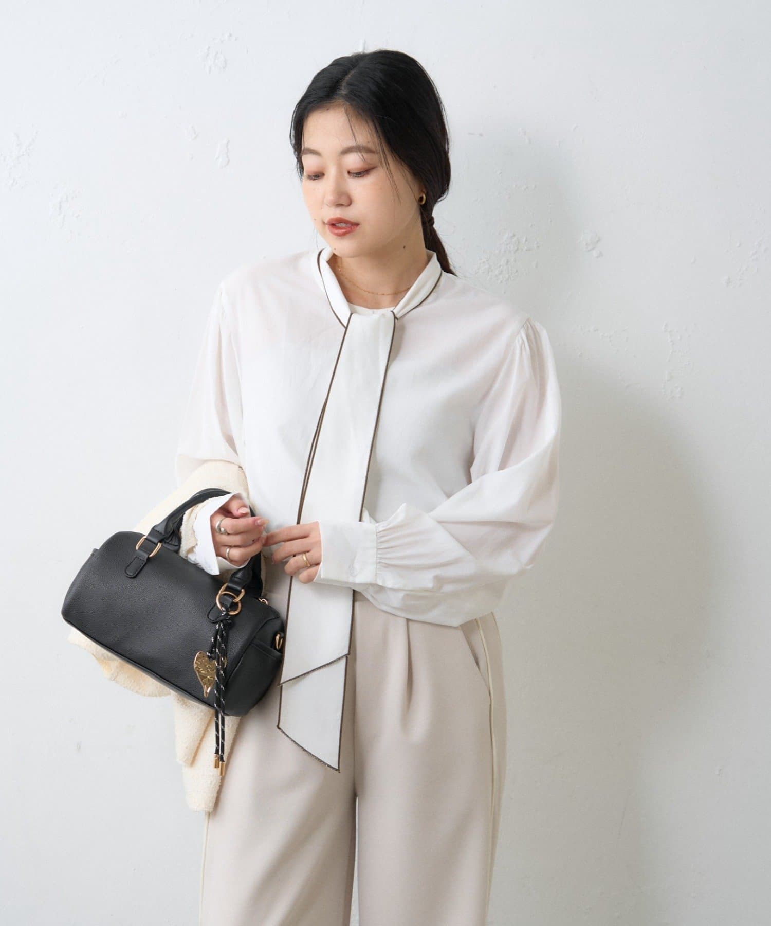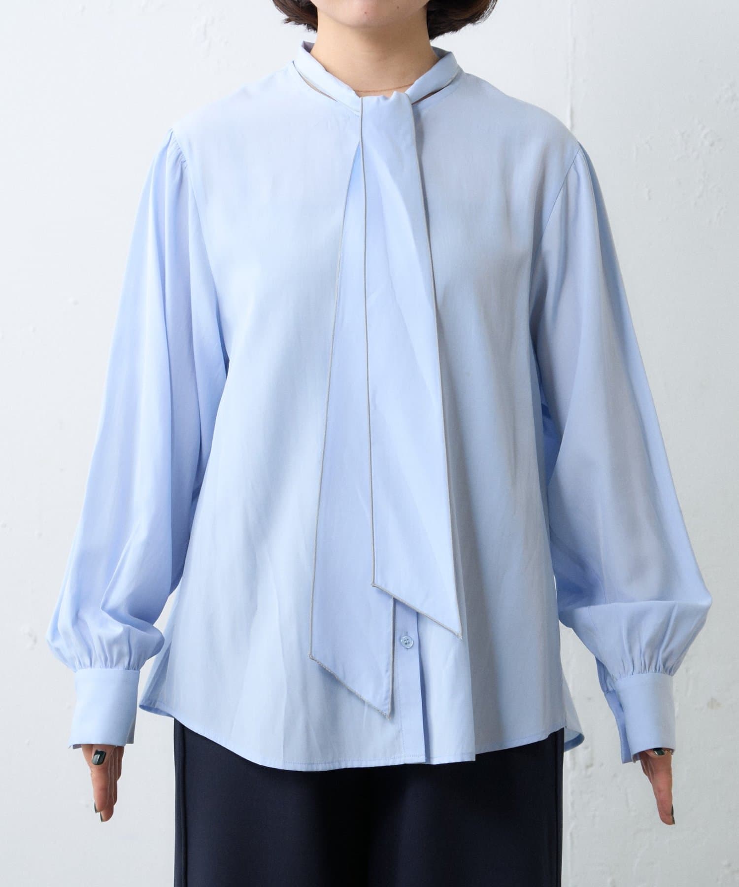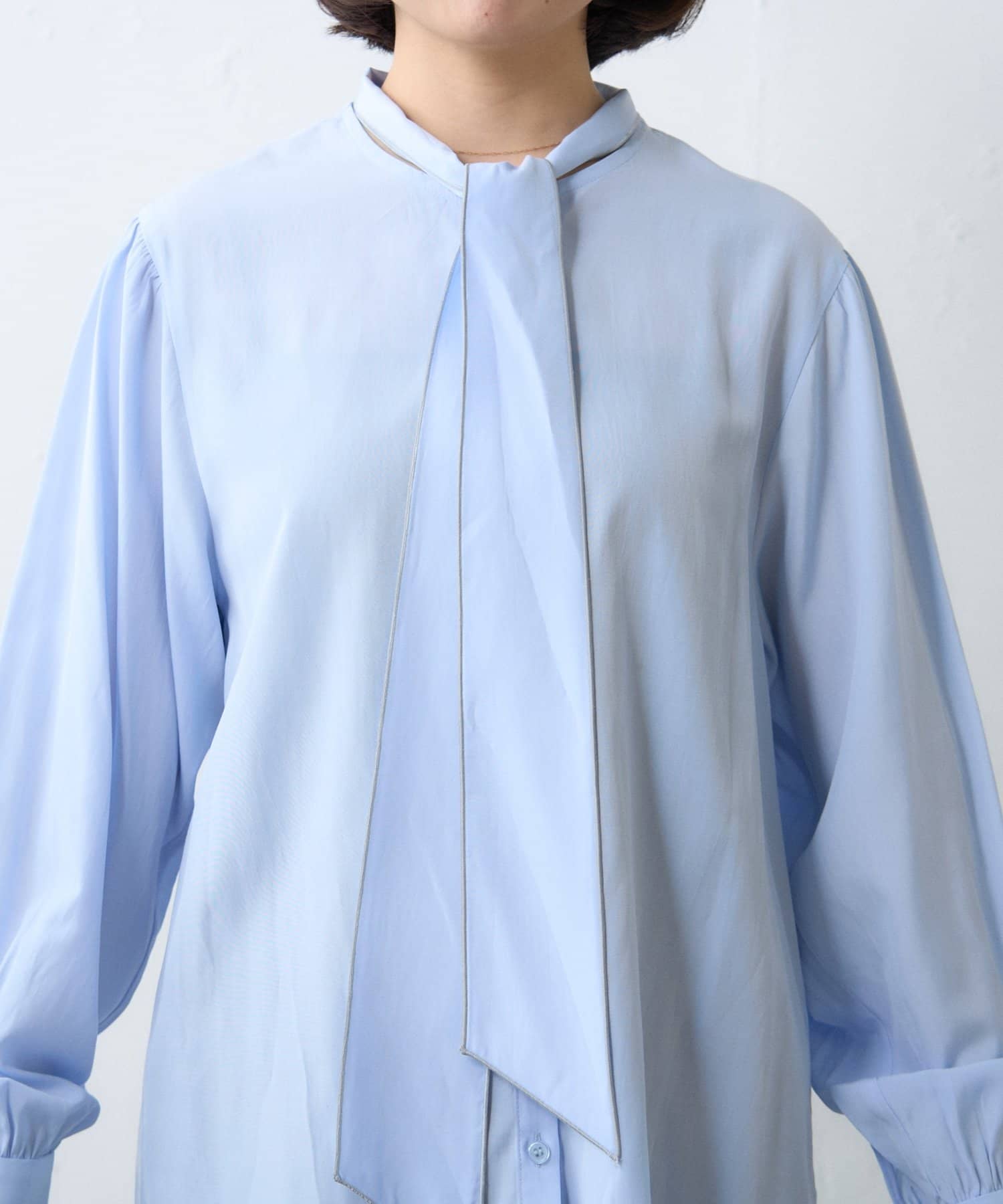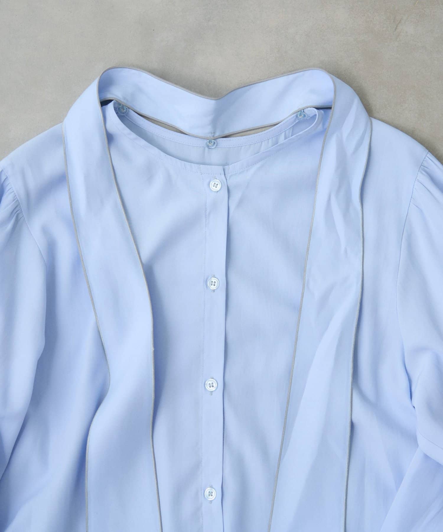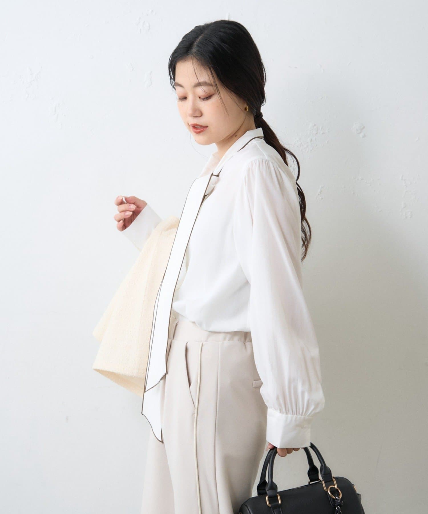 配色パイピングを効かせた、大人のきれいめスタイルにぴったりのボウタイ付きシャツ。