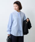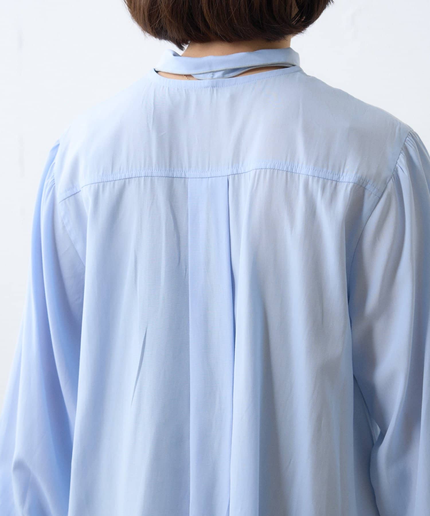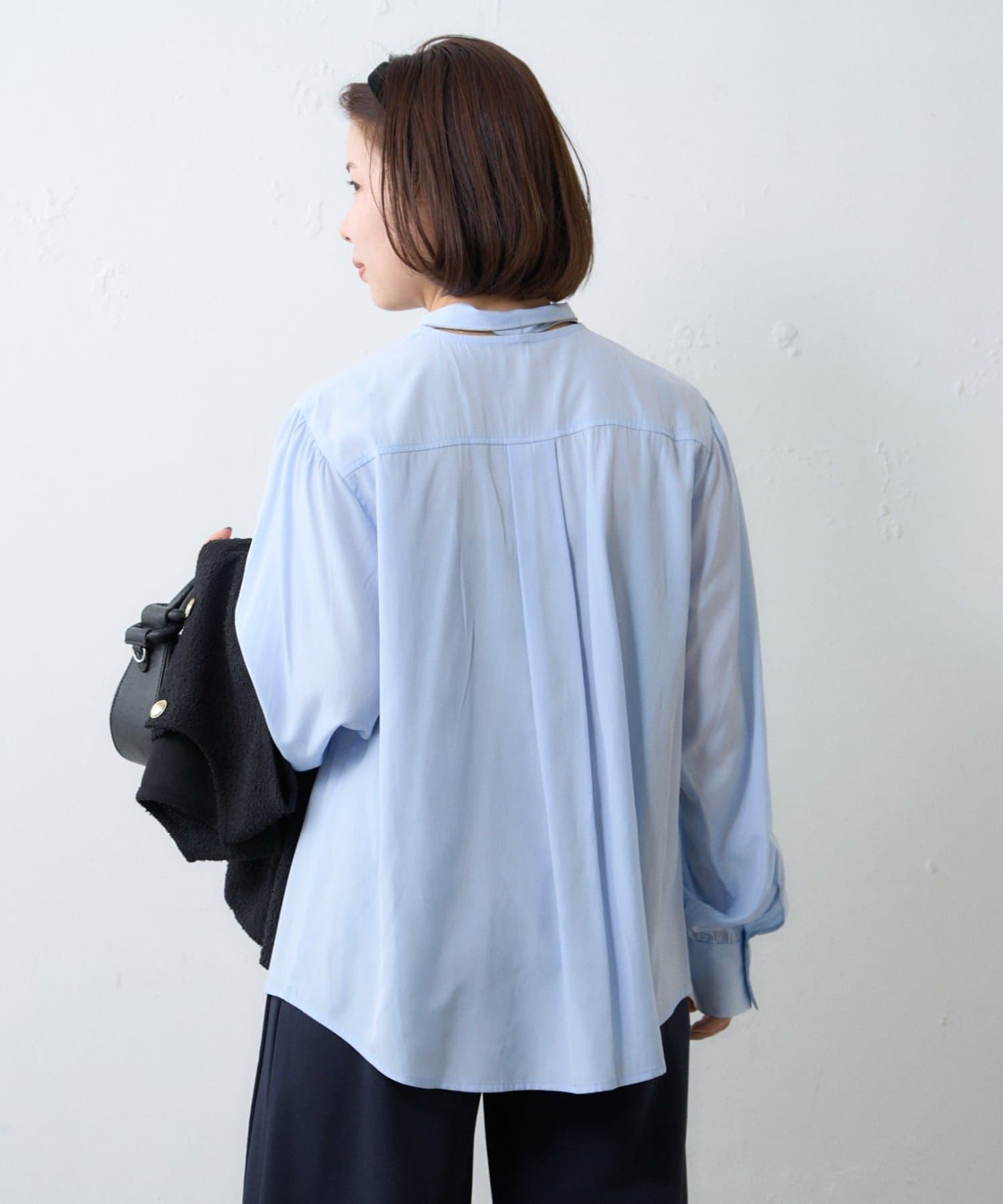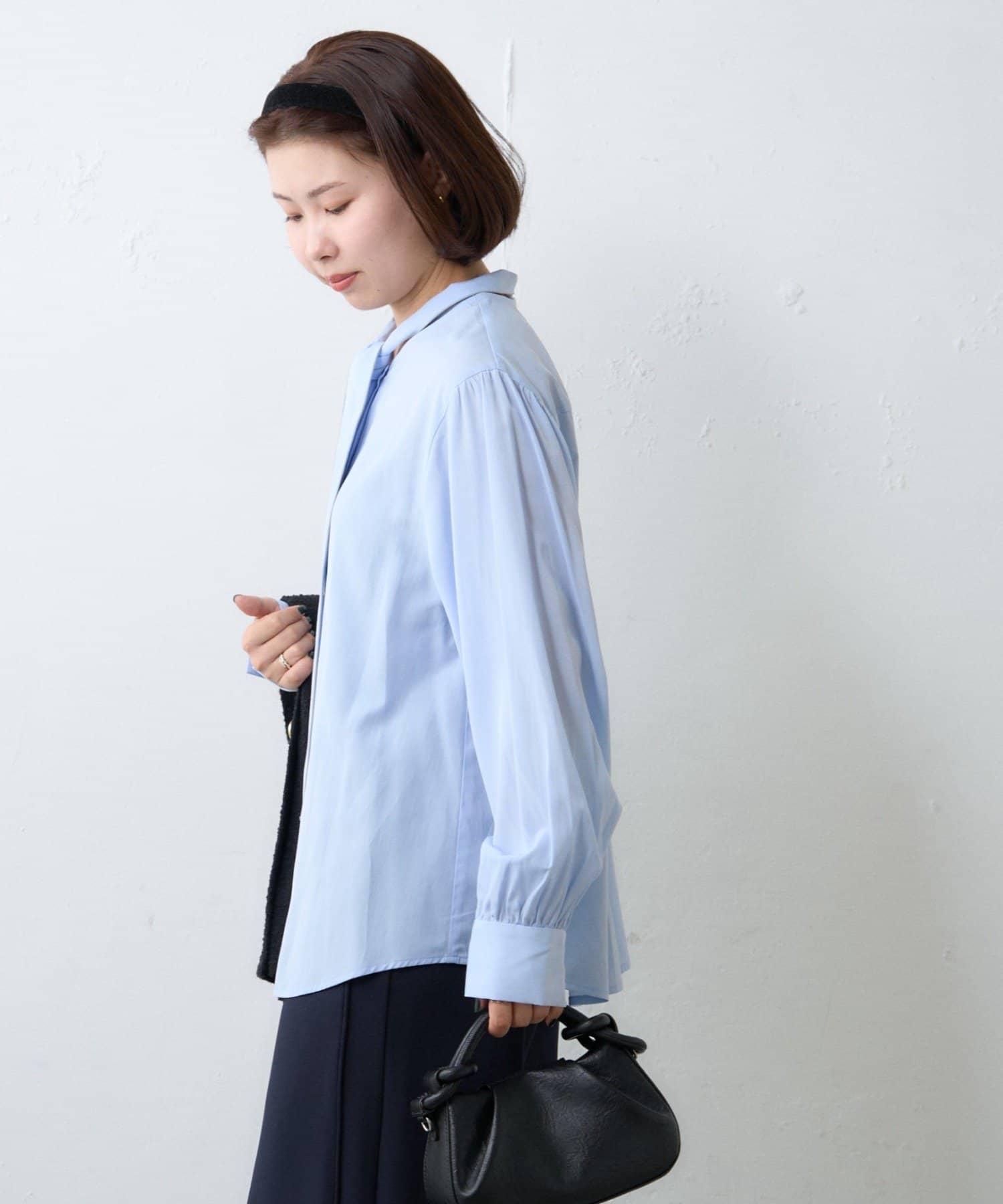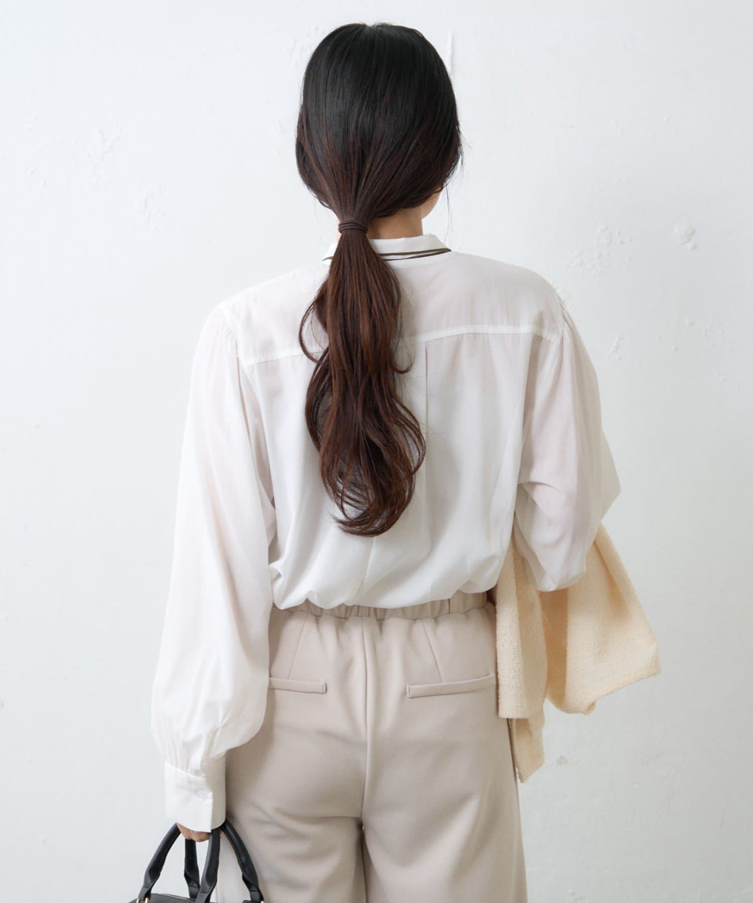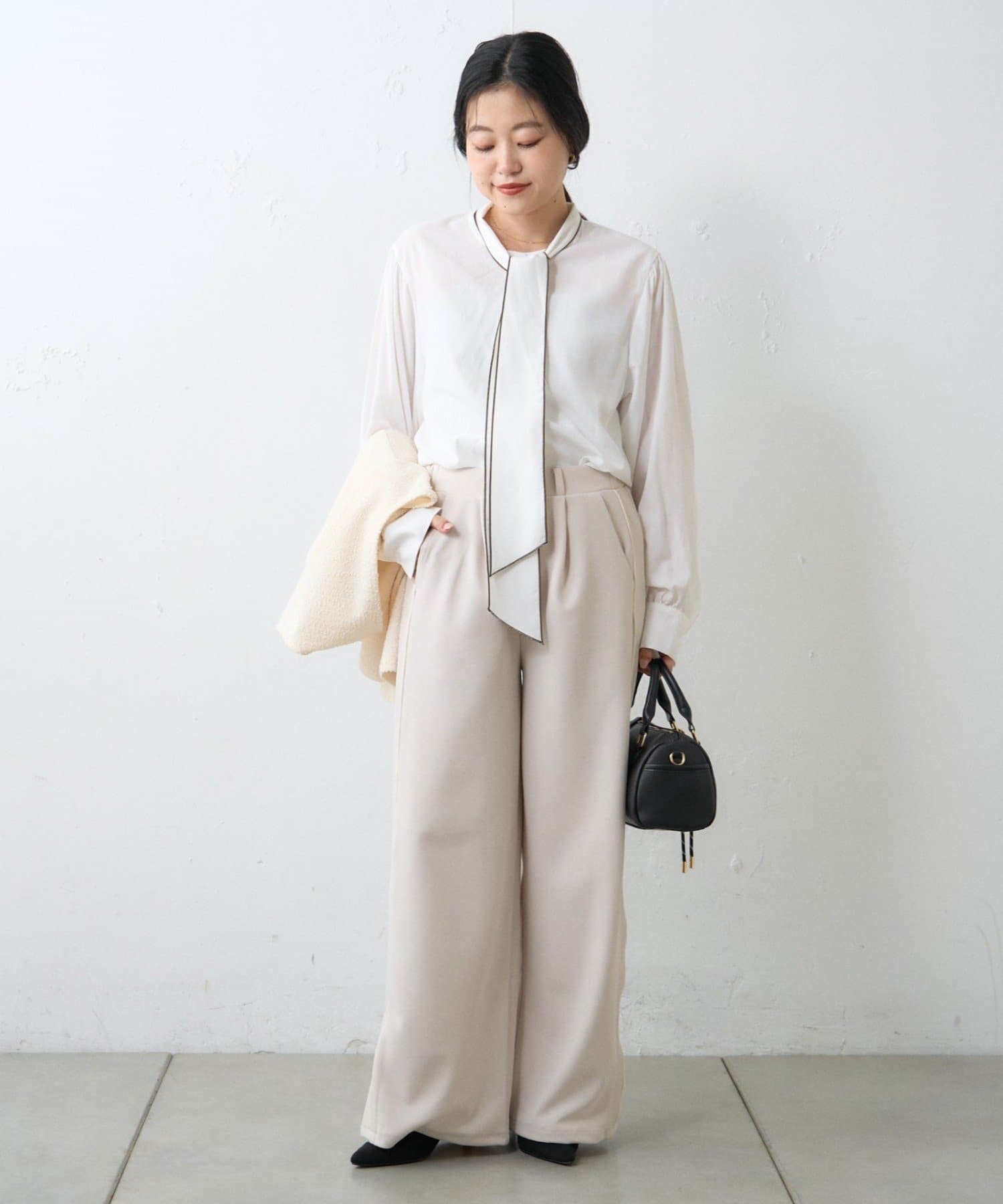 配色パイピングを効かせた、大人のきれいめスタイルにぴったりのボウタイ付きシャツ。