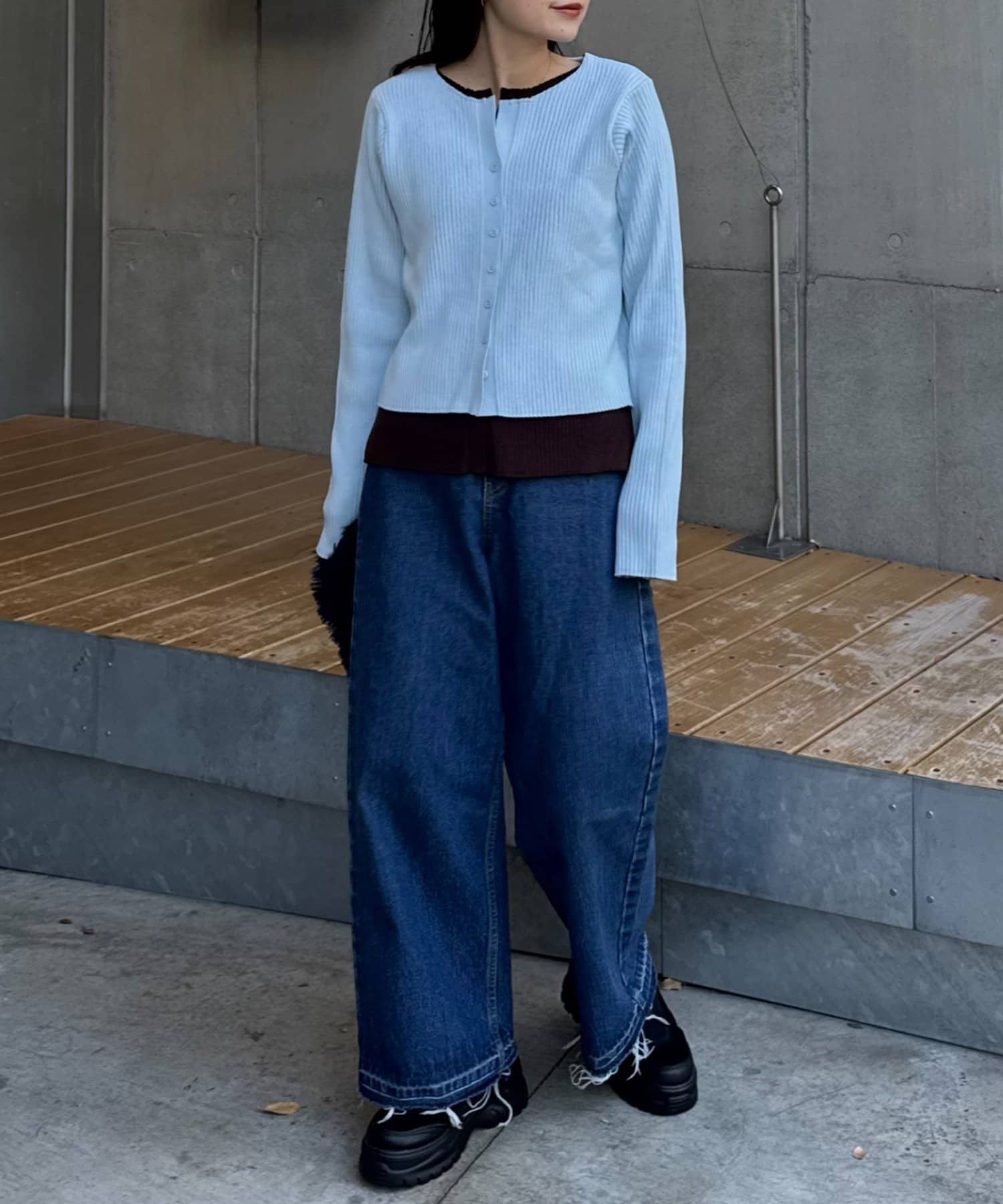 首元と裾からちらりとのぞかせた生地が、コーデにこなれ感をプラス。