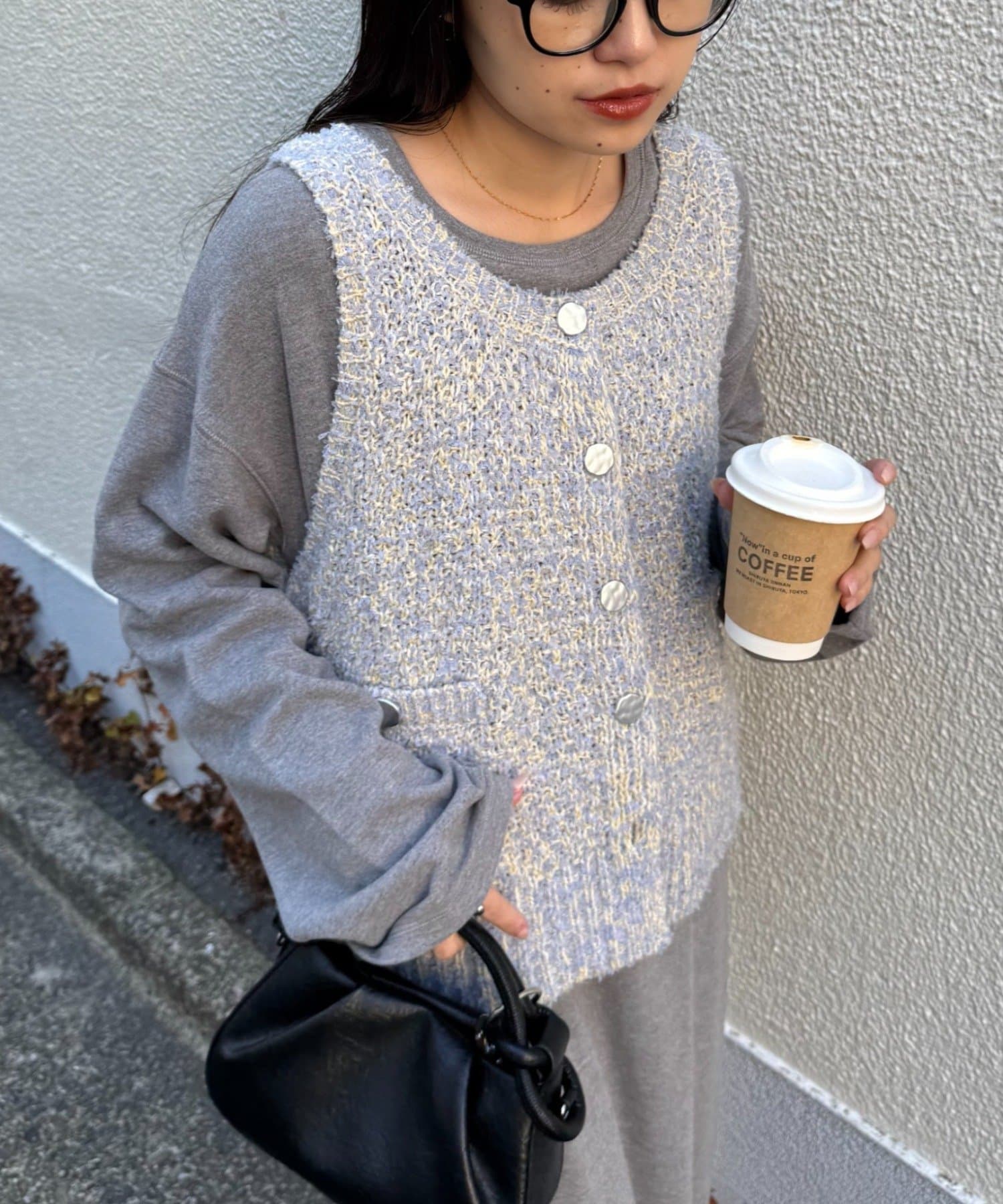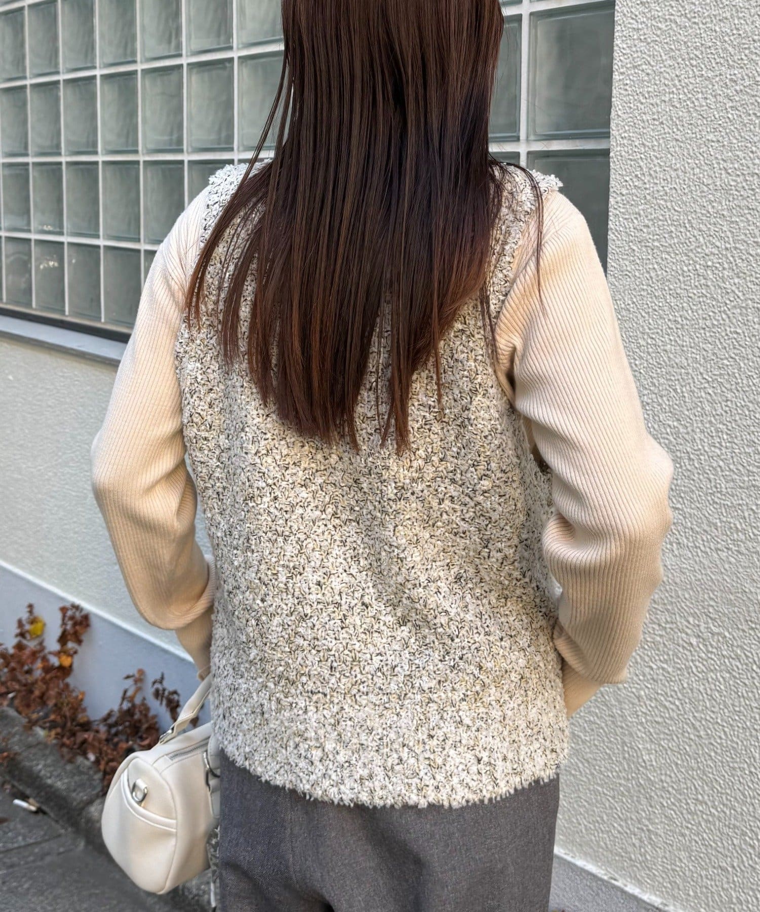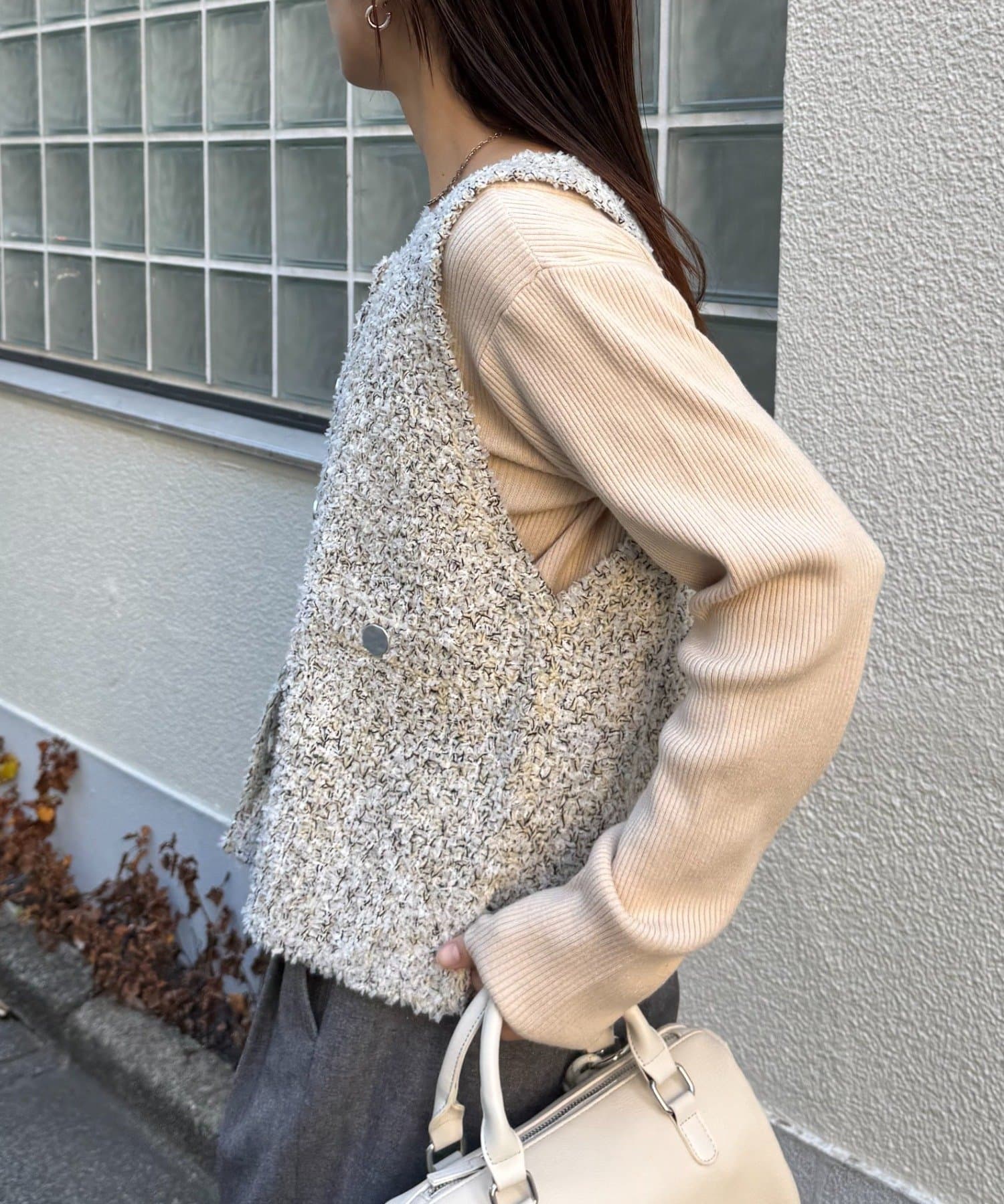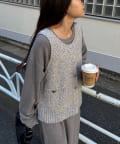 ツイード調に糸をミックスしたニット素材がデザイン映えし、着るだけでお洒落見えするベスト