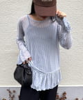 ウエスト部分にはギャザーフリルの切り替えを入れ、ふんわりと広がるシルエットに。気になる腰まわりをさりげなくカバーしつつ、スタイルアップも叶えてくれます。裾先は幅広めのフリルに切り替え、動くたびに揺れる女性らしいデザインに仕上げました。裾と袖口はメロウ仕上げで軽さを出し、重ね着してももたつかない着心地。デニムやスラックスなど、合わせるボトムを選ばず、デイリーからお出かけまで幅広く活躍します。