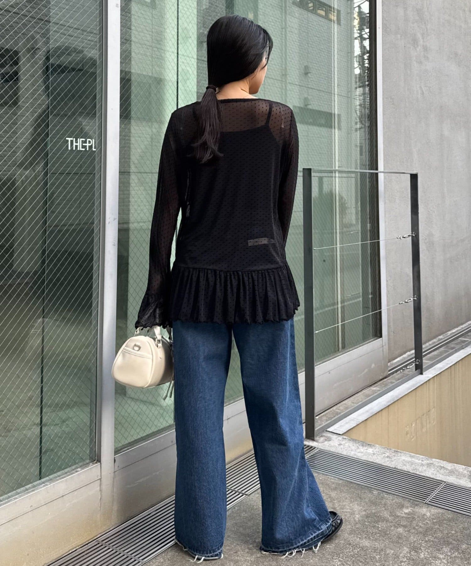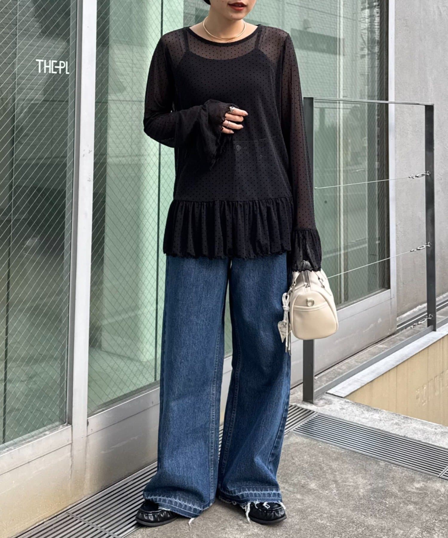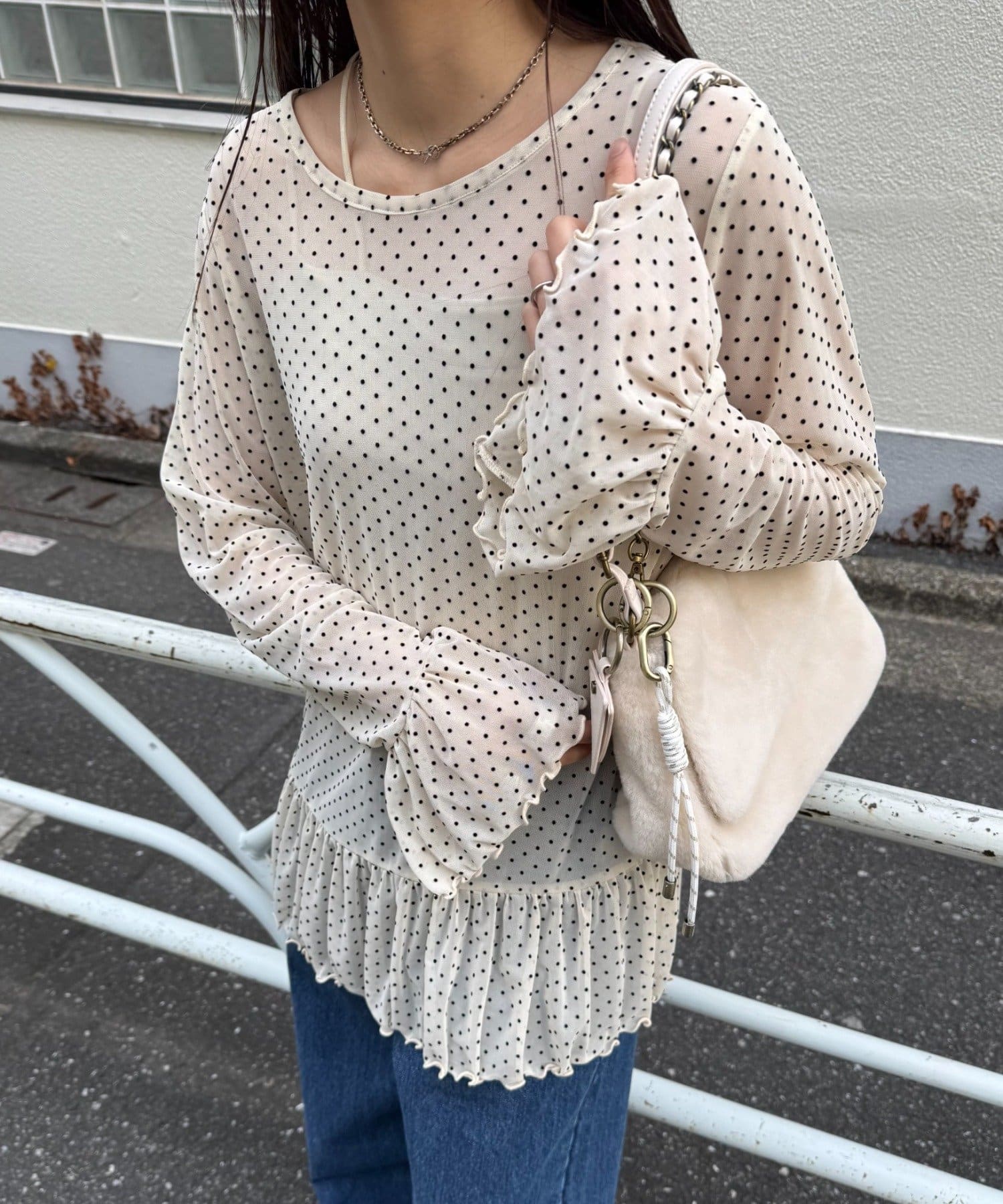 透け感のある生地に立体的なドット柄が映え、シンプルなコーディネートにも自然と華やぎをプラスします。