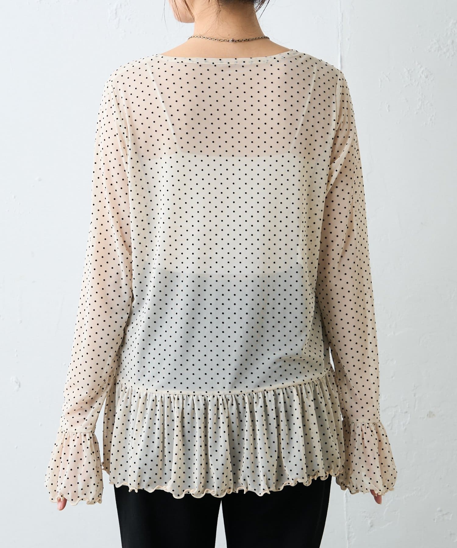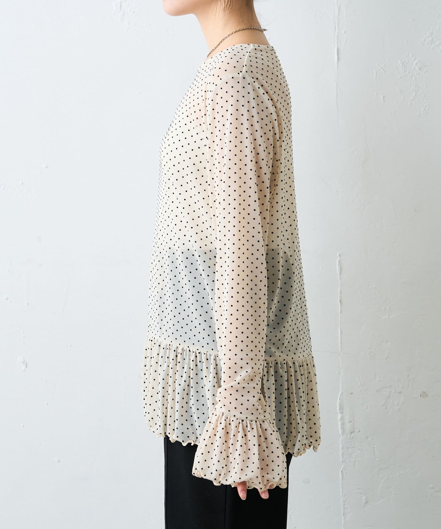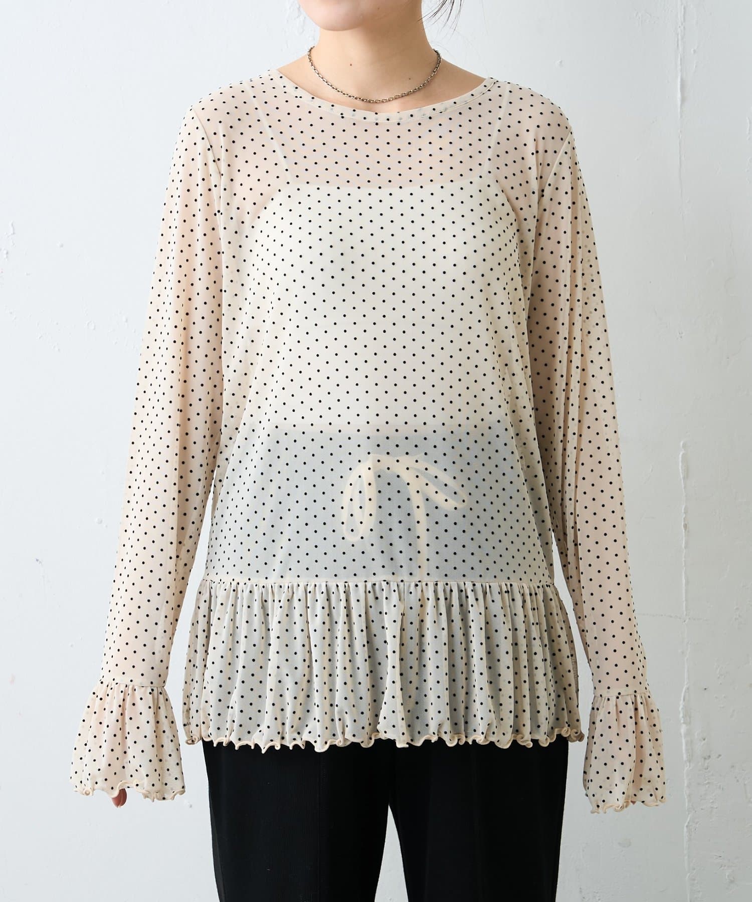 繊細なチュール素材にフロッキードットをあしらい、軽やかさの中に程よい存在感を持たせたトップスです。