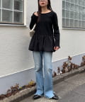 ウエストで切り替えを入れ、まるでバルーンスカートをドッキングしたような立体感のあるシルエットが特徴のトップスです。