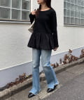 細身のデニムやスラックスと合わせると、裾のバルーンシルエットが引き立ち、