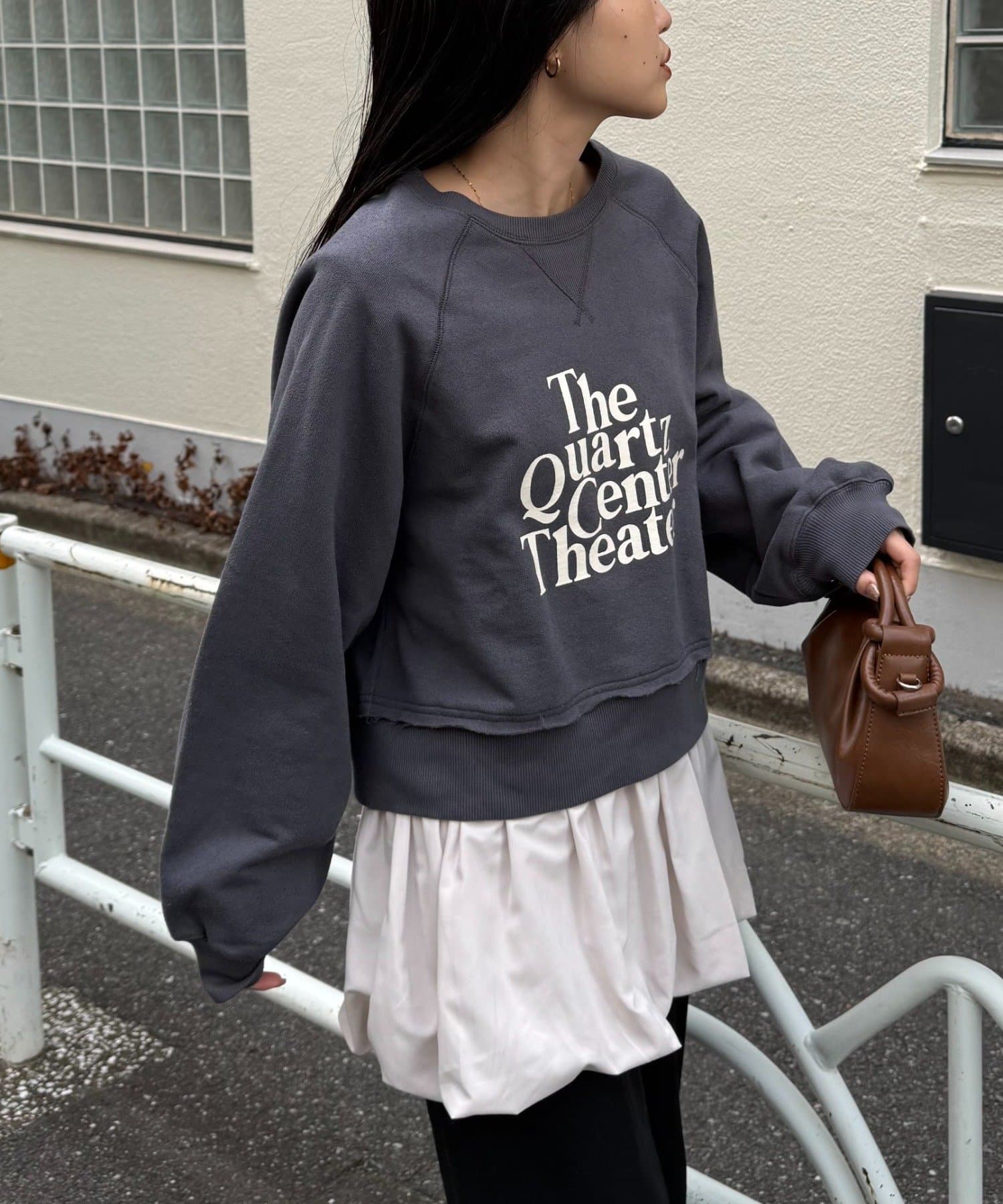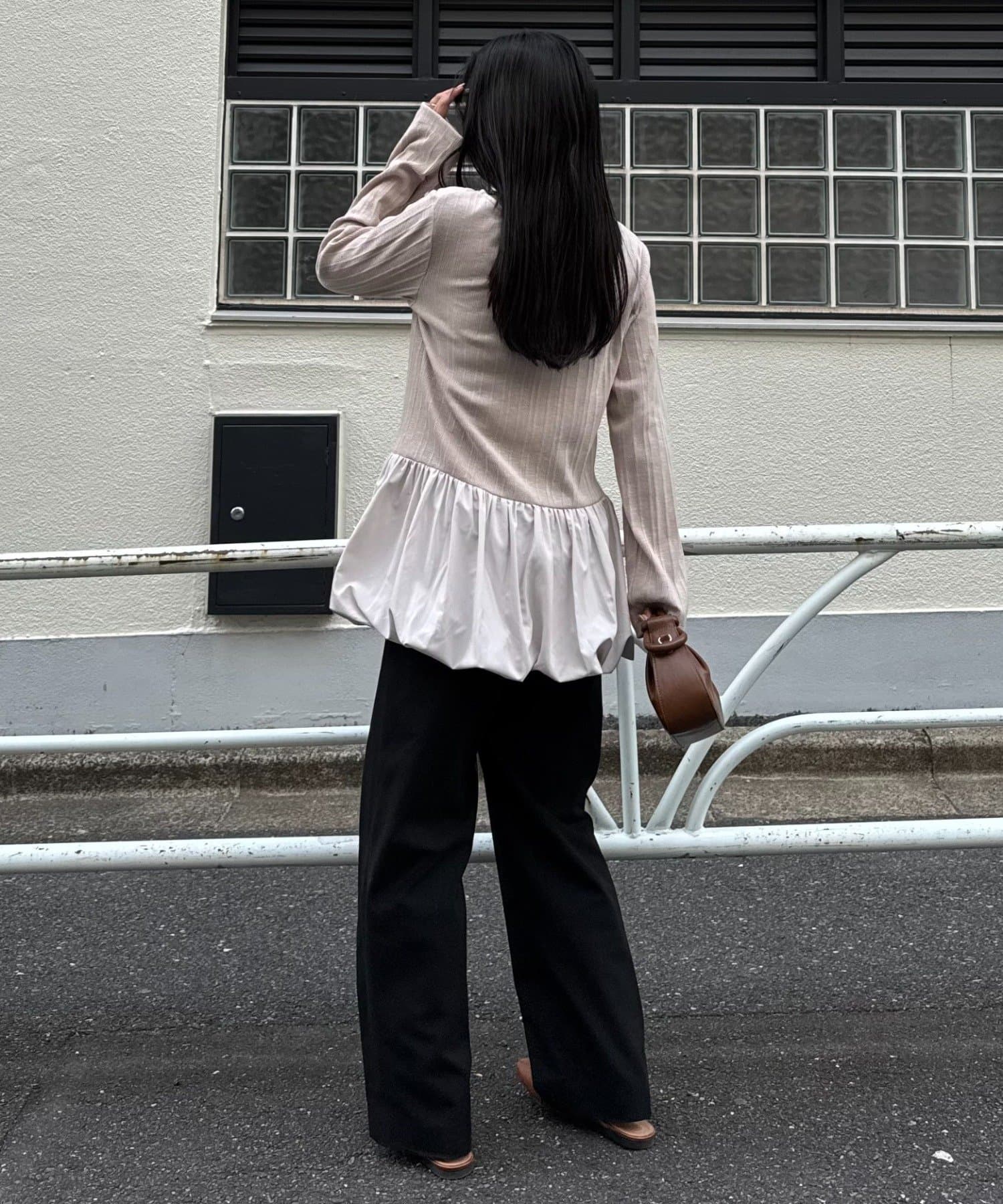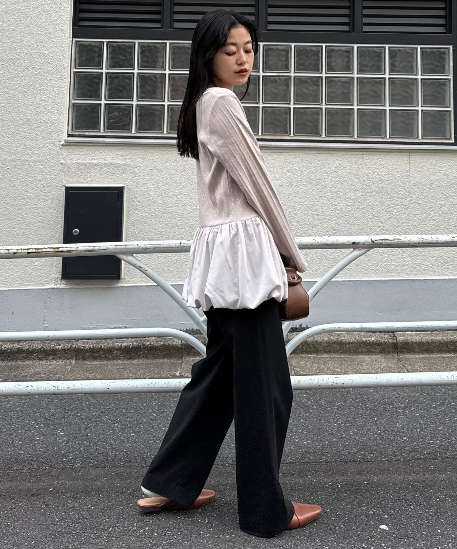 細身のデニムやスラックスと合わせると、裾のバルーンシルエットが引き立ち、