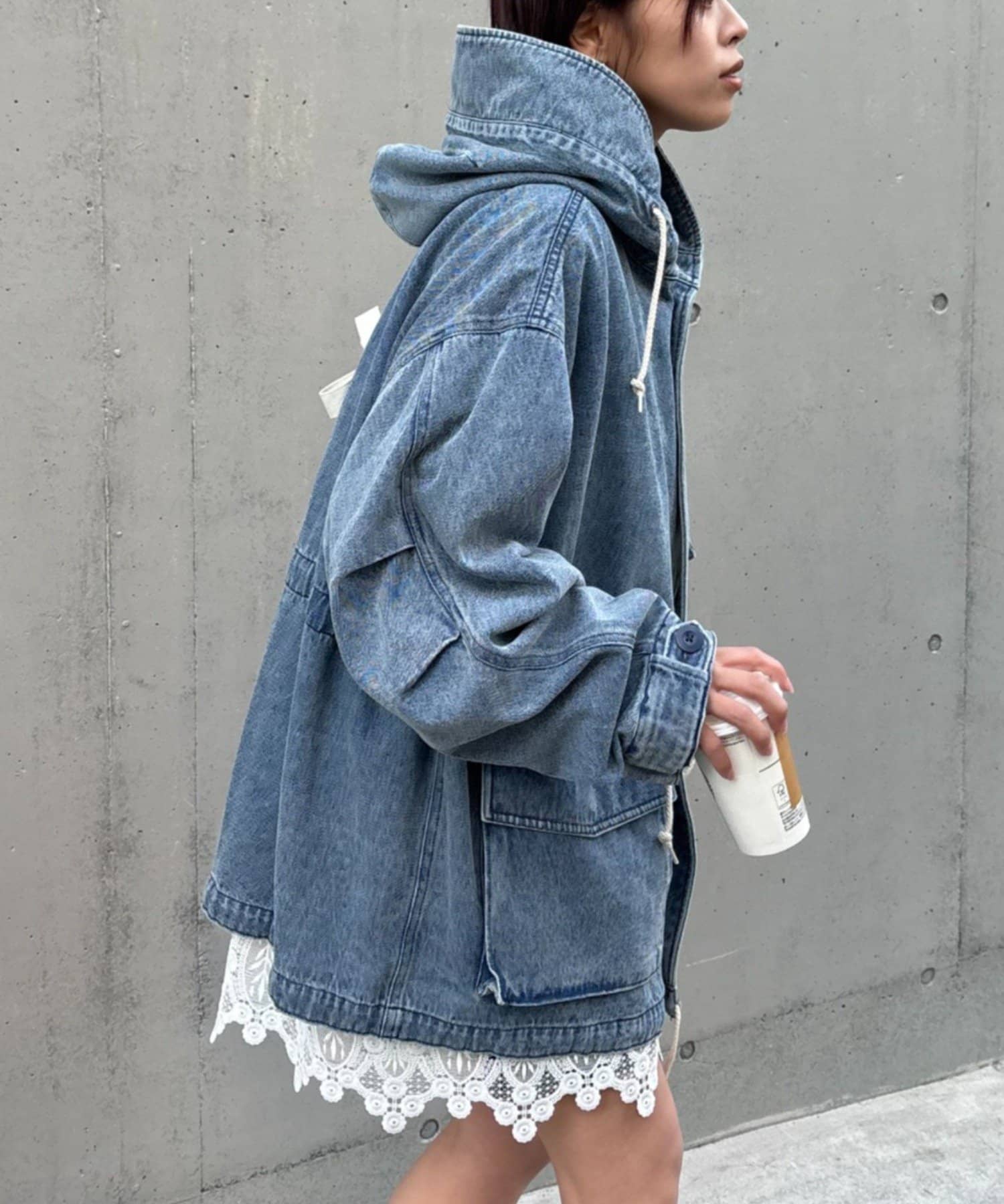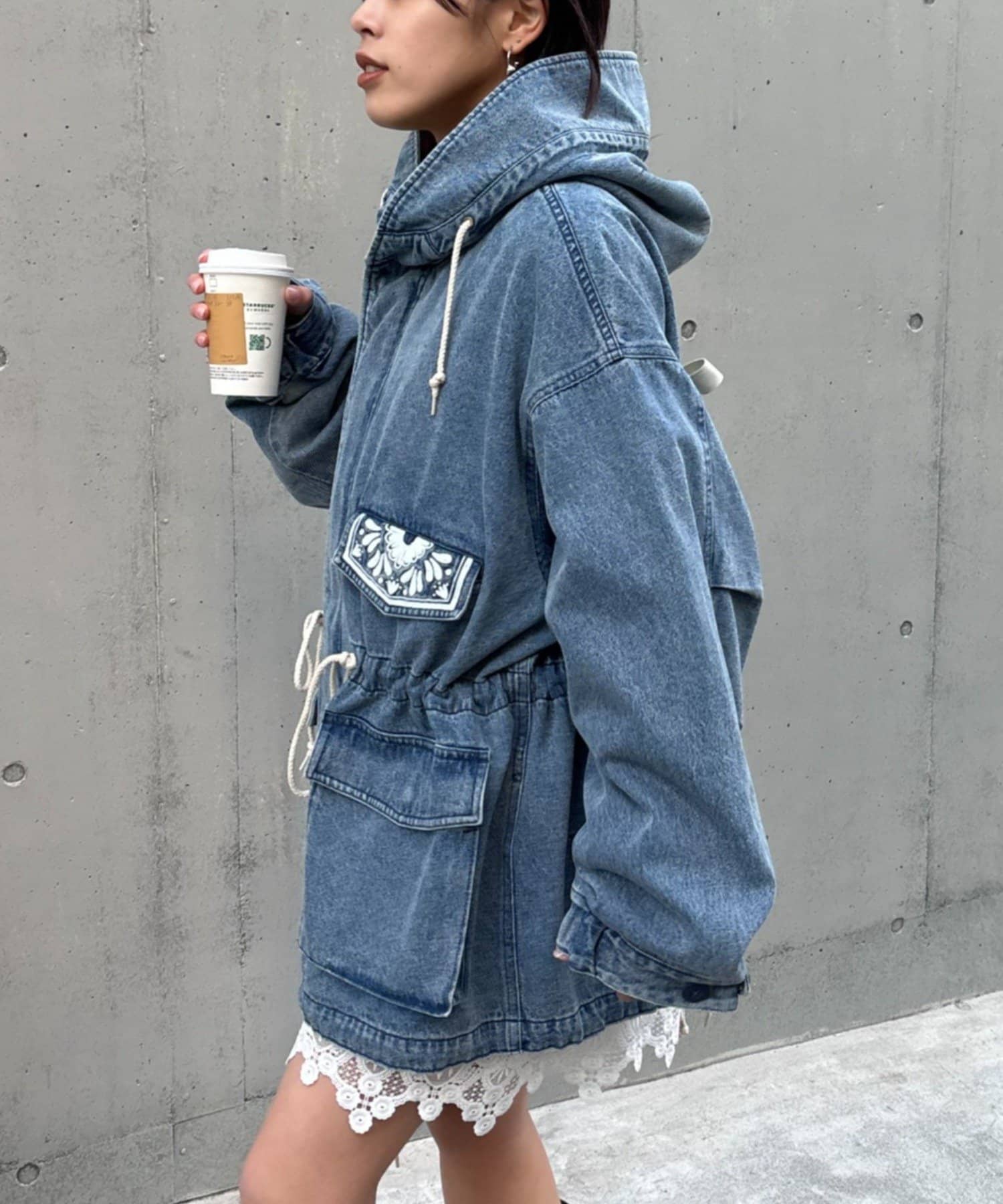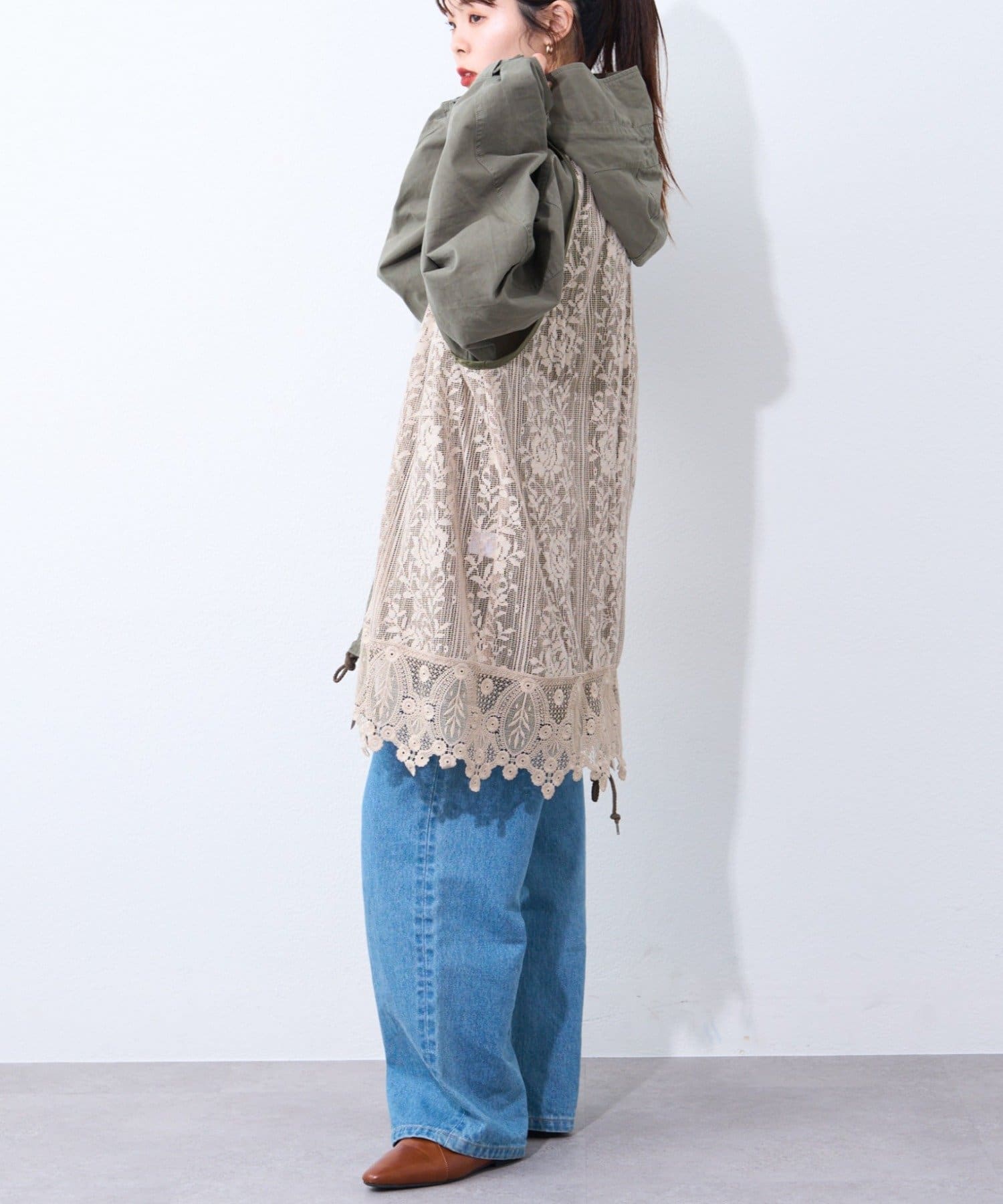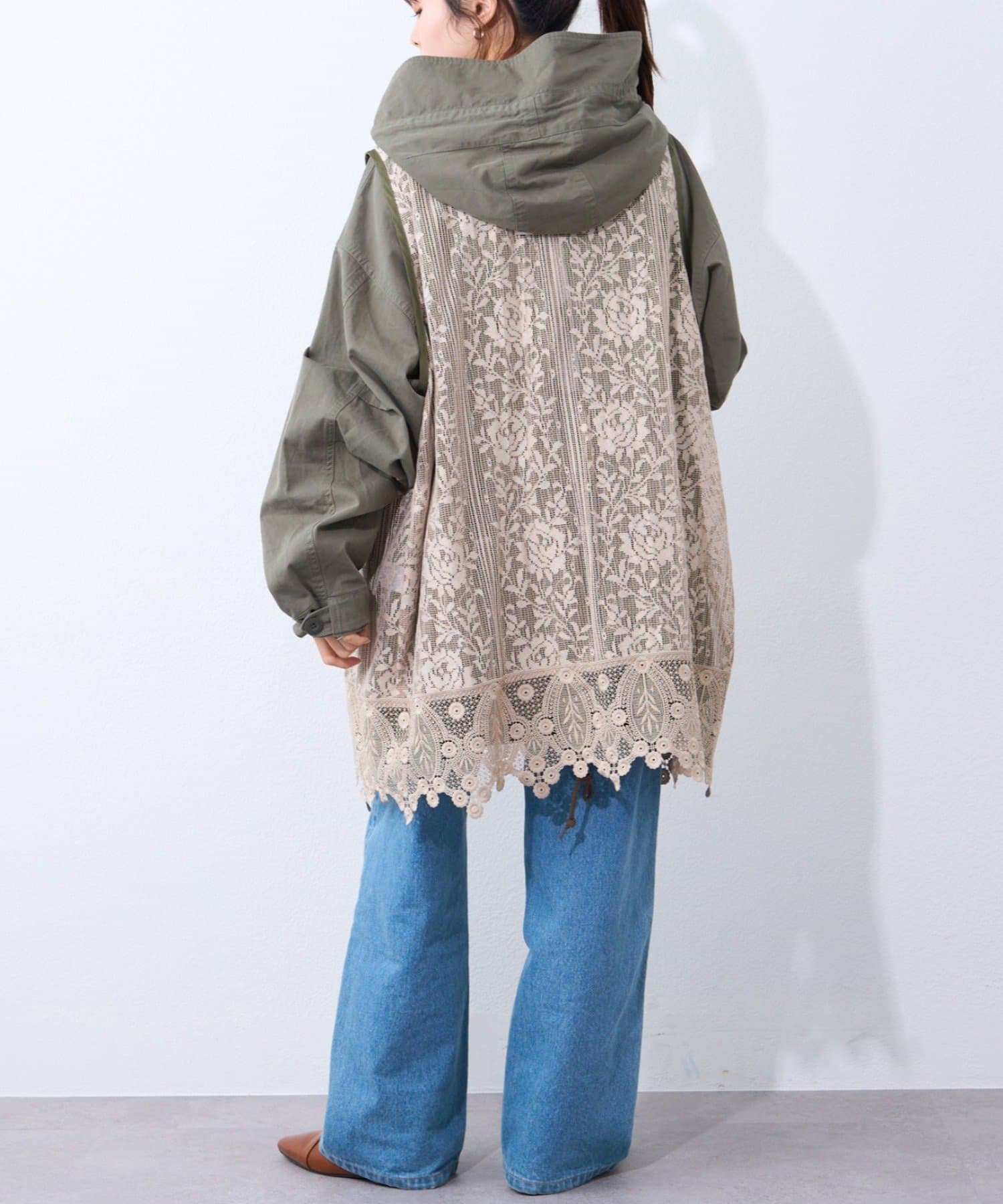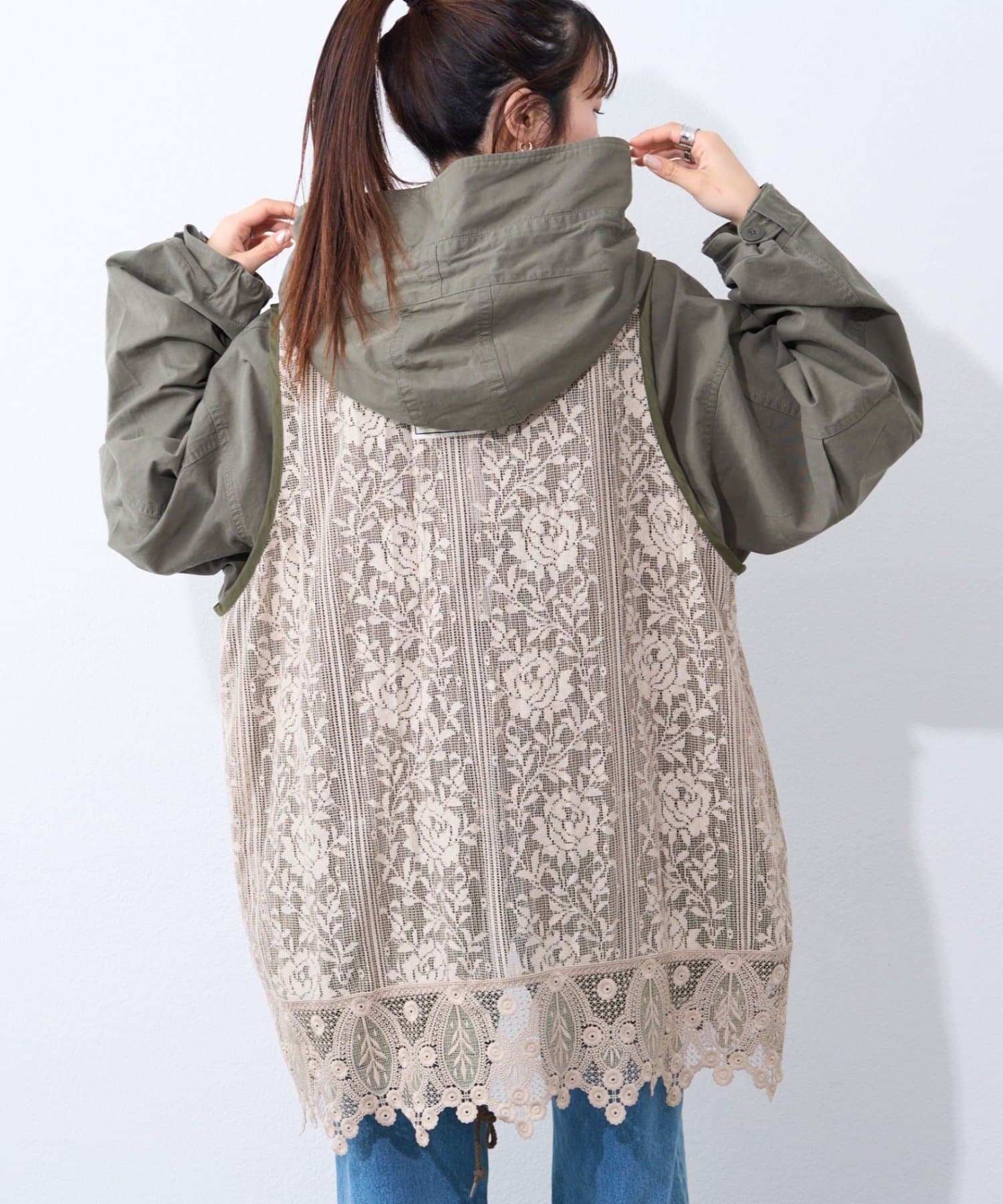 レースの部分使いが特徴的なモッズコート。