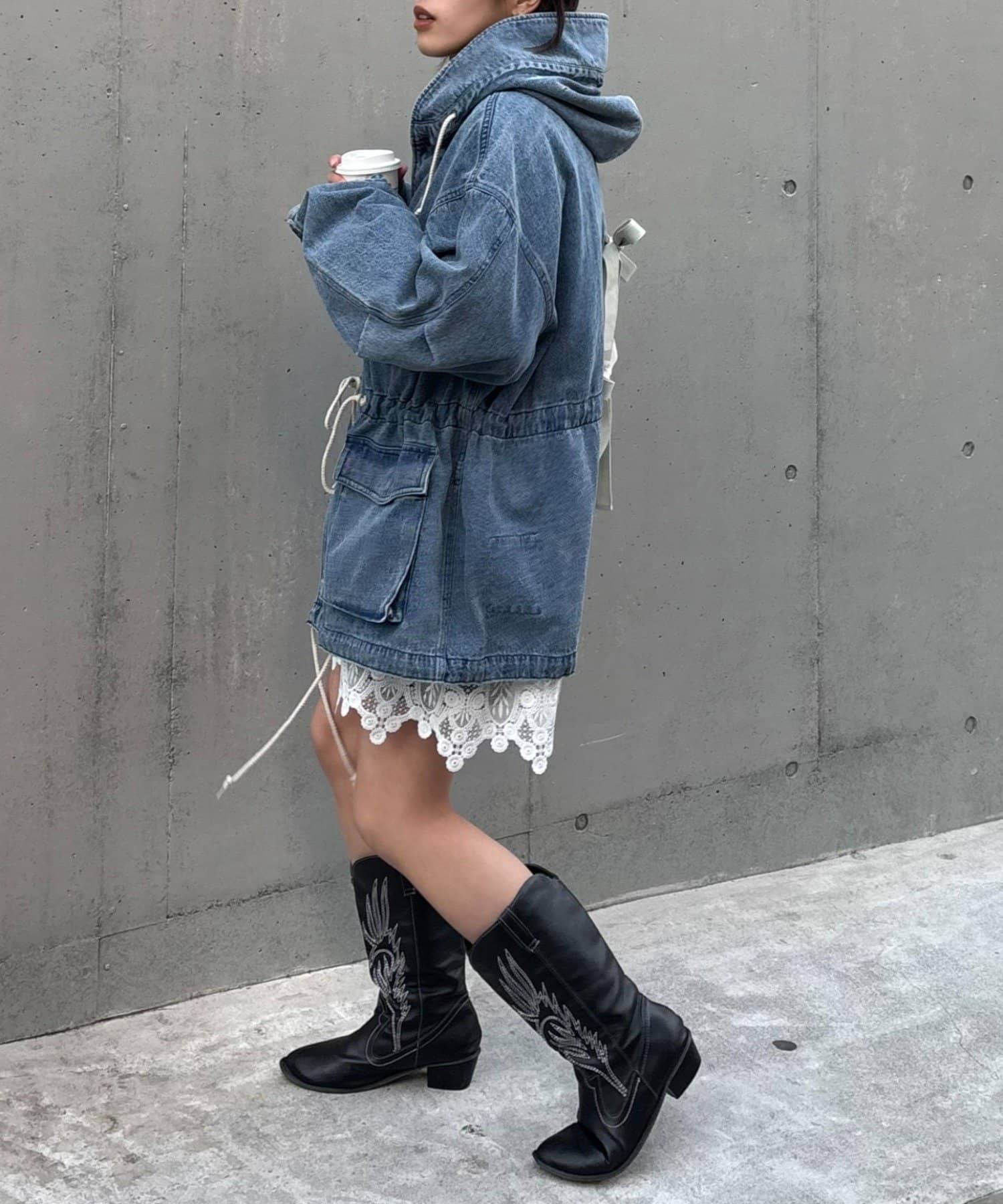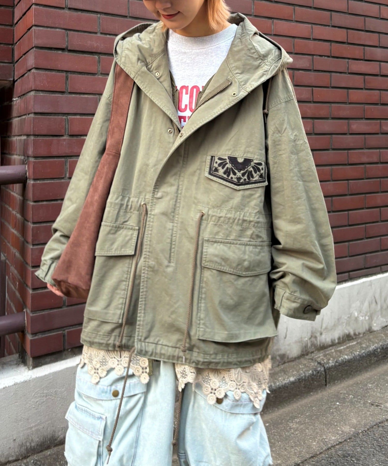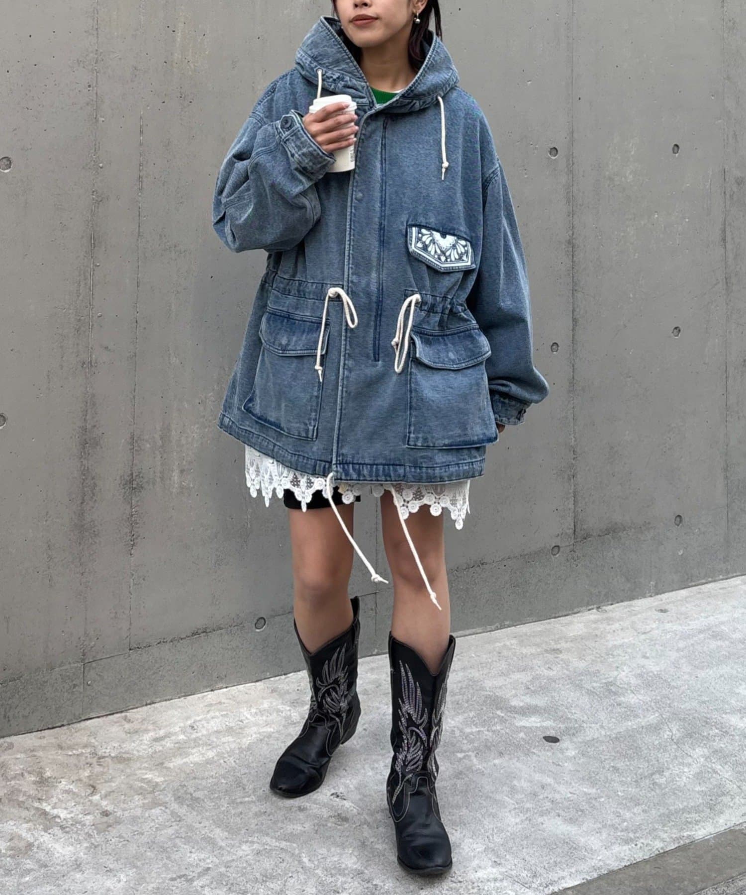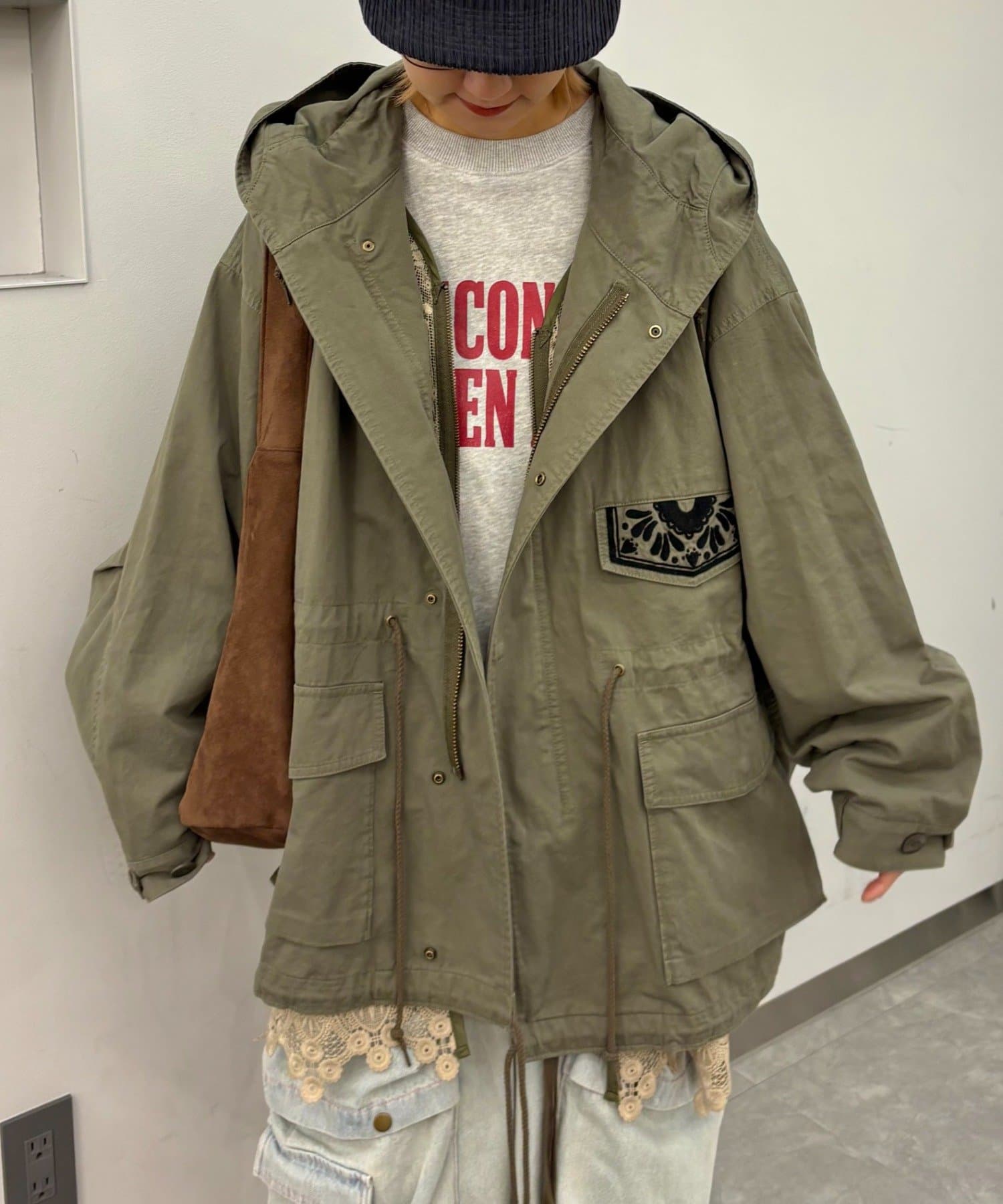 レースの部分使いが特徴的なモッズコート。