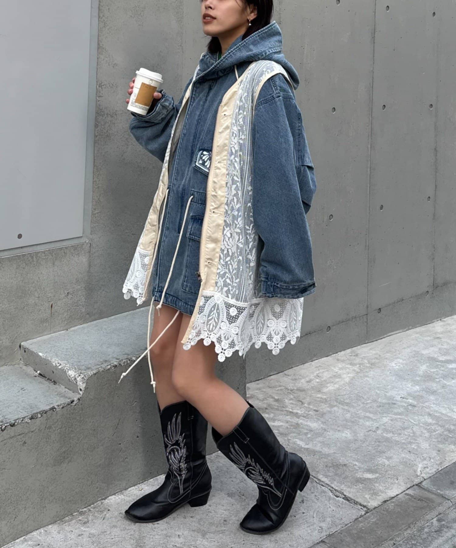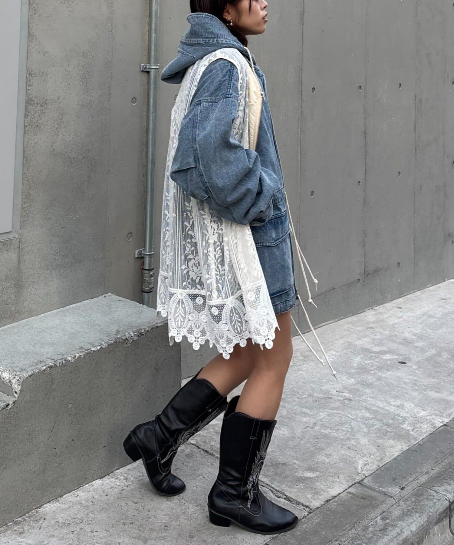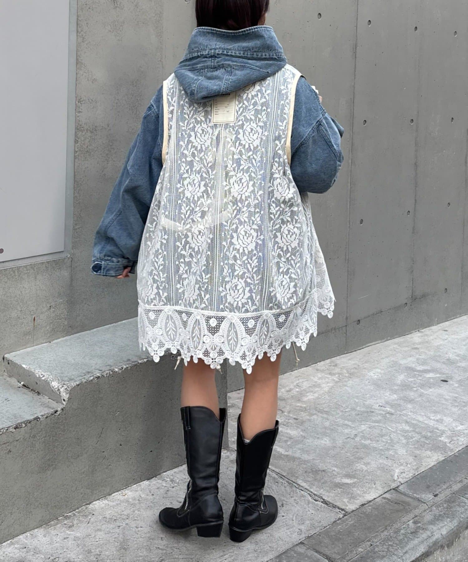 レースベストをインナーにして、裾からチラ見せしてもよし、アウターの上から羽織るレイヤードスタイルも◎