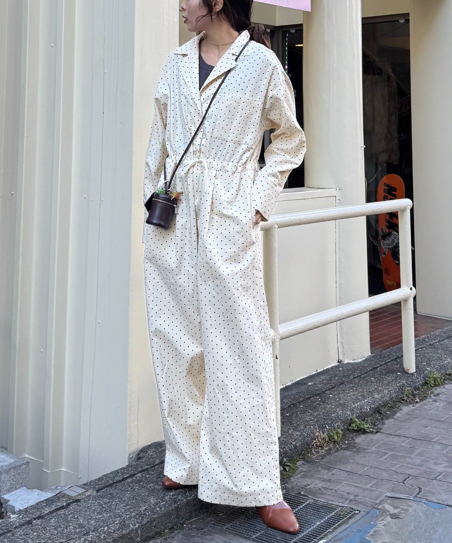 ドット・ストライプのアソート生地が目を惹く、WILLOWらしい存在感のあるオールインワン。